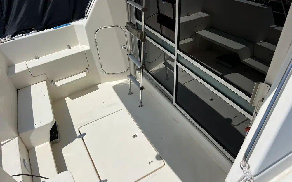 L'ensemble de la coque et des superstructure ne fait pas apparaître de remarque particulière. Le gelcoat présente quelques légères traces de faïençage de surface sur les parties les plus fines autrement après un polissage/ lustrage le bateau retrouvera un bel aspect brillant.