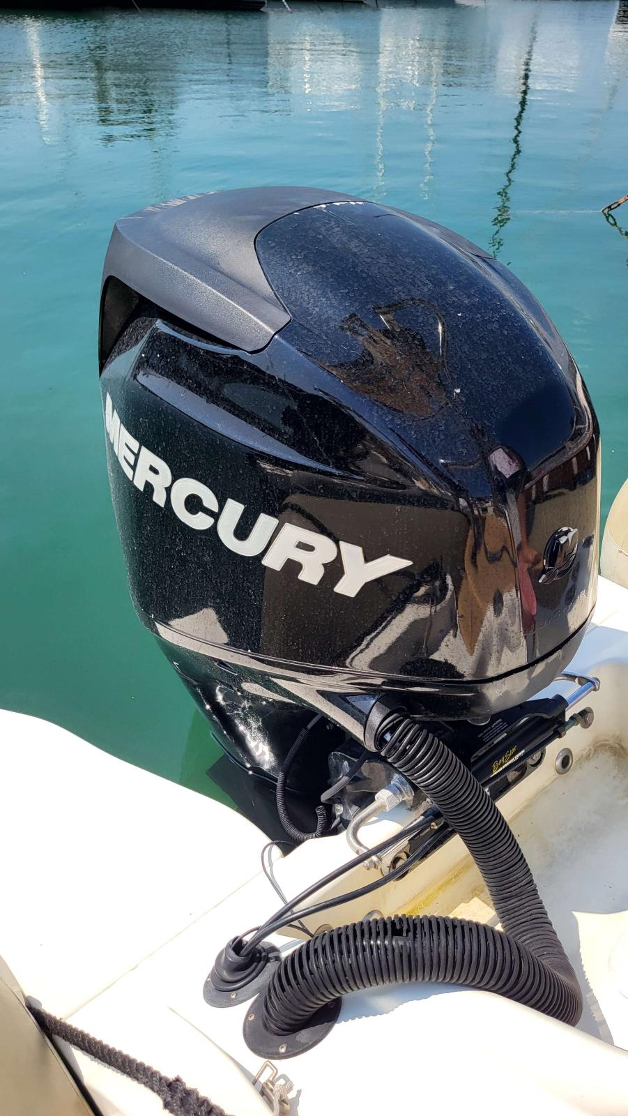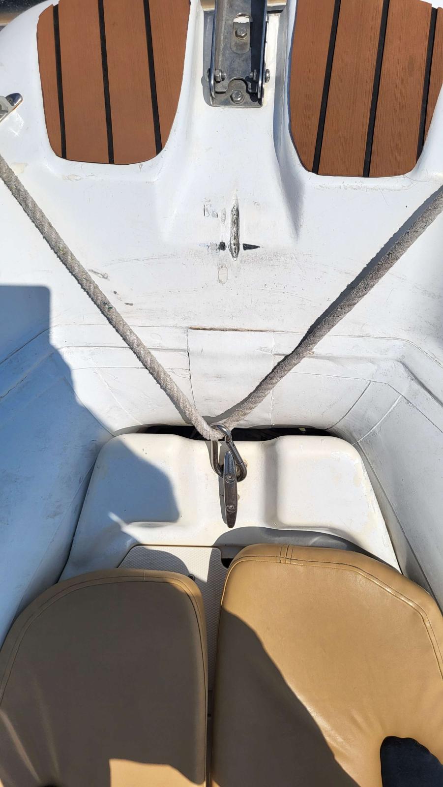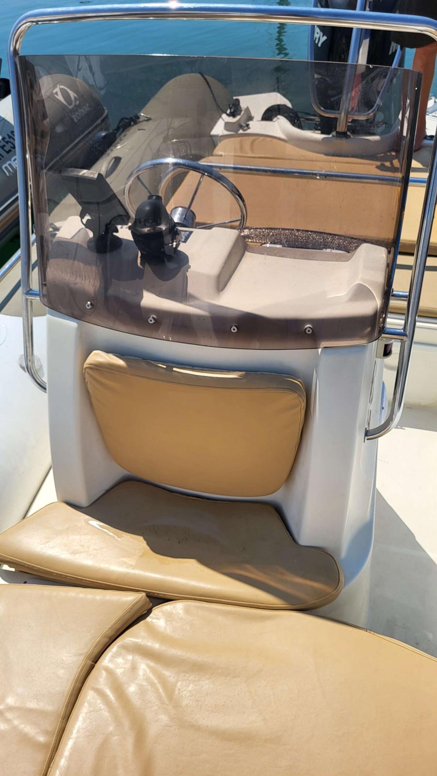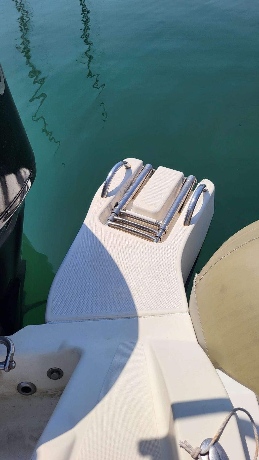 Équipements : Console centrale avec pare-brise, Bain de soleil avant et arrière, Sellerie complète en bon état, Echelle de bain, Douchette de pont, Réservoir intégré, Taud de soleil (bimini)