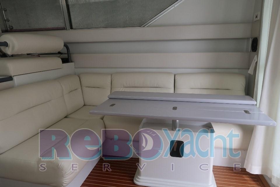 Intérieur refitting 2016, ciel, canapés en cuir beige, plancher en teck