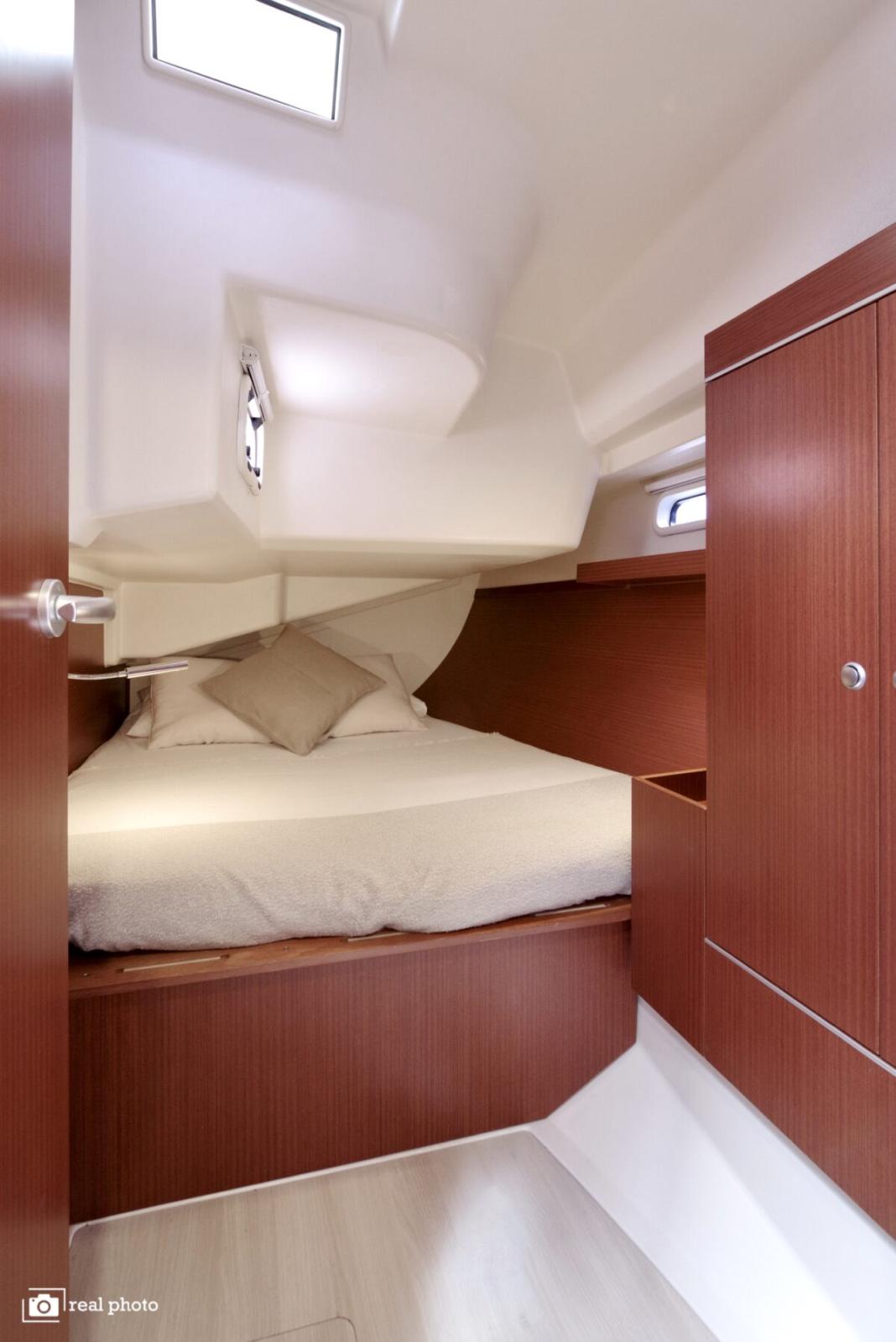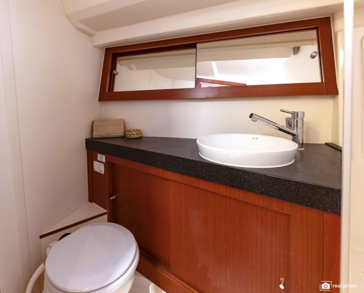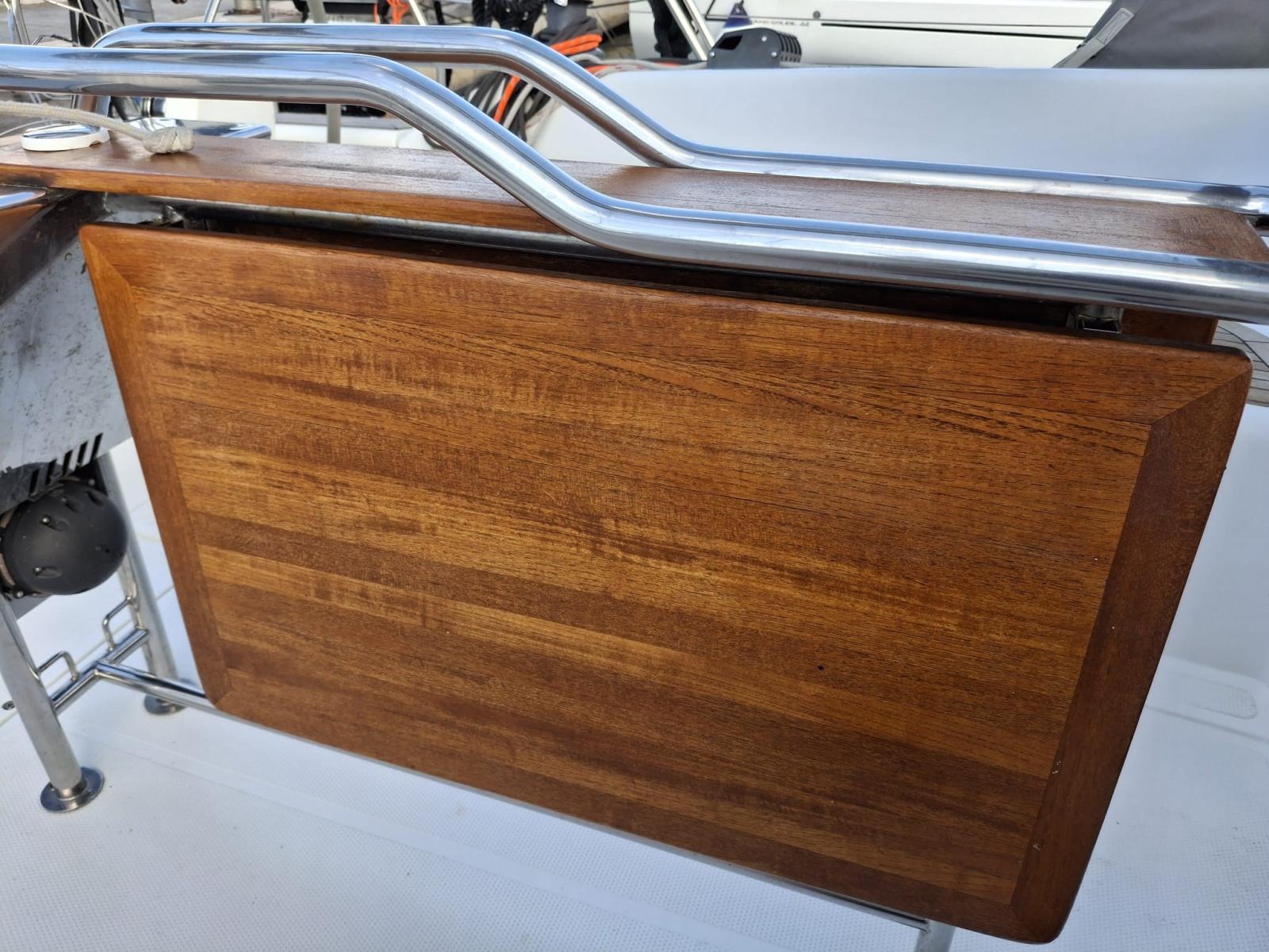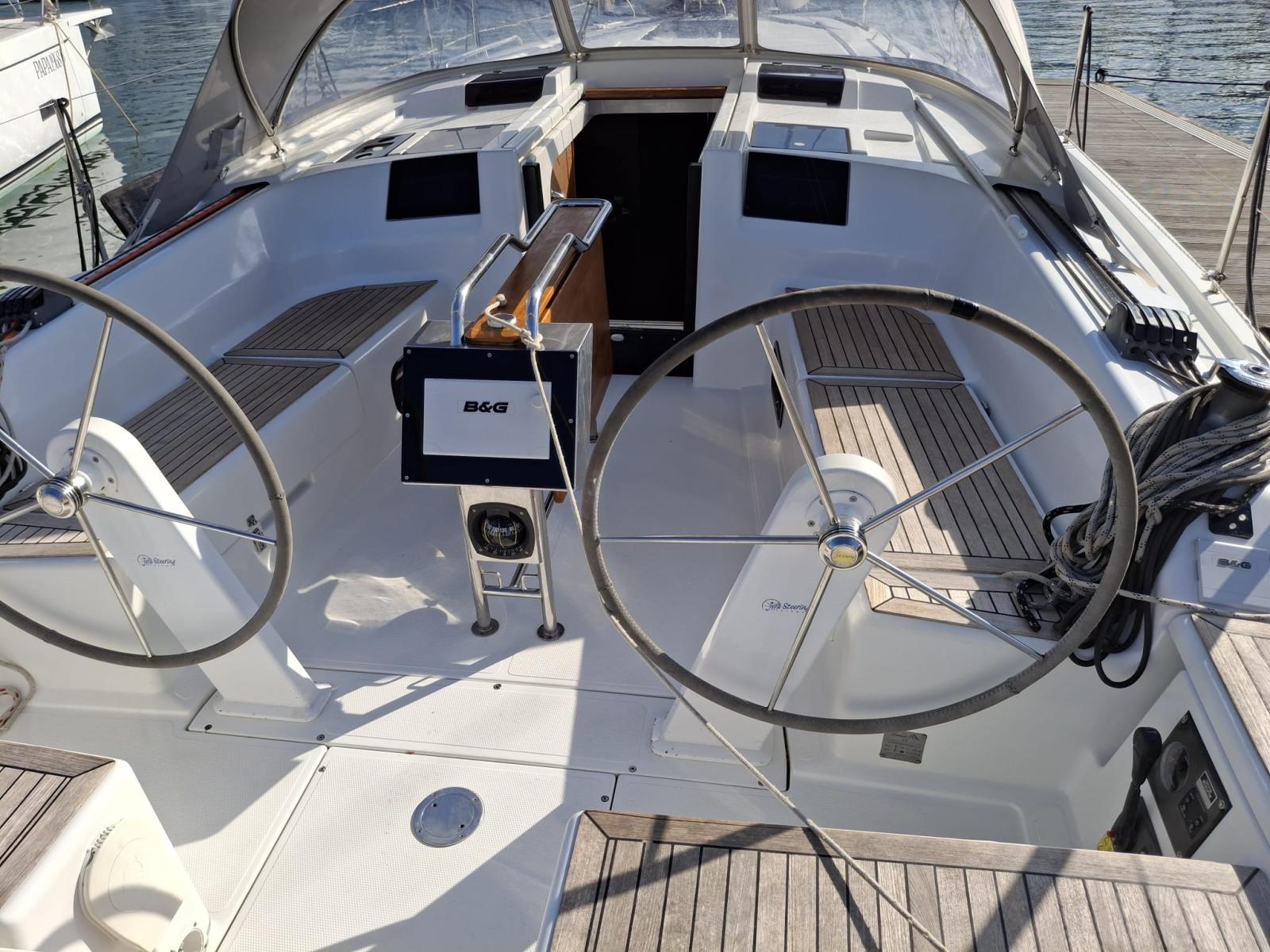 Alarme moteur, Eau sous pression, 2 Batteries, Chargeur de batterie (30 Ah), Douche de cockpit, Double barre à roue, Plateforme arrière, Pompe de cale manuelle, Cockpit en teck, Guindeau électrique, Echelle de bain, table de cockpit, 2 Winch (Lewmar 45 ST EVO).