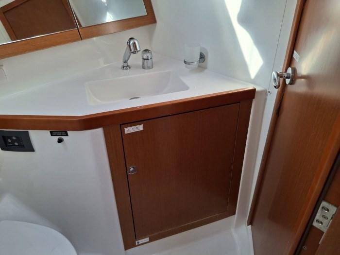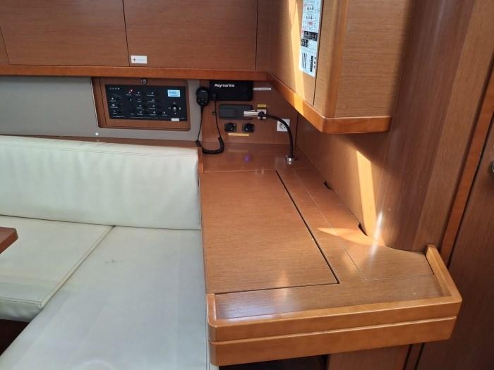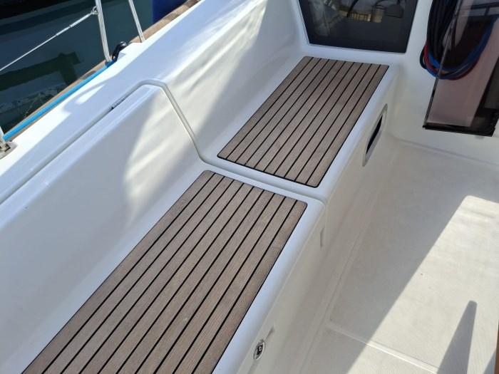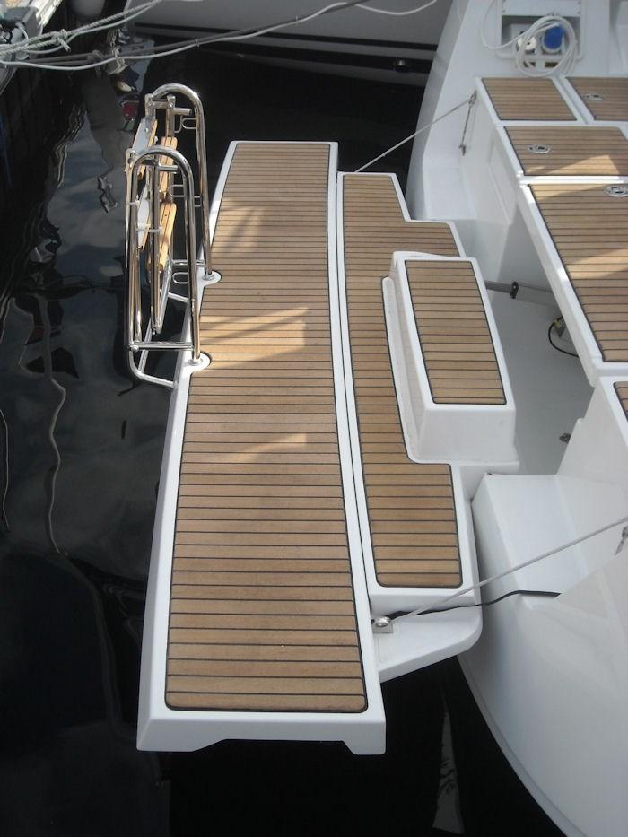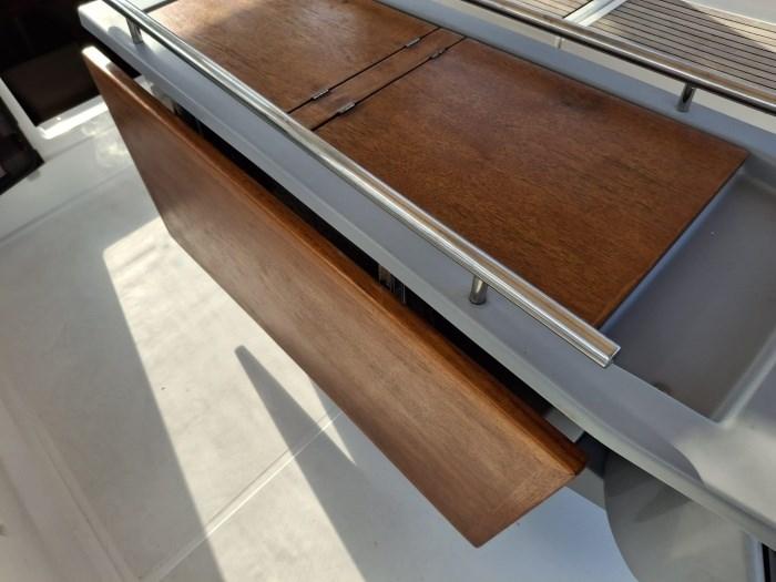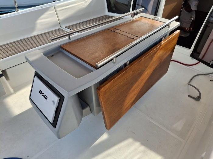Alarme moteur, Eau sous pression, Douche de cockpit, Panneau solaire, Plateforme arrière, Pompe de cale manuelle, Cockpit en teck, Guindeau électrique, Echelle de bain, table de cockpit.