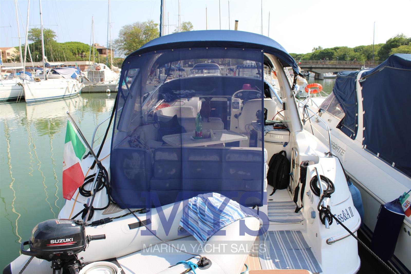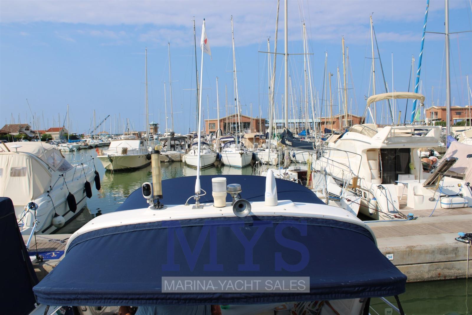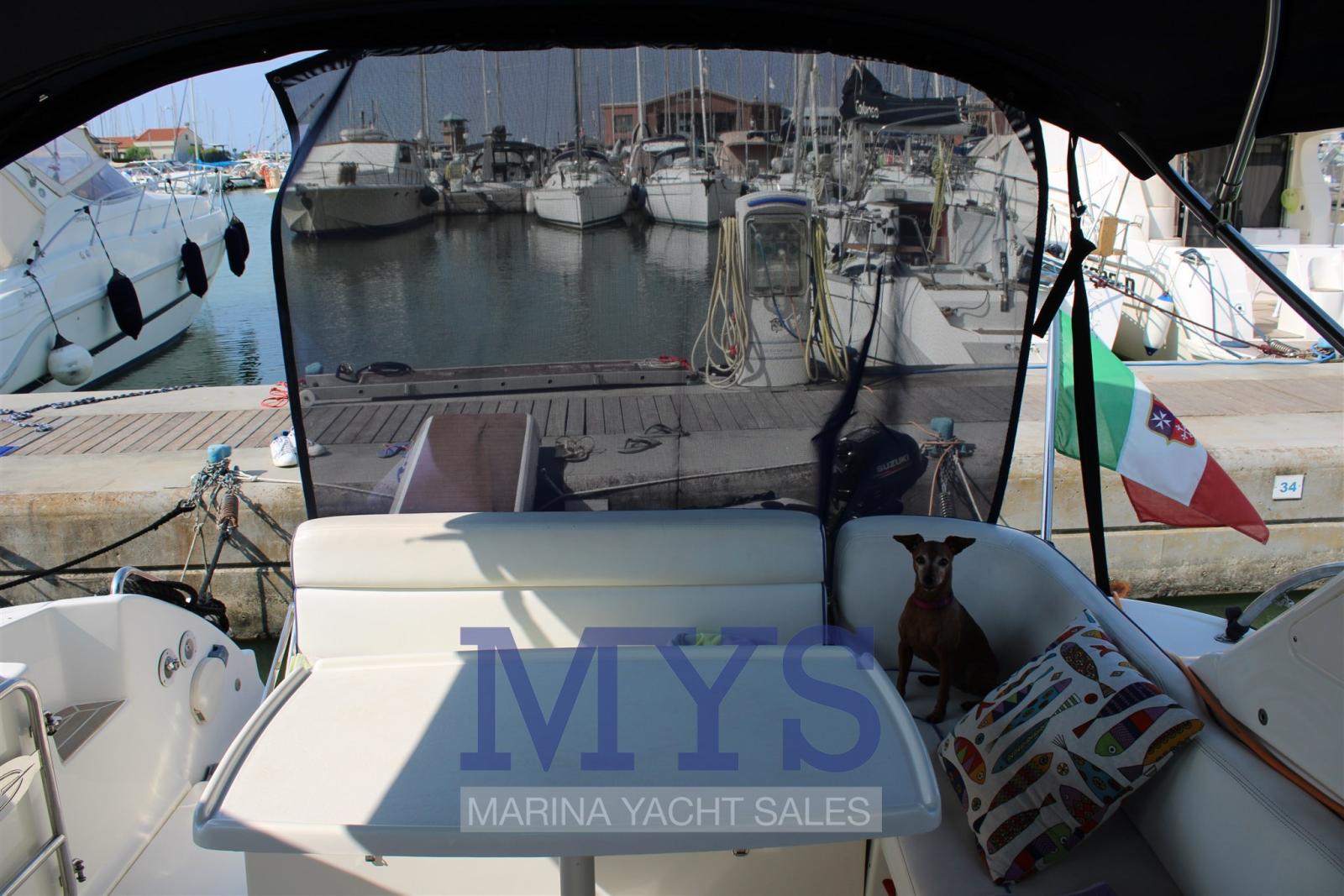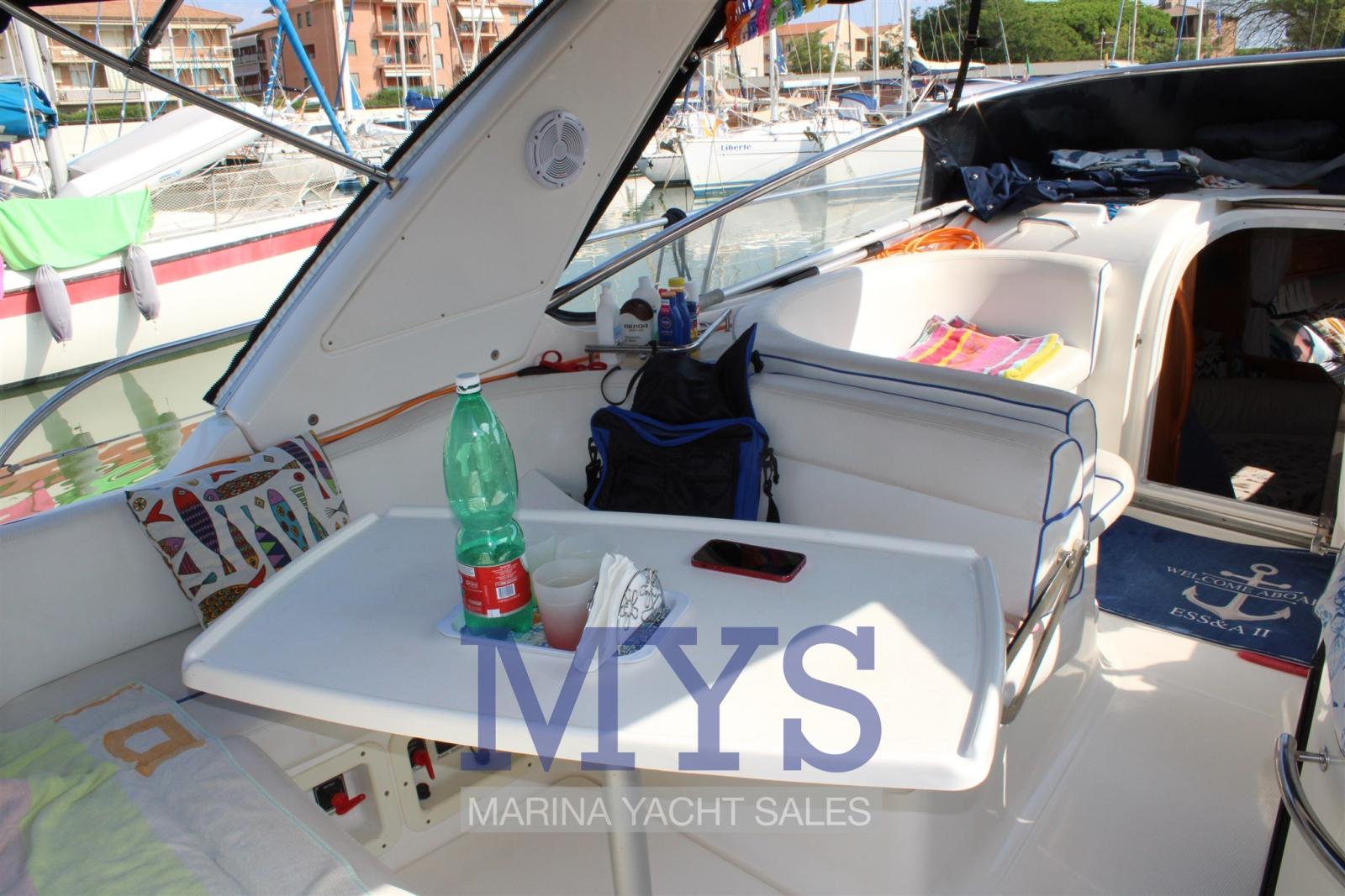 Alarme moteur, Alarme de pompe de cale, Ouverture du compartiment moteur électrique, Eau sous pression, Câble d’alimentation à quai, Couleur spéciale (Scafo con fascia blù), Douche de cockpit, Flaps hydrauliques, Indicateurs de flaps, Lavabo dans le cockpit, Éclairage de courtoisie, Moniteur de batterie, Plateforme arrière (in teak), Pompe de cale automatique, Prise de quai, Rollbar, Guindeau électrique, Echelle de bain, table de cockpit, Table pliante de salon, Corne.