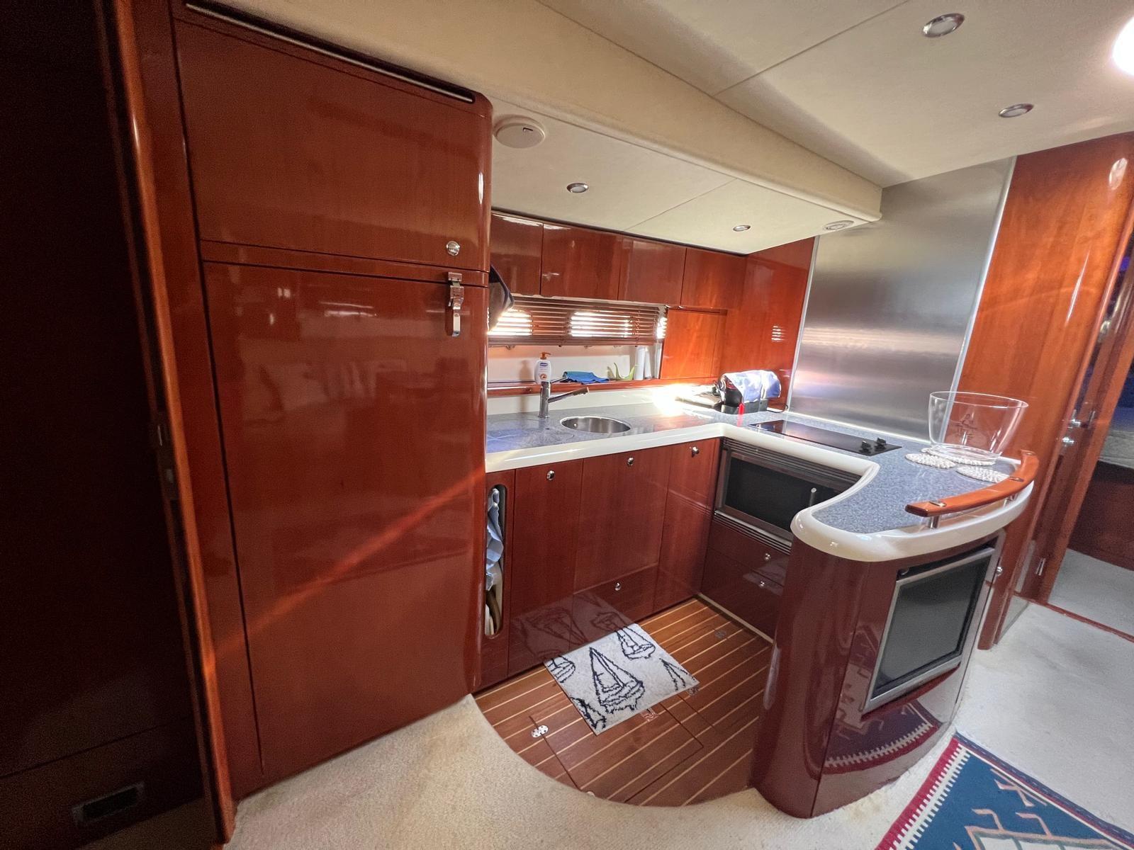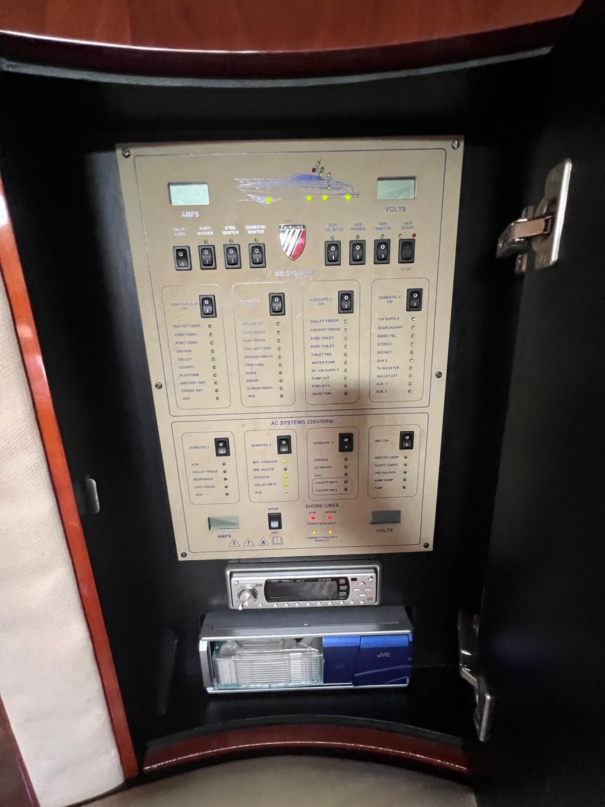 Alarme moteur, Alarme de pompe de cale, Eau sous pression, Douche de cockpit (Calda/Fredda), Phare de poursuite, 2 Flaps hydrauliques, Garage à annexe, Hard top, Indicateurs de flaps, Lavage de chaine, Éclairage de courtoisie, Passerelle, Plateforme arrière, Pompe de cale manuelle, Porte latérale, Cockpit en teck, Prise de quai, Connexion eau sous pression à quai, Guindeau électrique, Echelle de bain, table de cockpit, Table pliante de salon, Annexe (Motore Suzuki), Corne, Winch électrique arrière, Winch électrique avant.