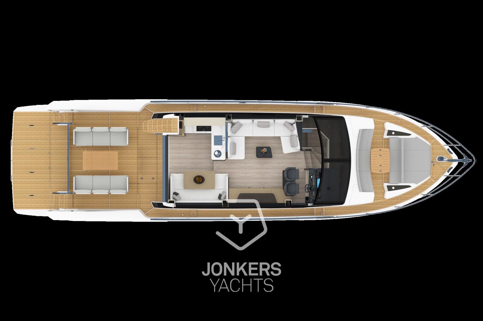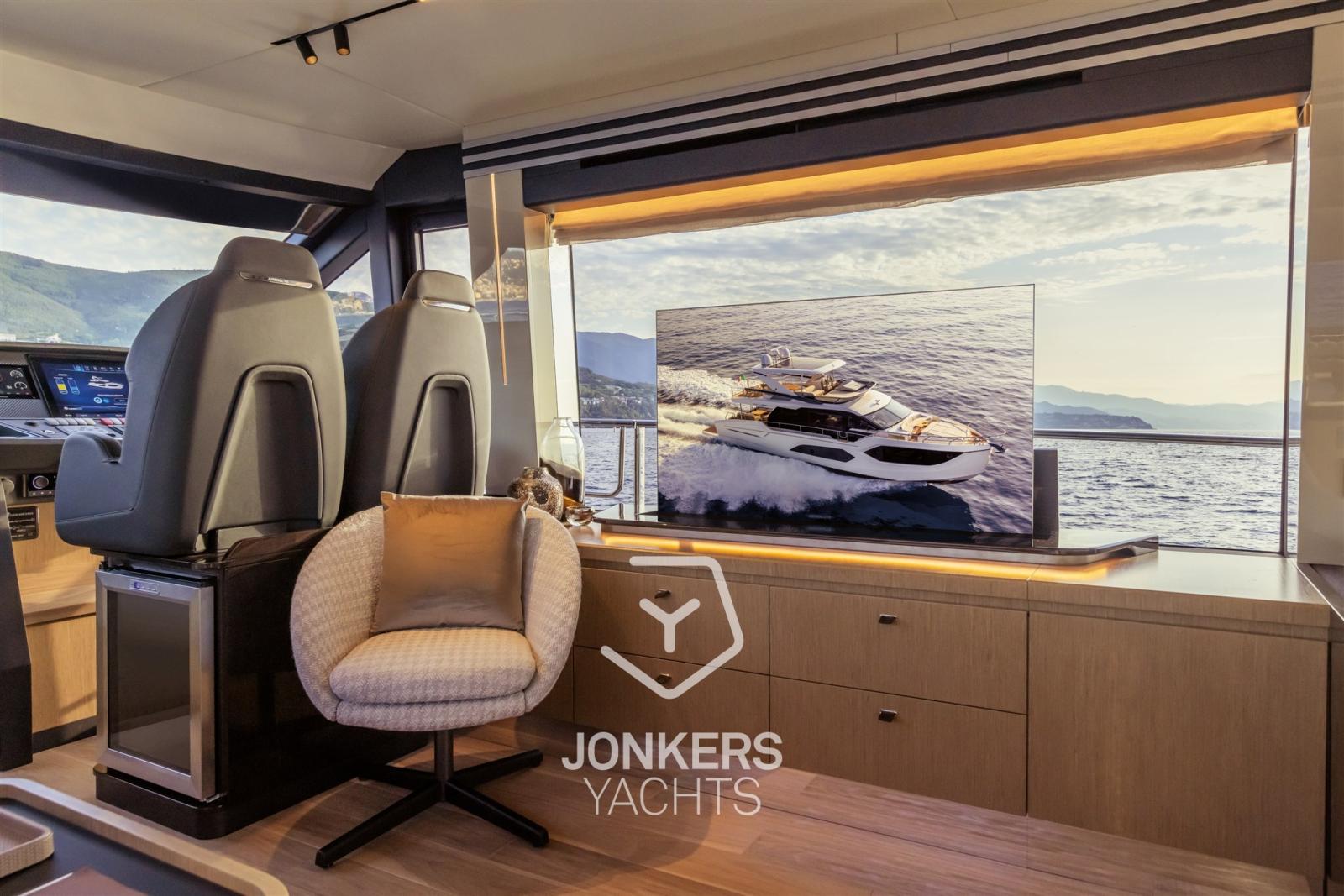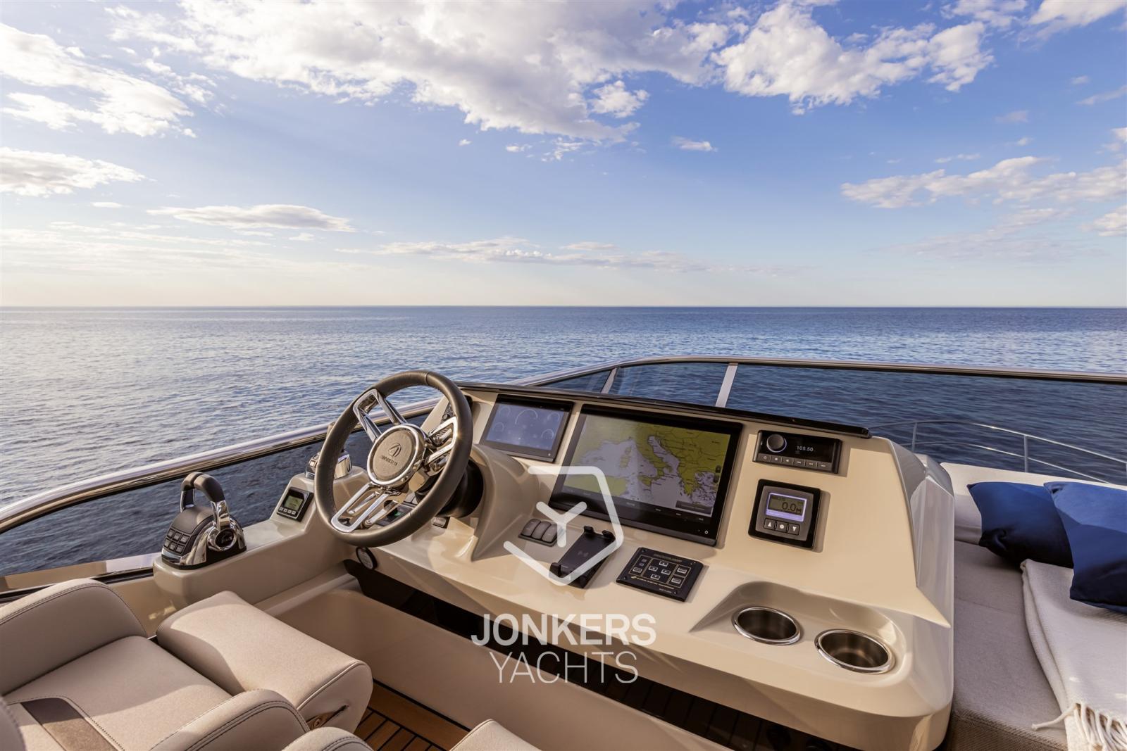 La technologie de pointe prend la forme de tableaux de bord modernes et entièrement équipés avec des équipements faciles à utiliser, toujours à portée de main. Les postes de pilotage sur le pont principal et le flybridge ont des sièges doubles et même un troisième poste d’amarrage peut être installé à l’arrière. L’approche « verte » du chantier naval est reconnaissable dans la possibilité d’intégrer des panneaux solaires dans le hard top pour atteindre un impact environnemental moindre et d’excellents niveaux d’autonomie, notamment au mouillage.