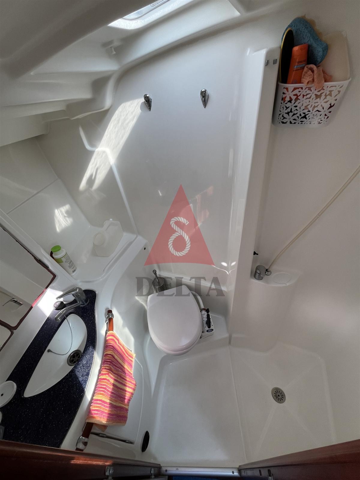 Alarme moteur, 2 Ancre, Eau sous pression, 3 Batteries, Douche de cockpit (calda/fredda), Double barre à roue, Moteur hors-bord pour annexe (5 CV), Passerelle, Plateforme arrière, Pompe de cale manuelle, Prise de quai, Connexion eau sous pression à quai, Guindeau électrique, Gréement monotoron, Echelle de bain, Chaise support HB, table de cockpit, Annexe, Filières avec sortie latèrale, 4 Winch, Windex.