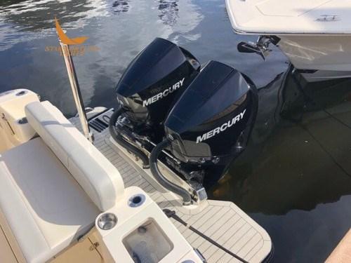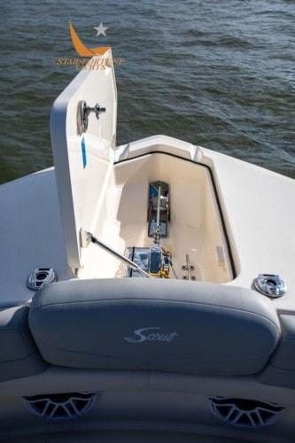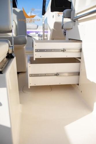 • Cockpit auto-videur • Éclairage de courtoisie LED pour le cockpit • Taquets à ressort en acier inoxydable 316 • Plate-forme de bain arrière entièrement praticable • Siège arrière intégré • Pare-brise sans cadre • Porte de passage arrière • Porte d’entrée latérale • Aquarium au sol gauche/droit avec pompe à membrane • (4) Supports de tiges en acier inoxydable • Port de réservoir d’appâts arrière • Compartiment à cannes sous le mât avant (3) • Chargeur de batterie • Lavage Guindeau d’ancre d’eau douce • Treuil, ligne d’ancre et chaîne en acier inoxydable • Toit rigide intégré en fibre de verre personnalisé avec lumières LED • Essuie-glace de lavage à l’eau douce • Volant 13 » en acier inoxydable avec poignée • Stéréo Bluetooth Fusion avec (6) haut-parleurs JL de 7,7 » • Lumières LED dans le cockpit • Évier dans le cockpit • Compartiment de rangement de la console • Sièges de pilotage de luxe en fibre de verre avec accoudoirs et supports • Siège de pilotage et siège de salon convertibles • Garmin 943XS avec transducteur GT12M • Port combo USB/USB-C et port USB supplémentaire • Feu de navigation • Direction assistée incluse de série avec le pack moteur • Seakeeper Ride • Commutation numérique C-Zone • Port combo USB/USB-C et port USB supplémentaire • Batteries de service et de démarrage