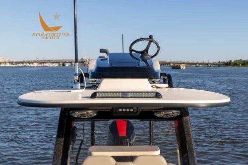 De plus, ce modèle est livré de série avec un tableau arrière personnalisé avec la signature du PDG/fondateur de Scout, Steve Potts, et un deuxième poste qui offre toutes les commandes en haut, permettant au capitaine de se tenir à l’arrière des deux sièges de barre et assurant ainsi une vue dégagée.