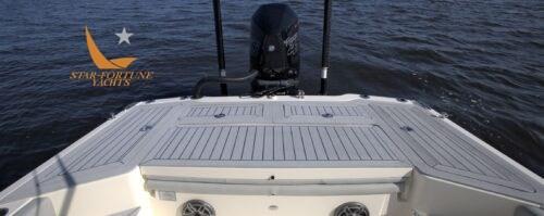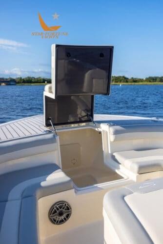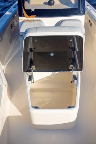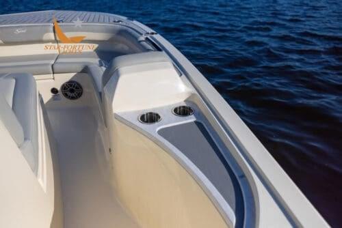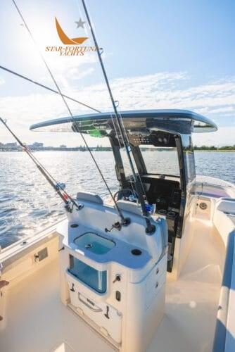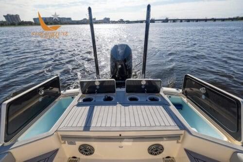 Le bateau offre une capacité de pêche incroyable grâce au grand parvis et au pont arrière pour le lancer, aux deux compartiments appâts/poissons à l’arrière et à un grand espace de rangement pour les cannes.