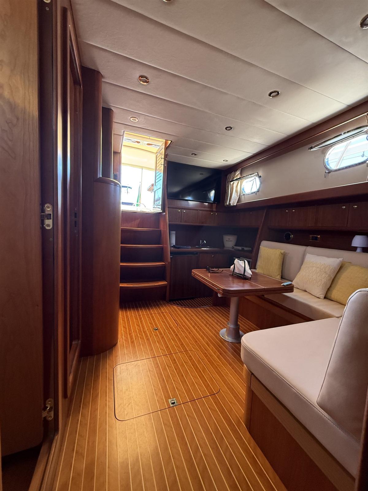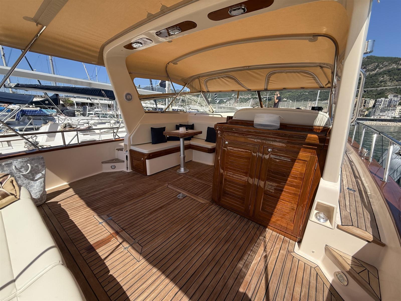 Alarme moteur, Alarme de pompe de cale, Eau sous pression, Système de vidange, Passavant en teck, Filères, Flaps hydrauliques, Extincteur(s) fixe(s), Lavabo dans le cockpit, Éclairage de courtoisie, Passerelle, Pompe de cale automatique, Cockpit en teck, Prise de quai, Connexion eau sous pression à quai, Rollbar, Guindeau électrique, Echelle de bain, Selles pour Annexe, table de cockpit, Corne, Winch électrique avant.