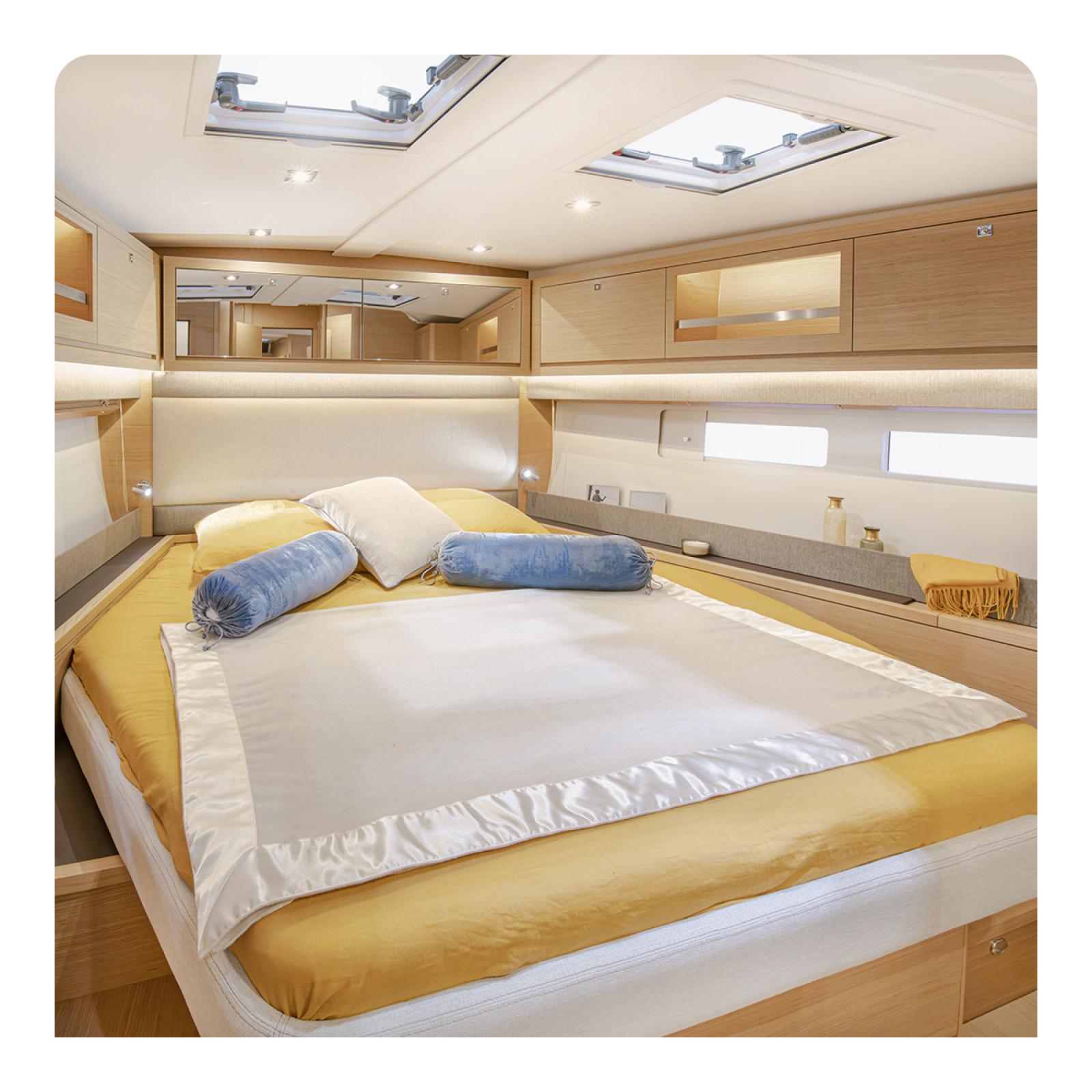 Les larges vitrages de coque et de pont inondent les espaces intérieurs de lumière naturelle, créant une atmosphère chaleureuse et élégante. Les finitions soignées et les volumes généreux offrent un confort haut de gamme pour de longues navigations.