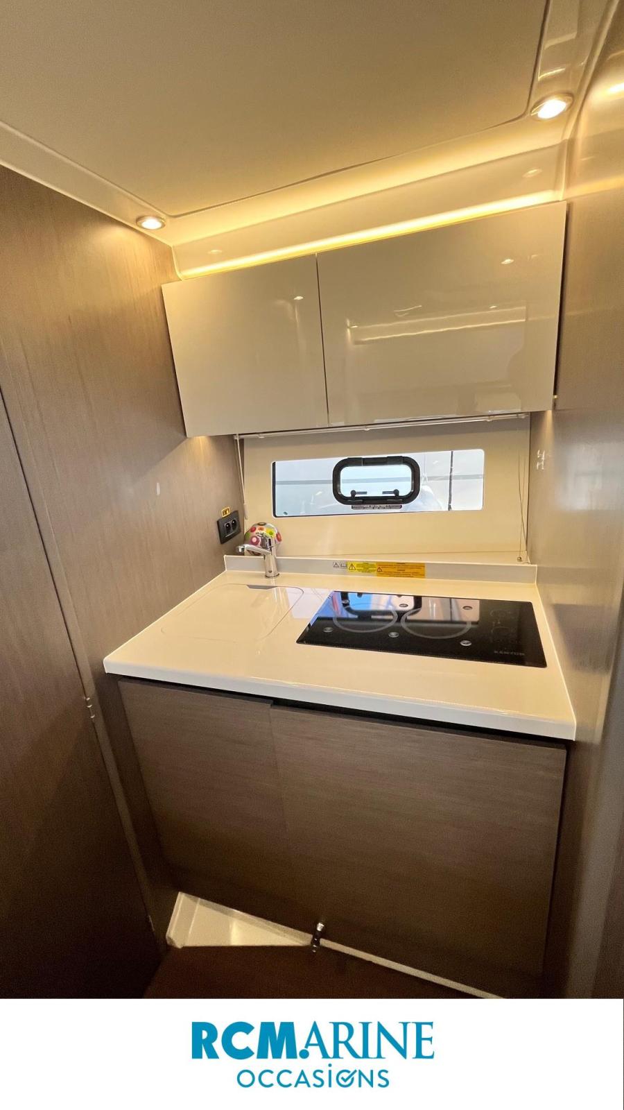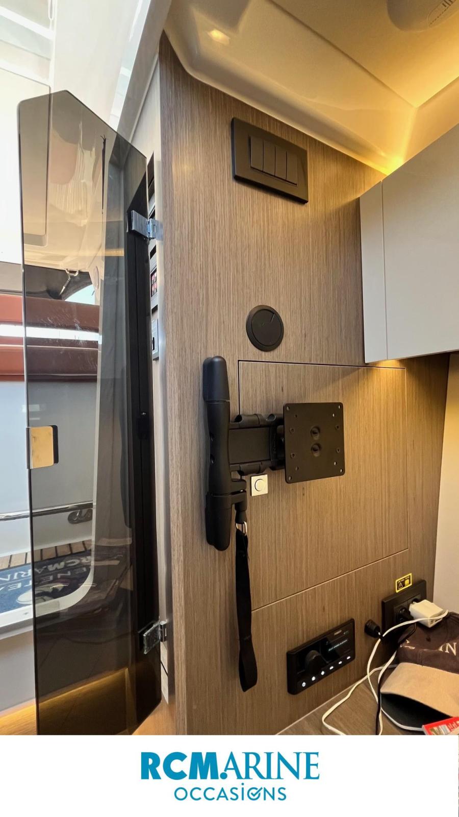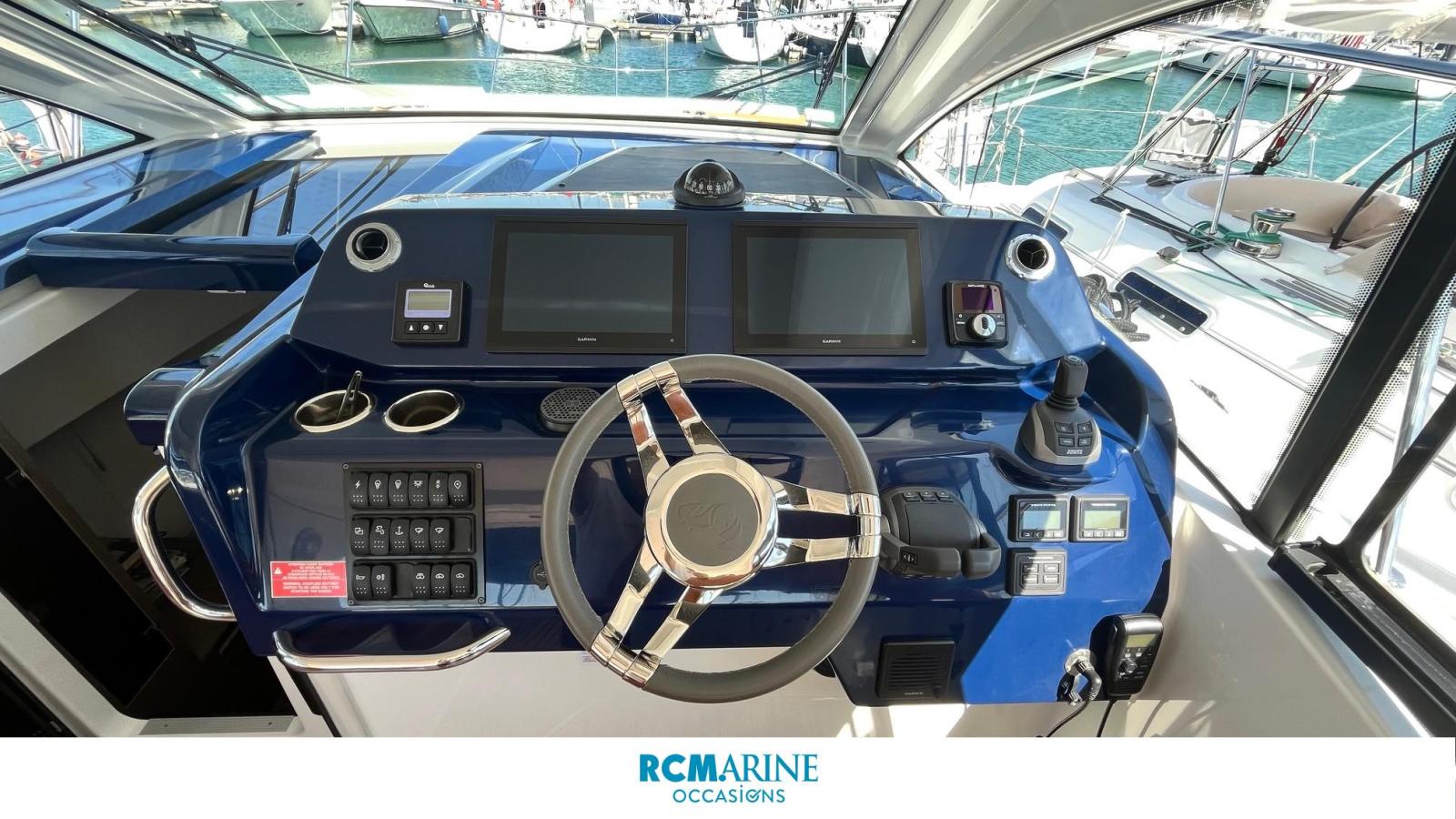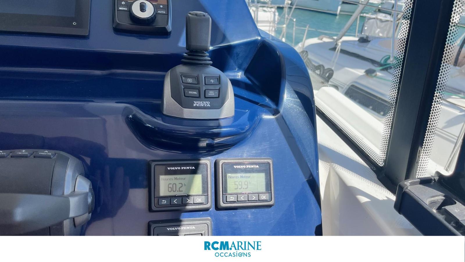 Parmis les options, nous retrouvons à bord un cockpit full teck, une plateforme de bain XL, une cuisine extérieur avec réfrigérateur, évier, plancha. Taud de fermeture arrière, bain de soleil avant, moteur volvo équipé dujoystick de manoeuvre, double cabine, carré et cuisine intérieur, écran multifonction GARMIN....