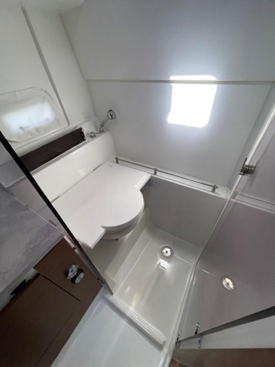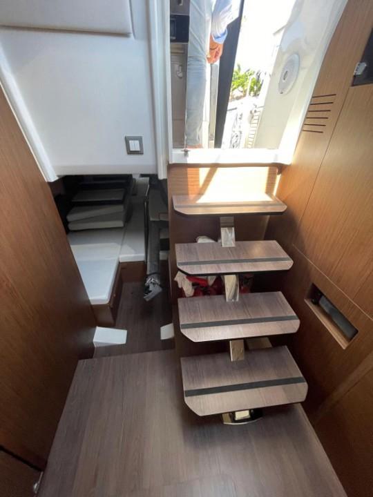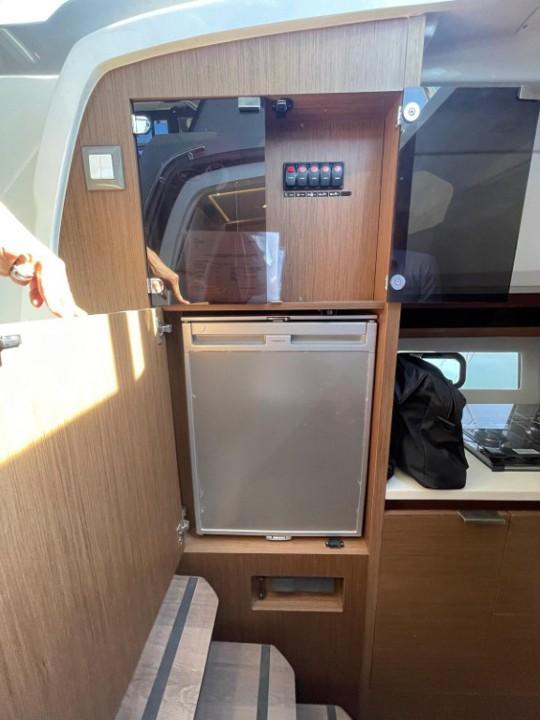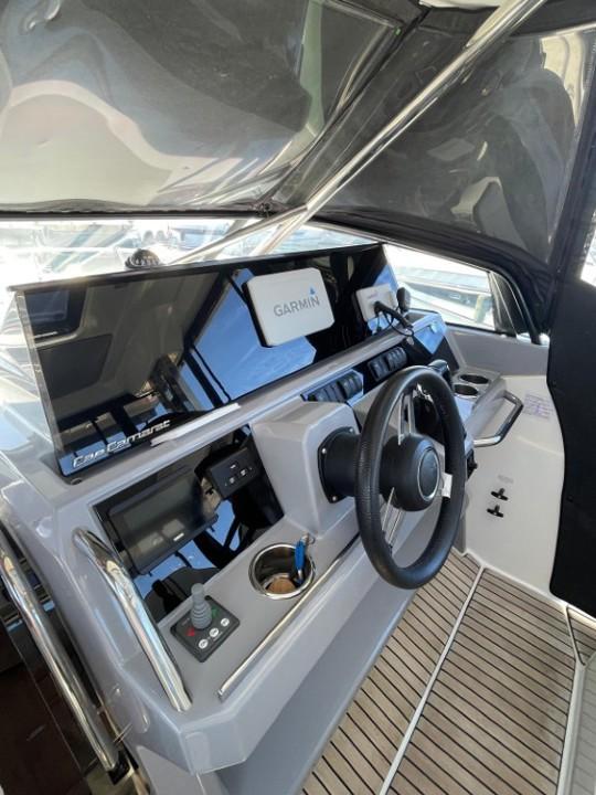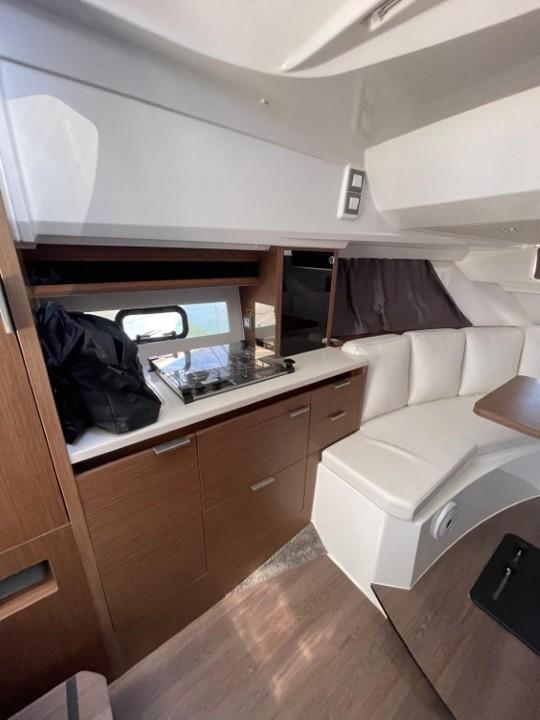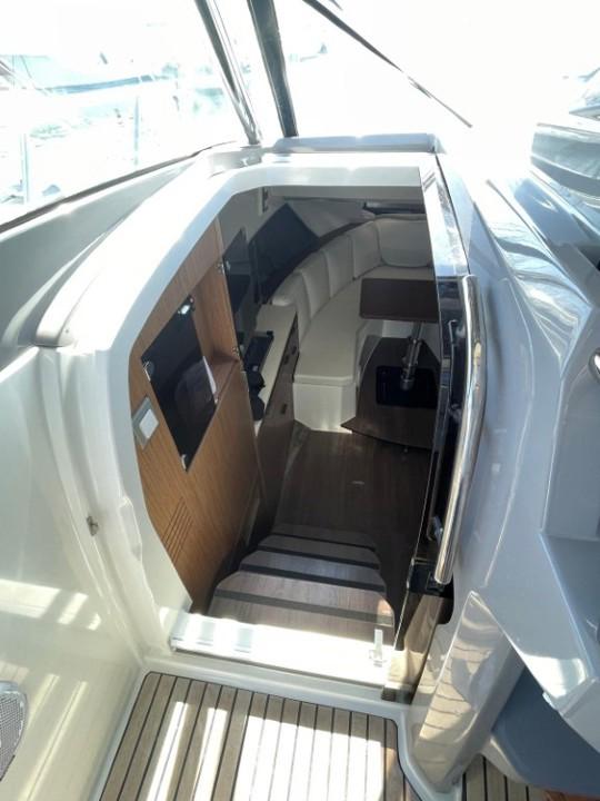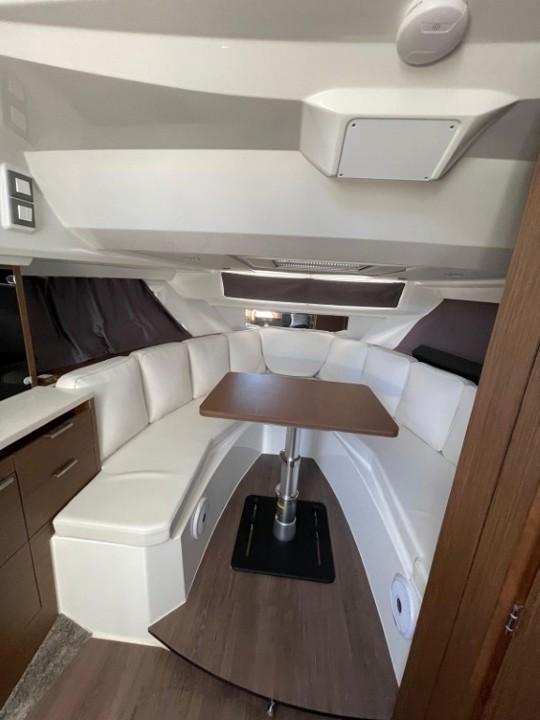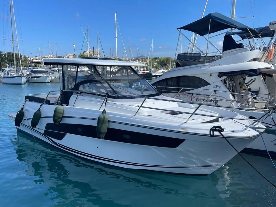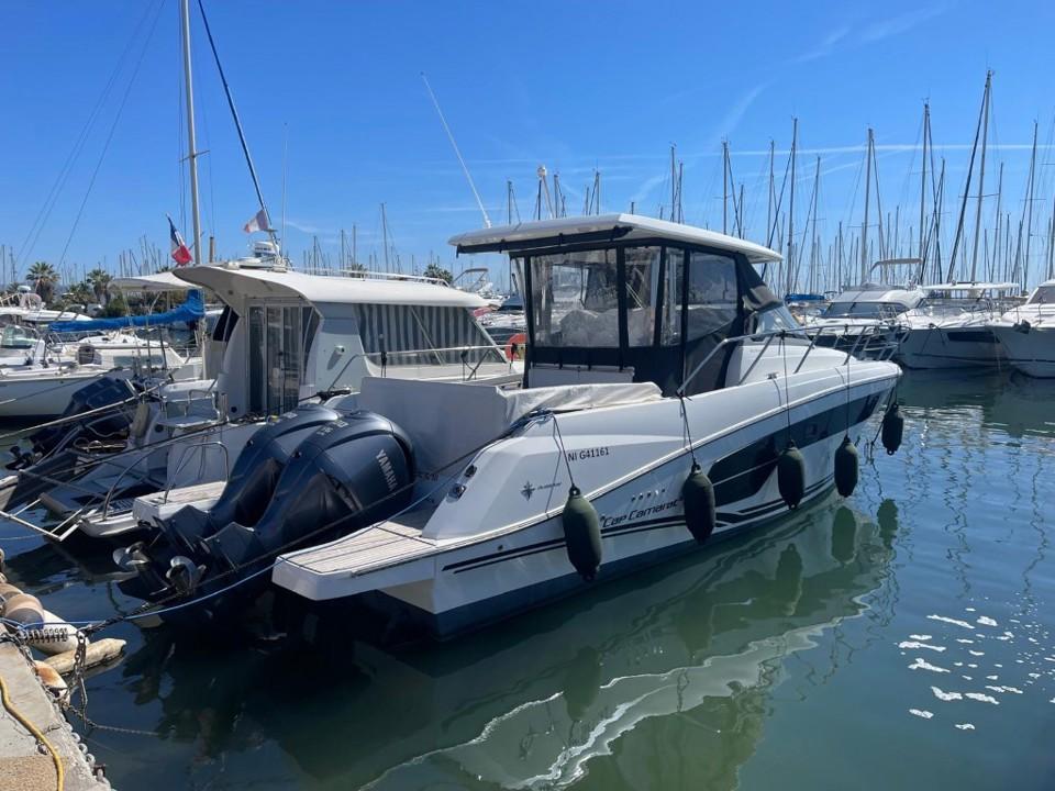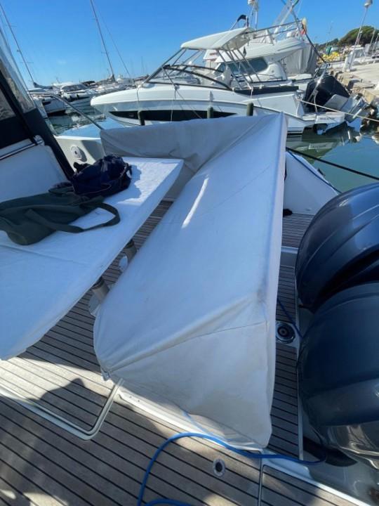 Configuration idéale pour les croisières et sorties à la journée, ce bateau offre confort, puissance et équipements haut de gamme. , deux réfrigérateurs (intérieur et cockpit), une plancha extérieure, un grand carré de cockpit transformable, bain de soleil avant, cabine double fermée avec couchage supplémentaire, salle d’eau avec WC et douche, poste de pilotage équipé, GPS traceur, VHF, guindeau électrique, flaps, taud de soleil, douchette de cockpit, plateforme de bain, sellerie en excellent état,
