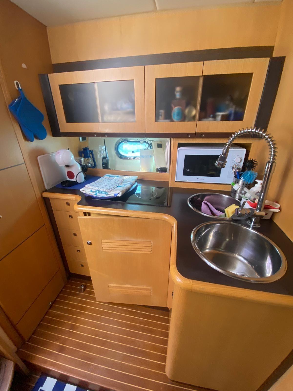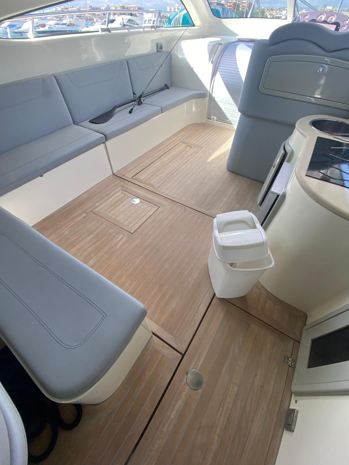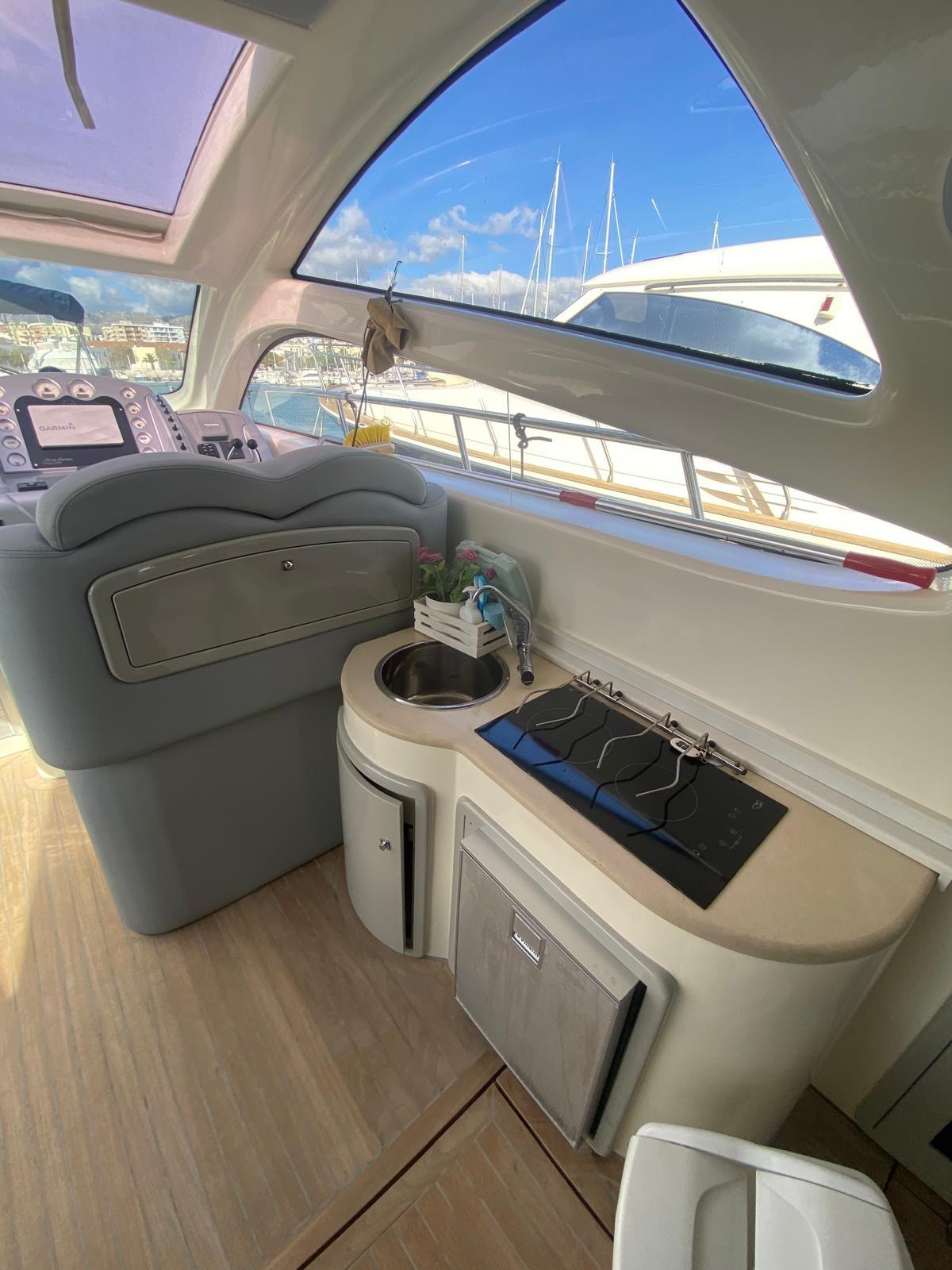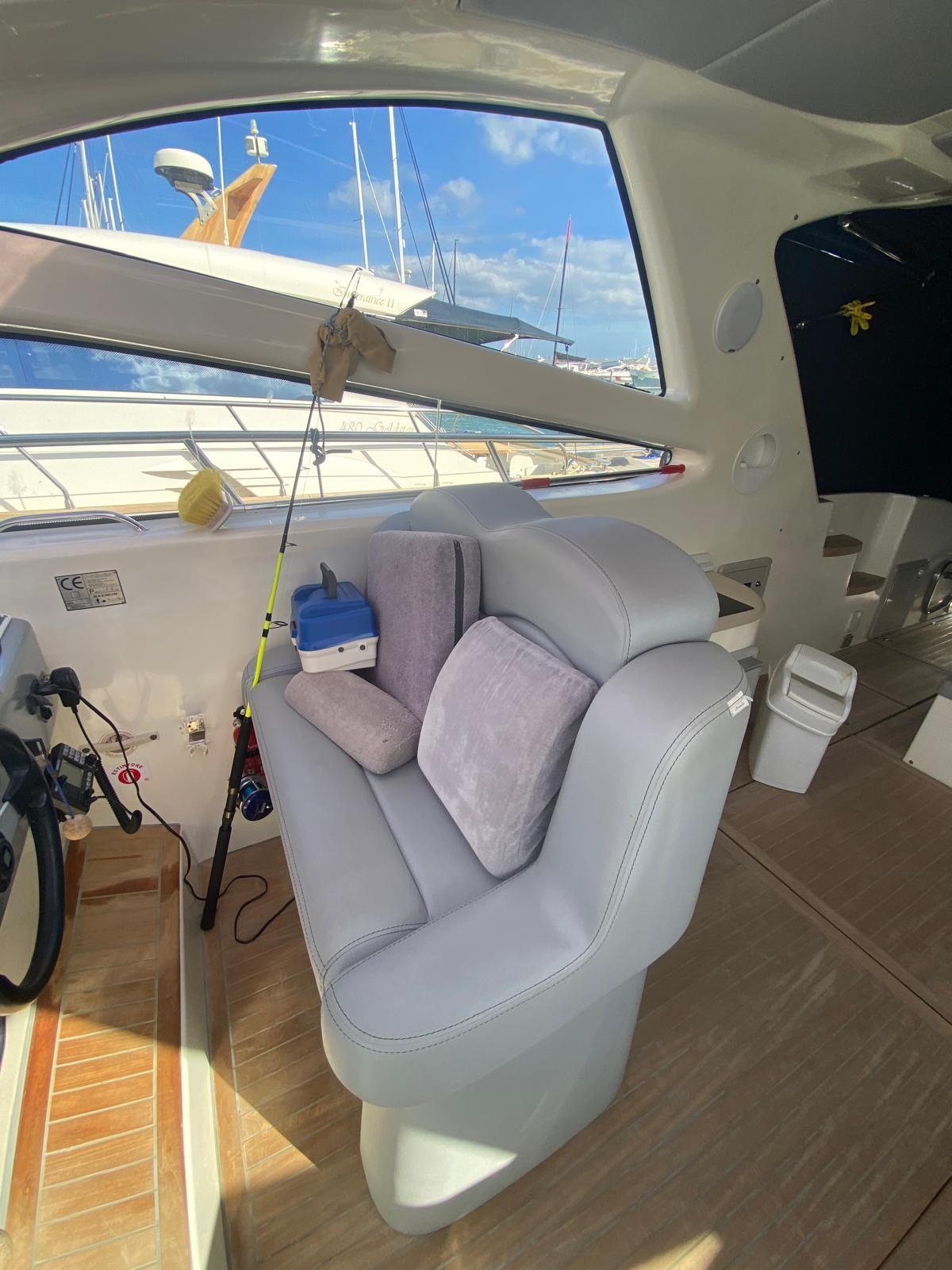 Alarme moteur, Alarme de pompe de cale, Ouverture du compartiment moteur électrique, Eau sous pression, Douche de cockpit, Phare de poursuite, Flaps hydrauliques, Hard top, Extincteur(s) fixe(s), Indicateurs de flaps, Lavabo dans le cockpit, Éclairage de courtoisie, Spots sous-marins, Plateforme arrière, Pompe de cale manuelle, Cockpit en teck, Prise de quai, Connexion eau sous pression à quai, Guindeau électrique, Echelle de bain, table de cockpit, Table pliante de salon, Annexe, Corne.