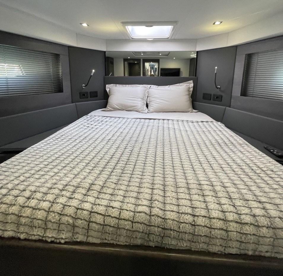 Forfait Confort: Air conditionné BTU 45000 avec 5 faincoils + Générateur 9 kw + Passerelle hydraulique mt. 3,00 avec 1 télécommande + cockpit et plate-forme en teck + passages couverts en teck (promenade) + table de cockpit et Fly en teck avec support en aluminium réglable + propulseur d’étrave 7 ch + treuil arrière 700 W n.1