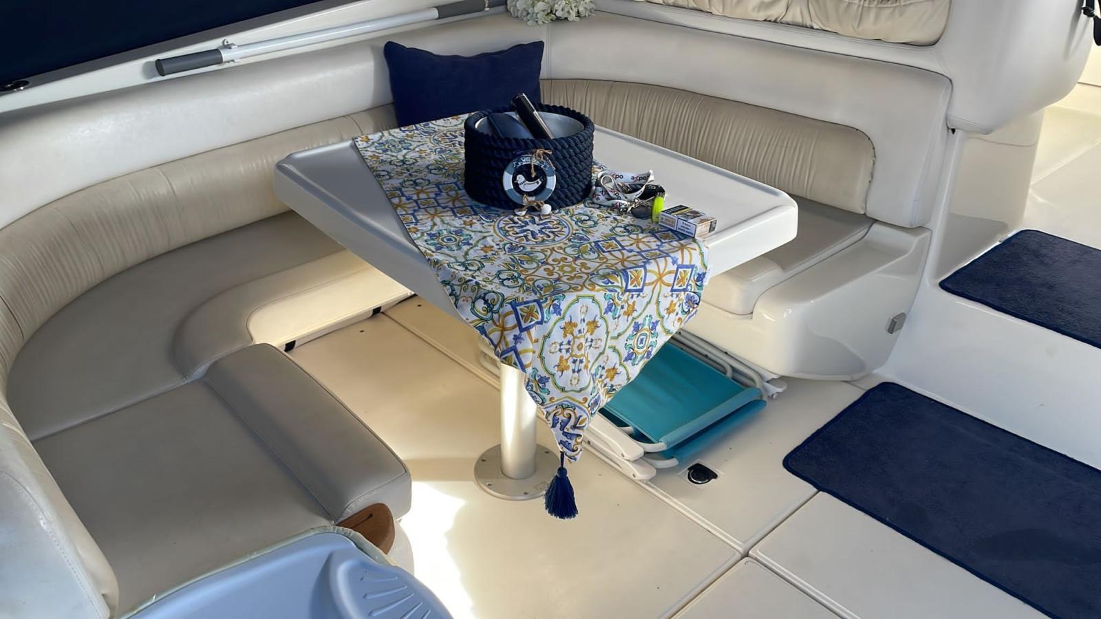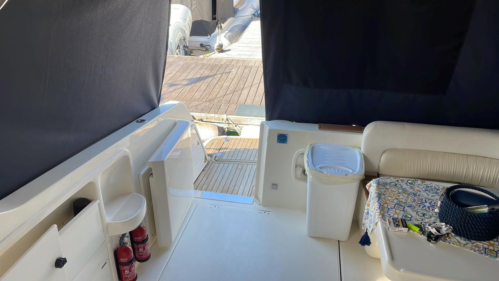 Alarme gaz, Alarme moteur, Alarme de pompe de cale, Eau sous pression, Douche de cockpit, Flaps électriques, Extincteur(s) fixe(s), Passerelle, Plateforme arrière, Pompe de cale automatique, Cockpit en teck, Prise de quai, Onduleur, Rollbar, Guindeau électrique, Echelle de bain, table de cockpit, Corne, Winch électrique avant.