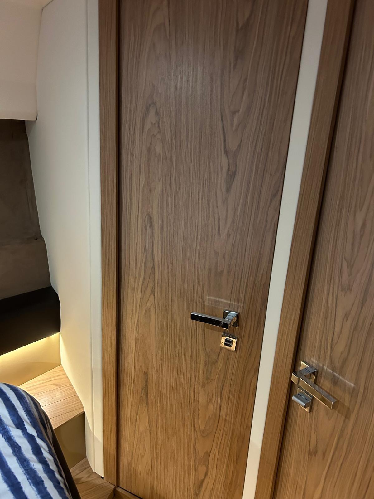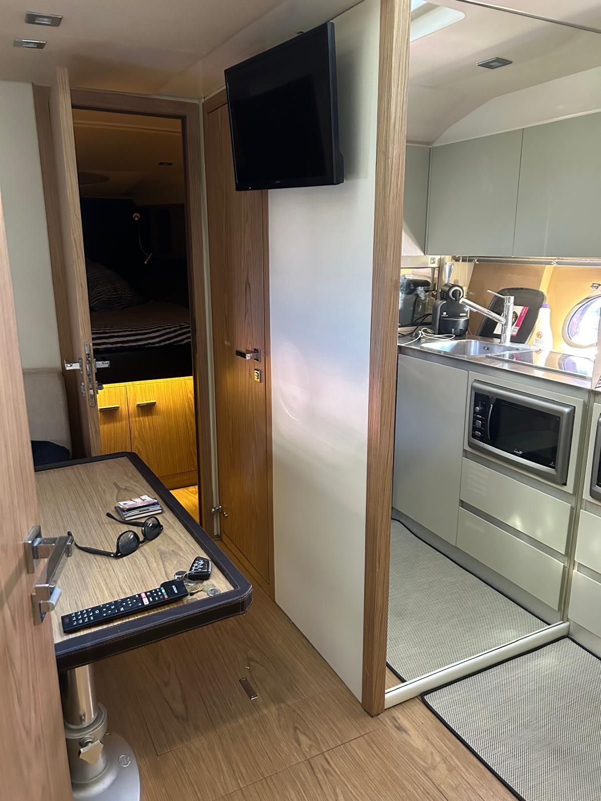 Alarme moteur, Alarme de pompe de cale, Alternateur, Eau sous pression, Douche de cockpit, Phare de poursuite, Flaps électriques, Hard top, Extincteur(s) fixe(s), Lavabo dans le cockpit, Éclairage de courtoisie, Plateforme arrière, Pompe de cale automatique, Pompe de cale manuelle, Cockpit en teck, Prise de quai, Guindeau électrique, Echelle de bain, table de cockpit, Table pliante de salon, Filières avec sortie latèrale, Corne.