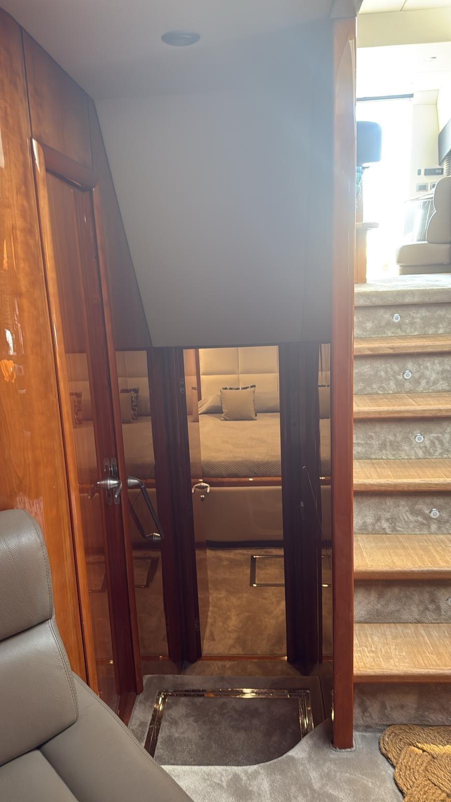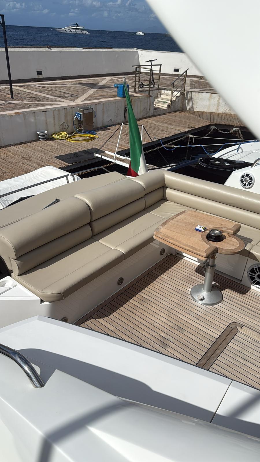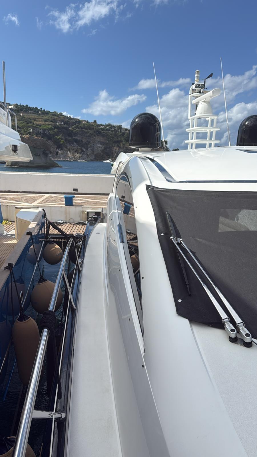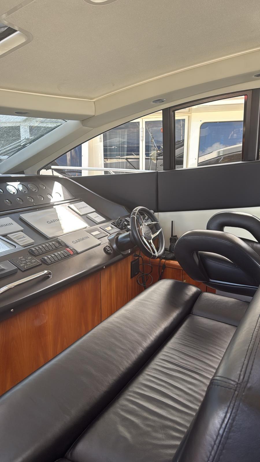 Alarme moteur, Alarme de pompe de cale, Alternateur, Eau sous pression, Douche de cockpit, Flaps hydrauliques, Hard top, Extincteur(s) fixe(s), Indicateurs de flaps, Éclairage de courtoisie, Spots sous-marins, Défenses, Passerelle, Plateforme arrière, Pompe de cale automatique, Pompe de cale manuelle, Pont en teck, Porte latérale, Cockpit en teck, Prise de quai, Connexion eau sous pression à quai, Guindeau électrique, Selles pour Annexe, table de cockpit, Corne, Winch électrique arrière, Winch électrique avant.