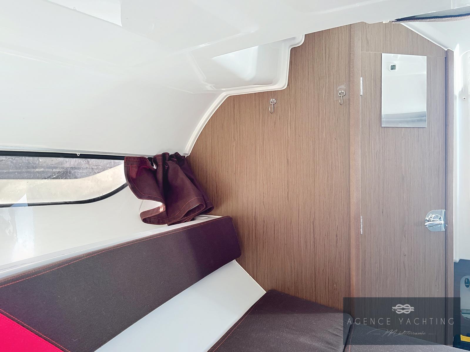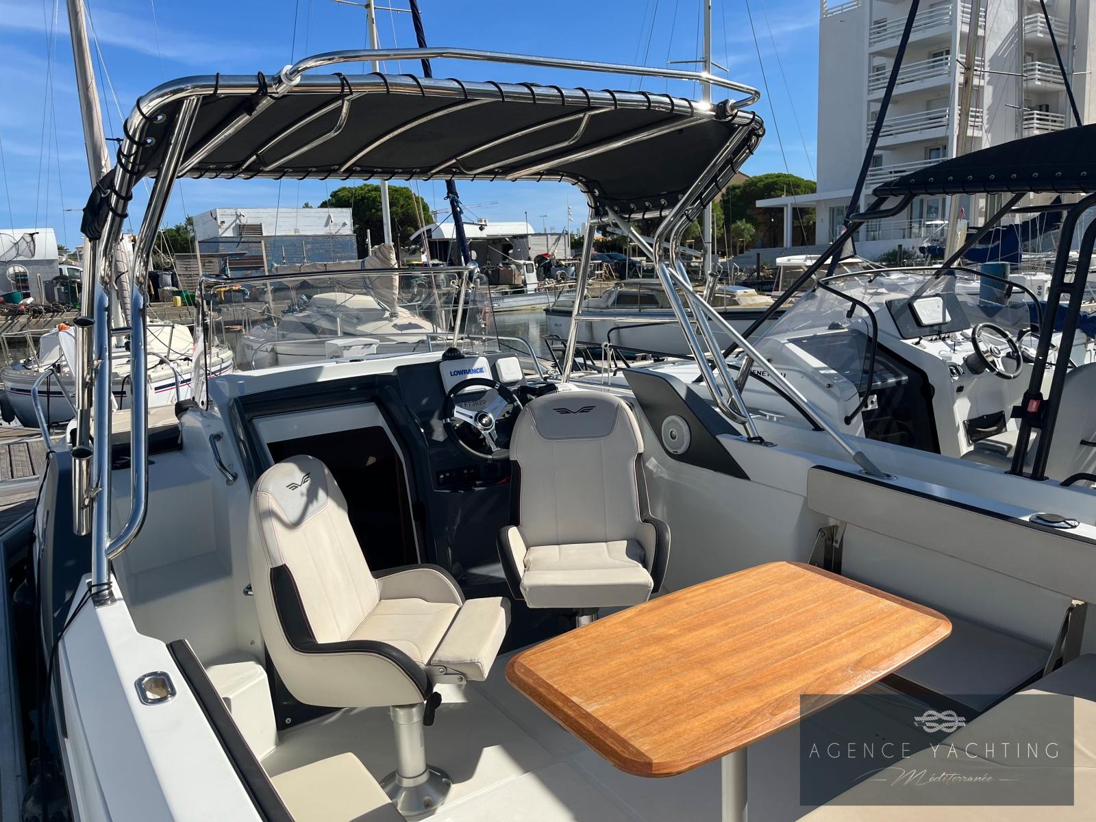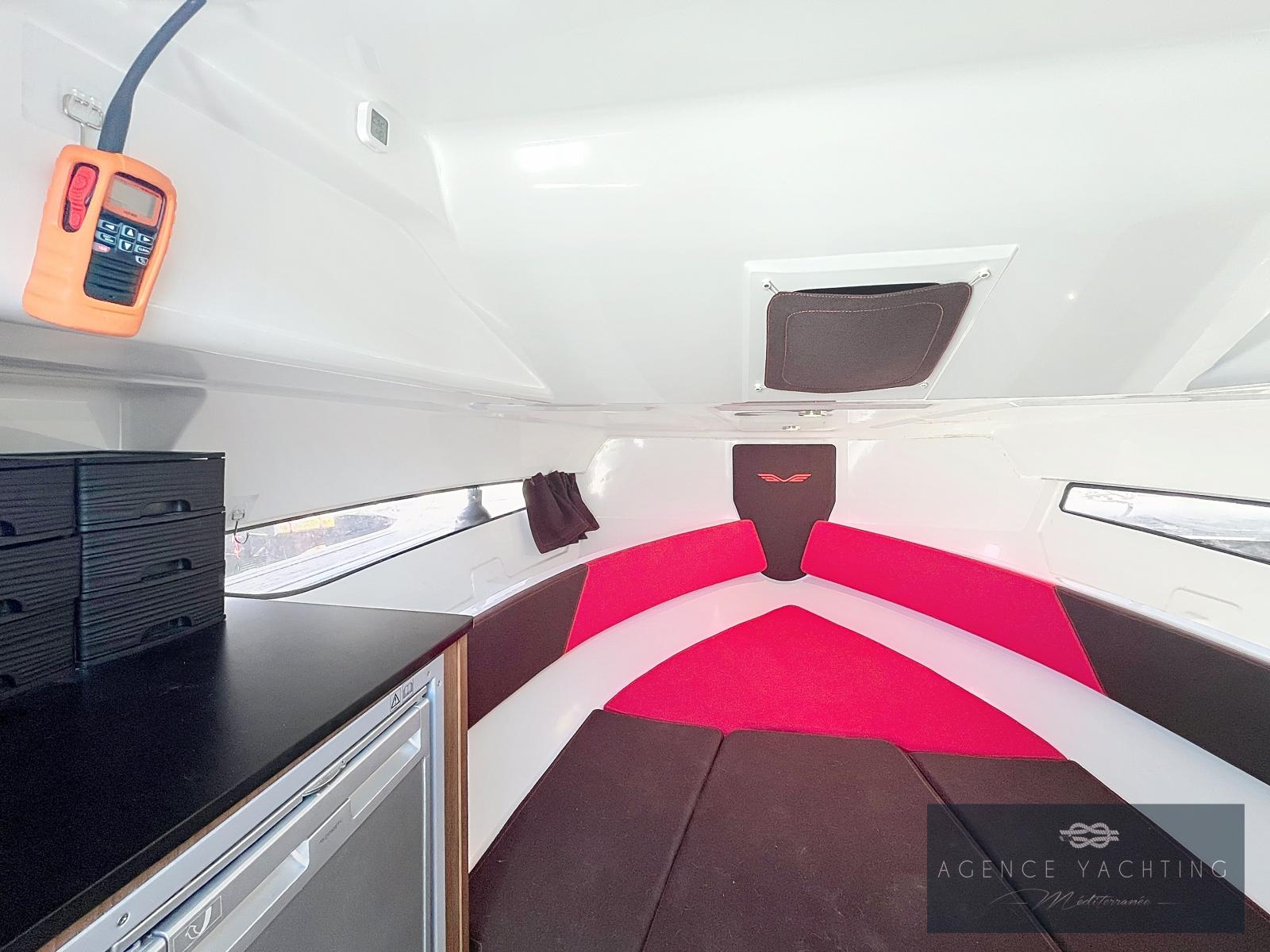 Le cockpit se transforme en véritable espace de convivialité avec son salon et sa table en Teck, complété par un réfrigérateur et de larges bains de soleil invitant à la détente. Les housses de protection de console sont incluses pour préserver l’ensemble en parfait état. À l’intérieur, une cabine lumineuse et confortable propose deux couchages, un WC marin, une douche intérieure, offrant un confort rare pour un bateau de cette catégorie. Économique, sportif et raffiné, ce Flyer 7.7 est le bateau plaisir par excellence, pensé pour combiner sensations nautiques et confort de croisière. À voir absolument.