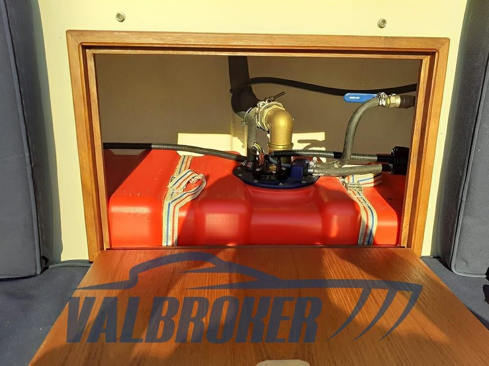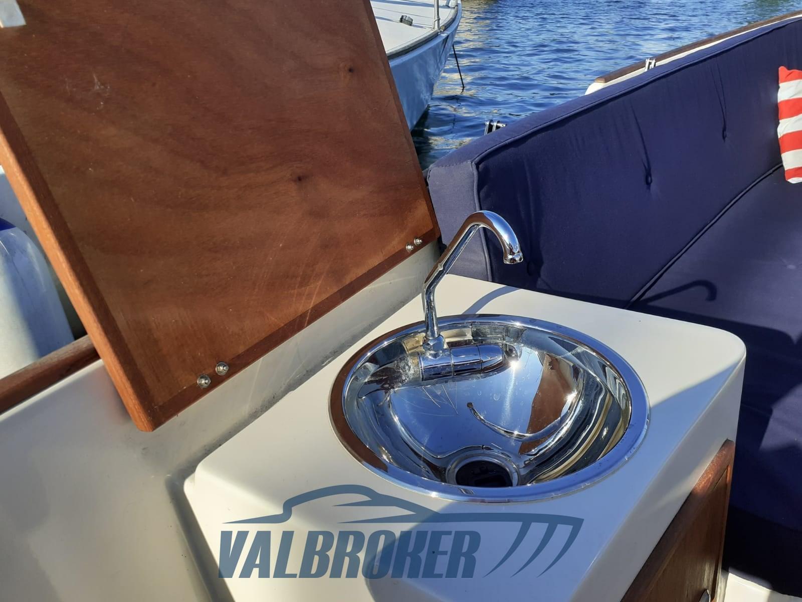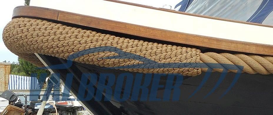 Coque en fibre de verre avec finitions en teck massif, teck toujours huilé. Hangar d’hiver.