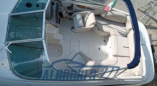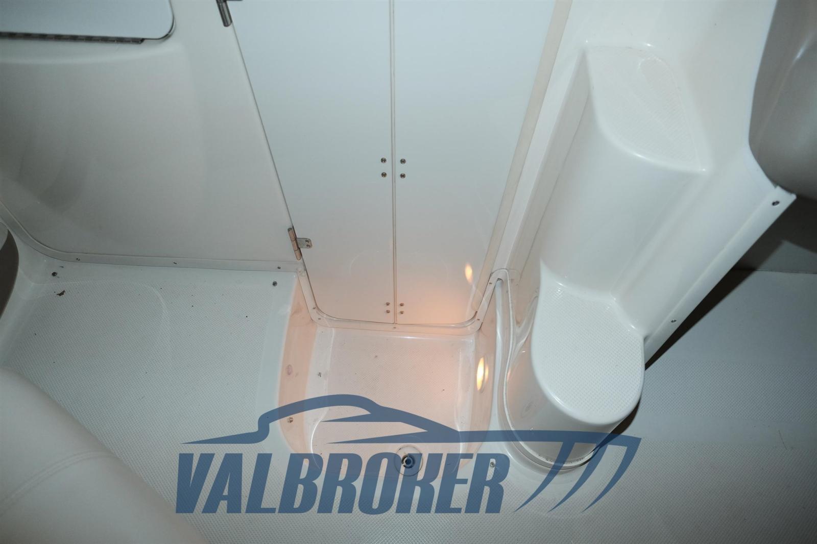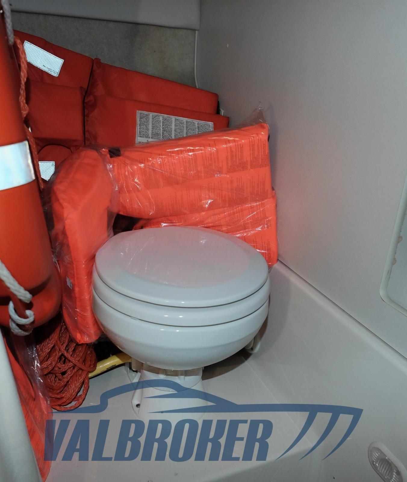compartiment toilettes, grand bain de soleil à l’avant, équipé d’un réservoir de carburant avec indicateur, panneau utilitaire, feux de navigation