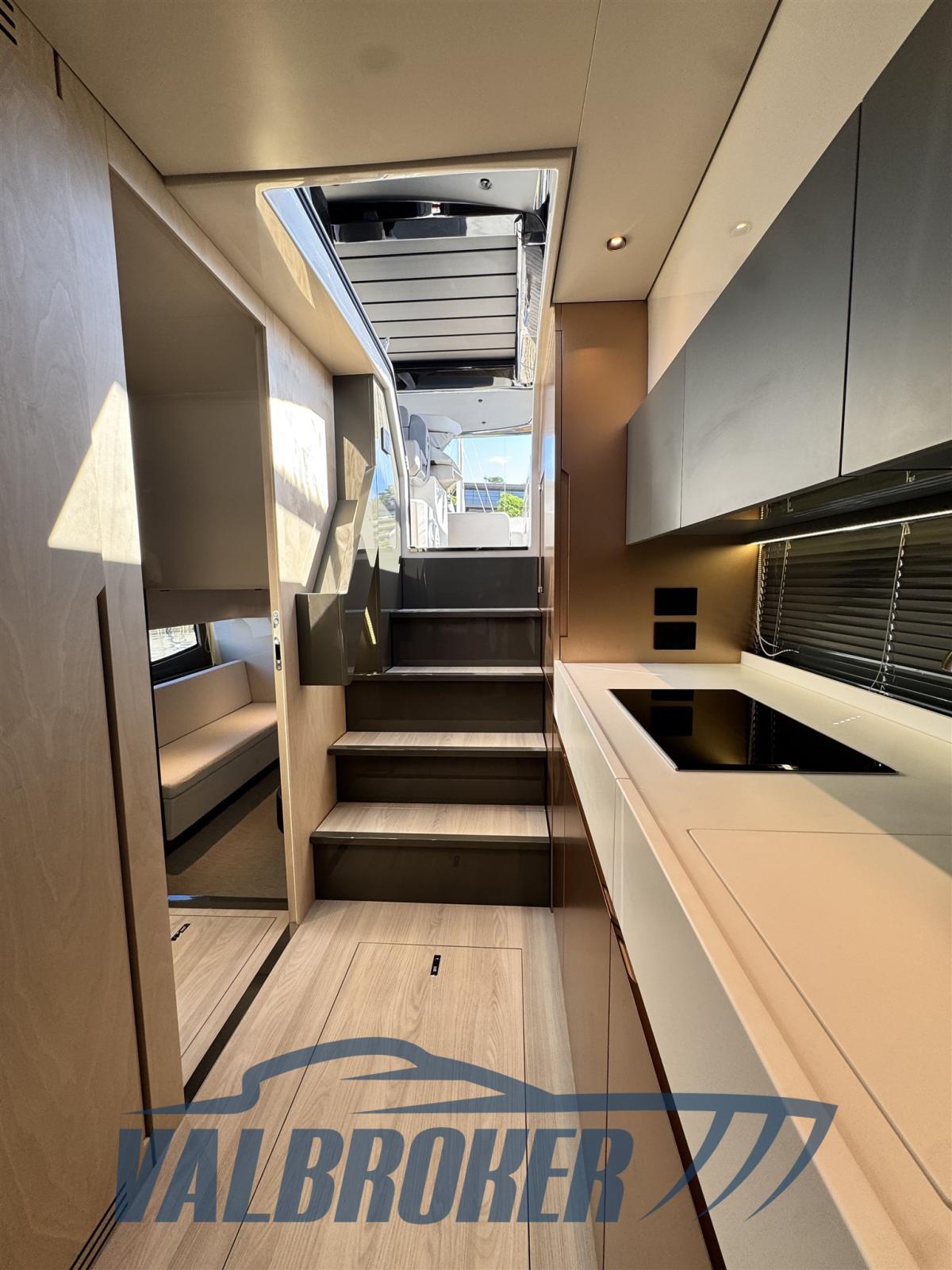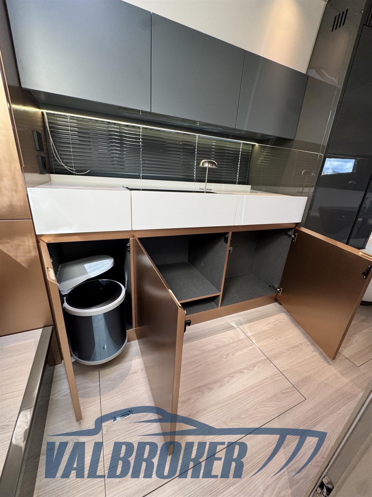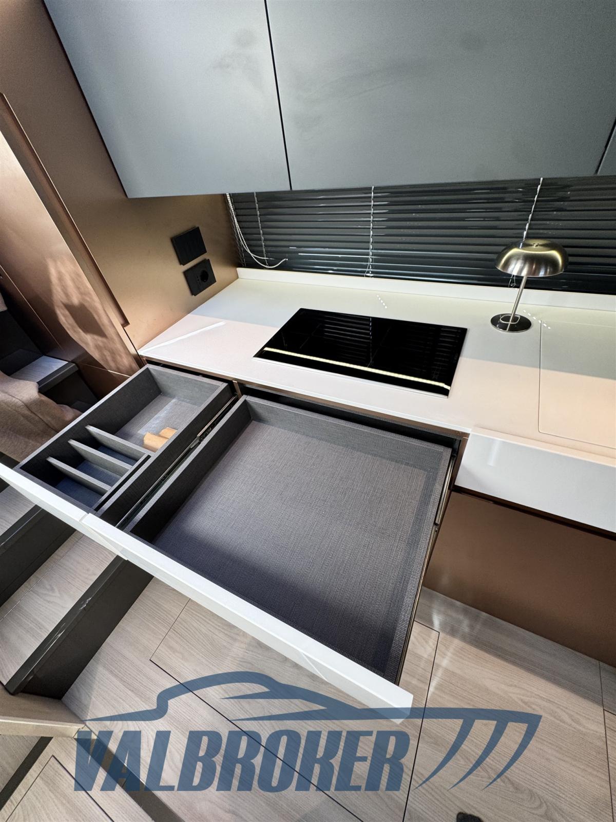Des lignes captivantes combinées à un grand pare-brise et à une excellente circulation de l’air dans le cockpit grâce au Hard Top avec ouverture à lamelles. Il offre une grande cabine propriétaire arrière pleine largeur, une élégante dînette à l’avant, transformable électriquement en véritable seconde cabine et deux salles de bains. Les intérieurs sont modernes avec des matériaux luxueux et raffinés. À l’extérieur, l’élégance du design se marie parfaitement avec l’esprit sportif de ce nouveau modèle 100 % Made in Italy.
