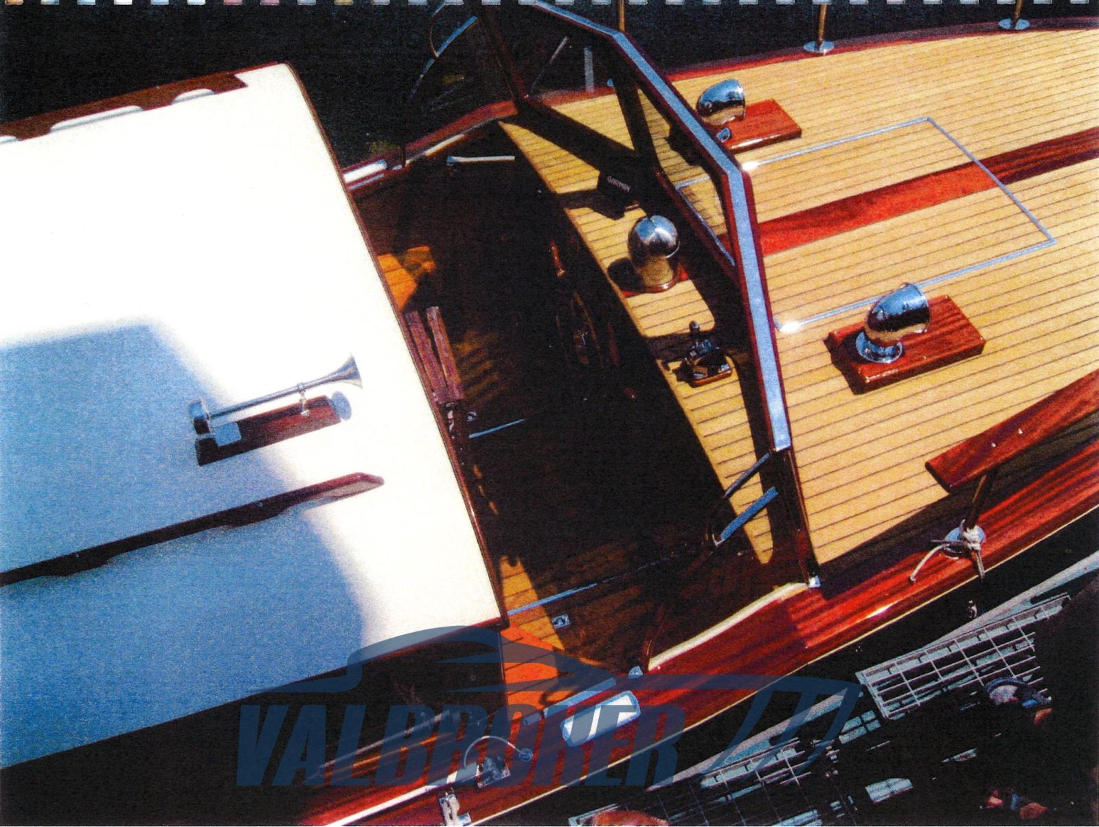 Le pare-brise d’origine qui avait disparu lors de la fermeture du tableau de bord a été reconstruit en acajou et renforcé par un cadre en acier inoxydable. L’ensemble du bord a été refait en acajou massif ainsi que les cloisons et toutes les lattes de la pièce arrière comme le pont en teck fin. La salle de bain a également été refaite ainsi que les systèmes électriques, de plomberie et de pompe de cale.