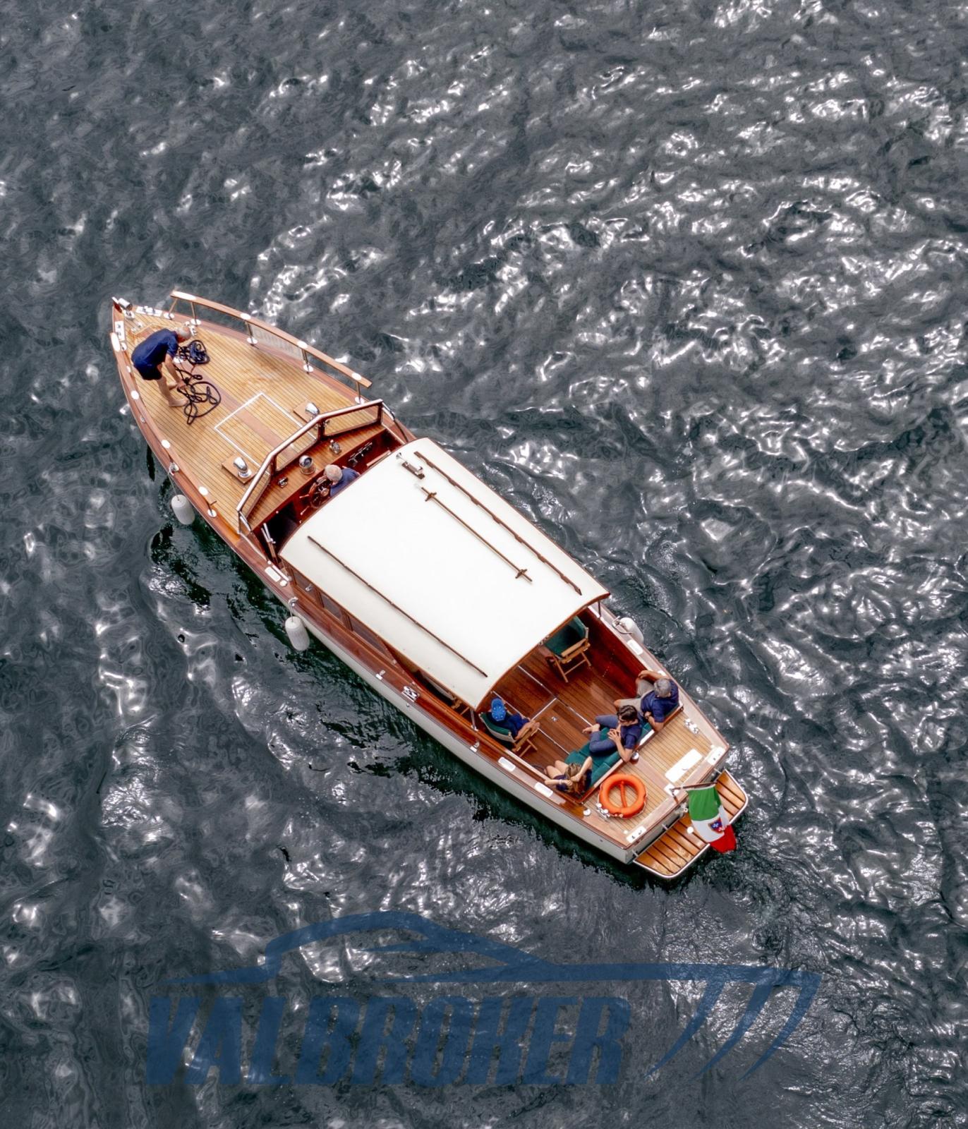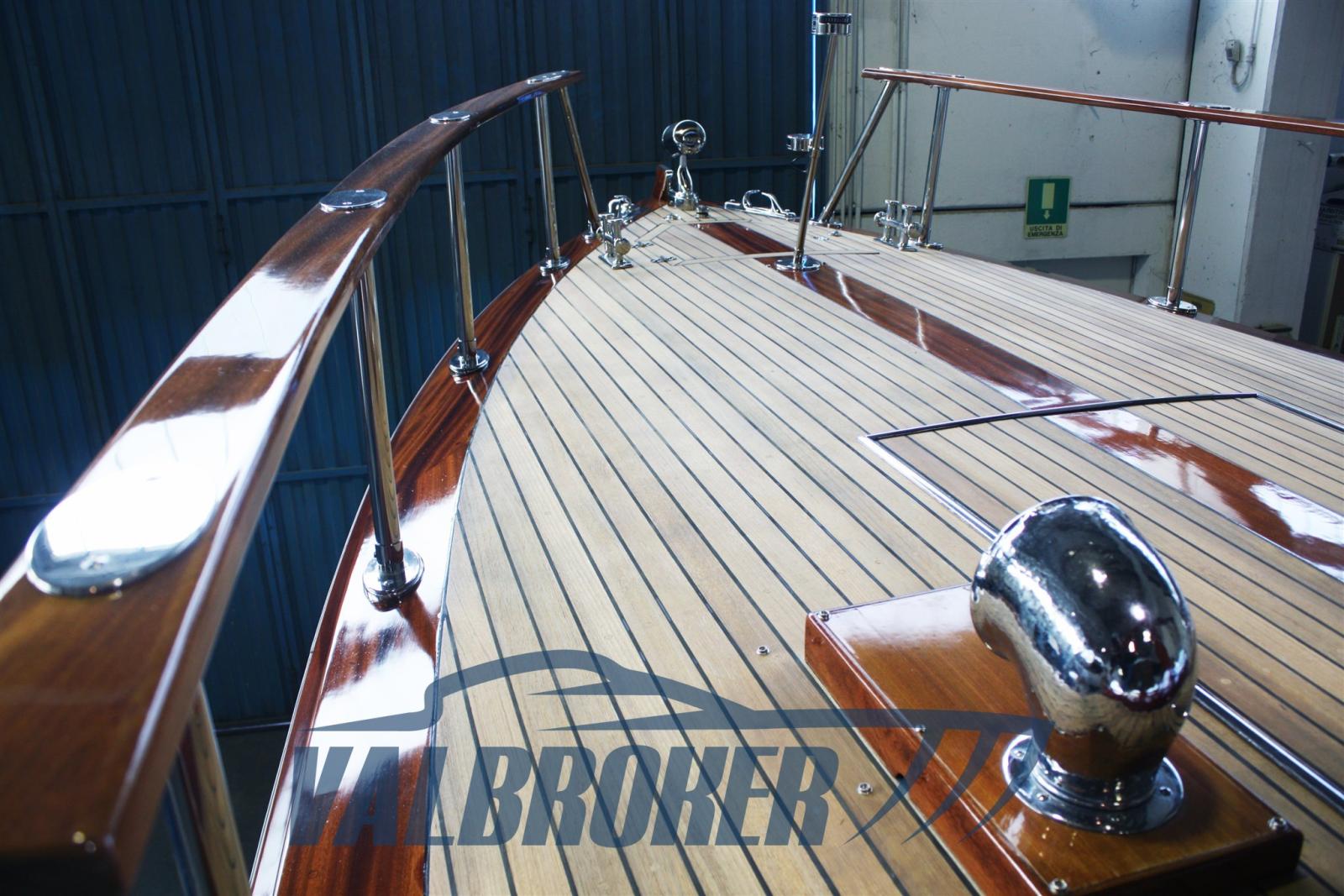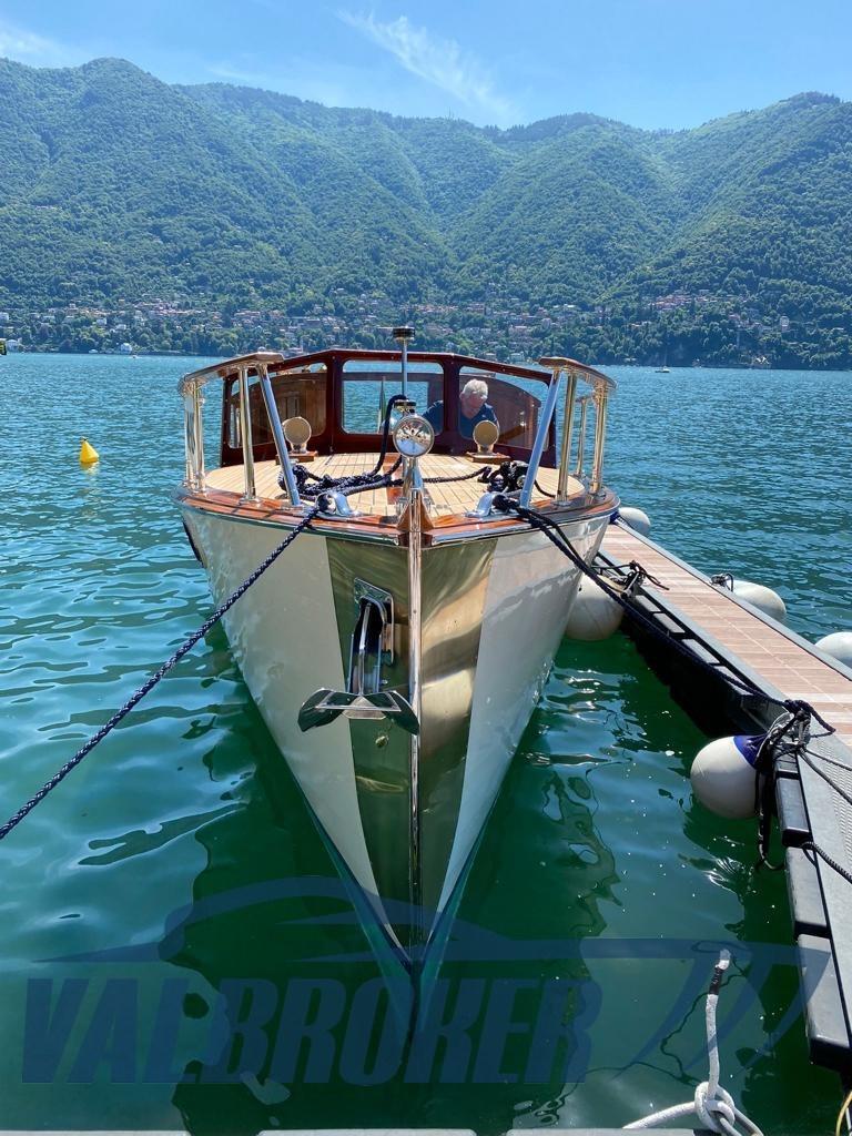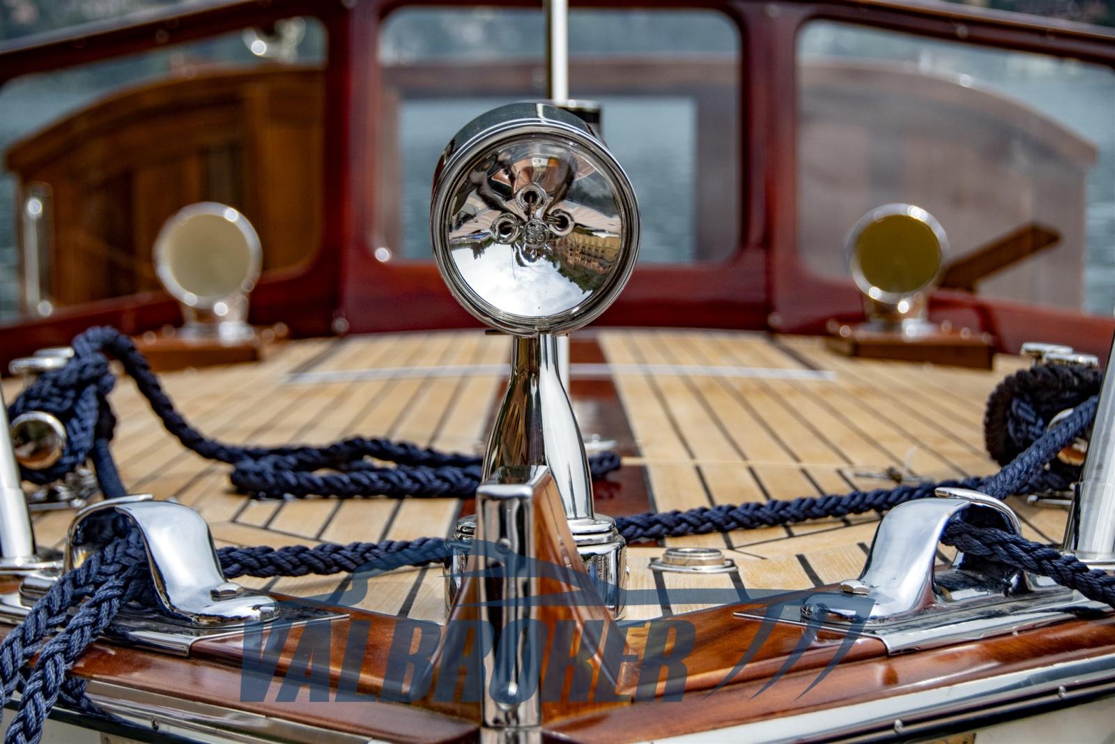 Construit dans un chantier naval anglais en 1917 comme bateau de soutien pour une Coupe de l’America en Angleterre, il s’est ensuite retrouvé en Italie. Rénové par le chantier naval Carolini Mario à Trieste en 1946 puis transféré en Sardaigne. Après avoir eu plusieurs propriétaires, le regard du dernier propriétaire fasciné par la belle étrave en forme de couteau, il a entamé une profonde opération de restauration, de 2007 à 2010, menée avec beaucoup d’habileté sur le lac de Côme. Un Yanmar léger et puissant de 110 CV avec un levier de commande électronique d’Indemar a été choisi pour le moteur et pour faciliter les manœuvres à quai, et un propulseur d’étrave électrique de Vetus a été installé. L’instrumentation est indispensable mais complète : sonar, radio VHF, boussole en inox, phare électrique à l’avant et un guindeau confortable. La restauration et la rénovation vont de pair afin de donner du charme et du confort à un bateau qui, après un siècle de vie, ne cesse d’exciter et d’exciter, aujourd’hui comme alors. Une housse sur mesure pour l’ensemble de la coque et plusieurs auvents pour le pont et la salle arrière sont fournis.