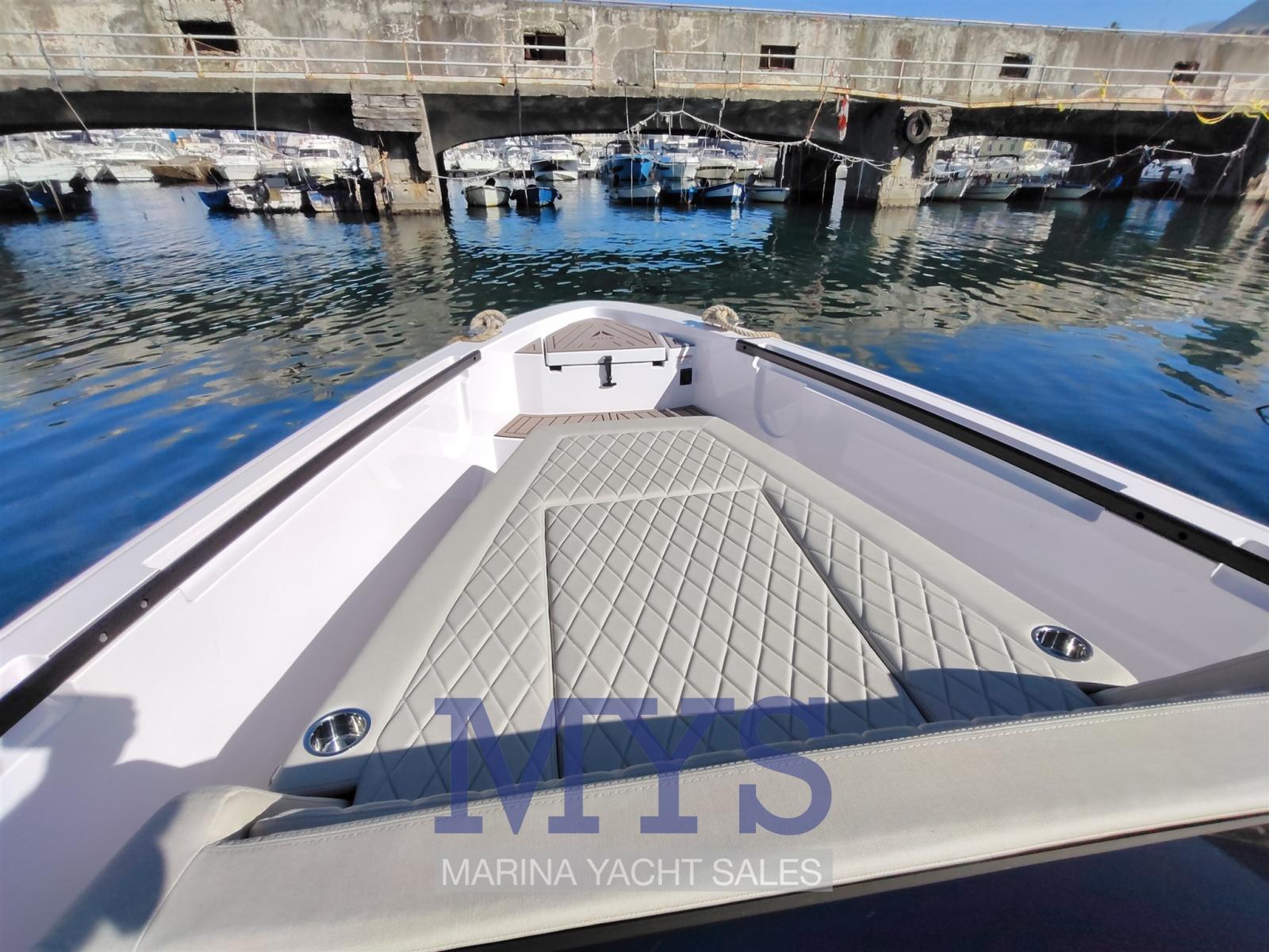 Alarme moteur, Alarme de pompe de cale, Ouverture du compartiment moteur électrique, Eau sous pression, Taquets pliants, Passavant en teck, Douche de cockpit, Flaps hydrauliques, Extincteur(s) fixe(s), Lavabo dans le cockpit, Éclairage de courtoisie, Porte latérale, Cockpit en teck, Prise de quai, Guindeau électrique, table de cockpit, Table pliante de salon (esterno), Filières avec sortie latèrale, T-Top.