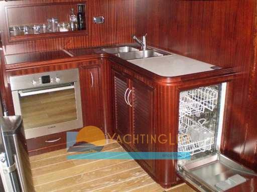 Alarme moteur, Eau sous pression, Passavant en teck, 2 Chargeur de batterie (2022), Douche de cockpit, Flaps hydrauliques, Extincteur(s) fixe(s), Indicateurs de flaps, Spots sous-marins, Passerelle (idraulica), Plateforme arrière (allungata), Pompe de cale automatique, Pompe de cale manuelle, Porte latérale, Cockpit en teck, Prise de quai, Onduleur, Guindeau électrique, Echelle de bain, Selles pour Annexe, table de cockpit, Annexe (a chiglia rigida + motore), Corne, Winch électrique arrière.