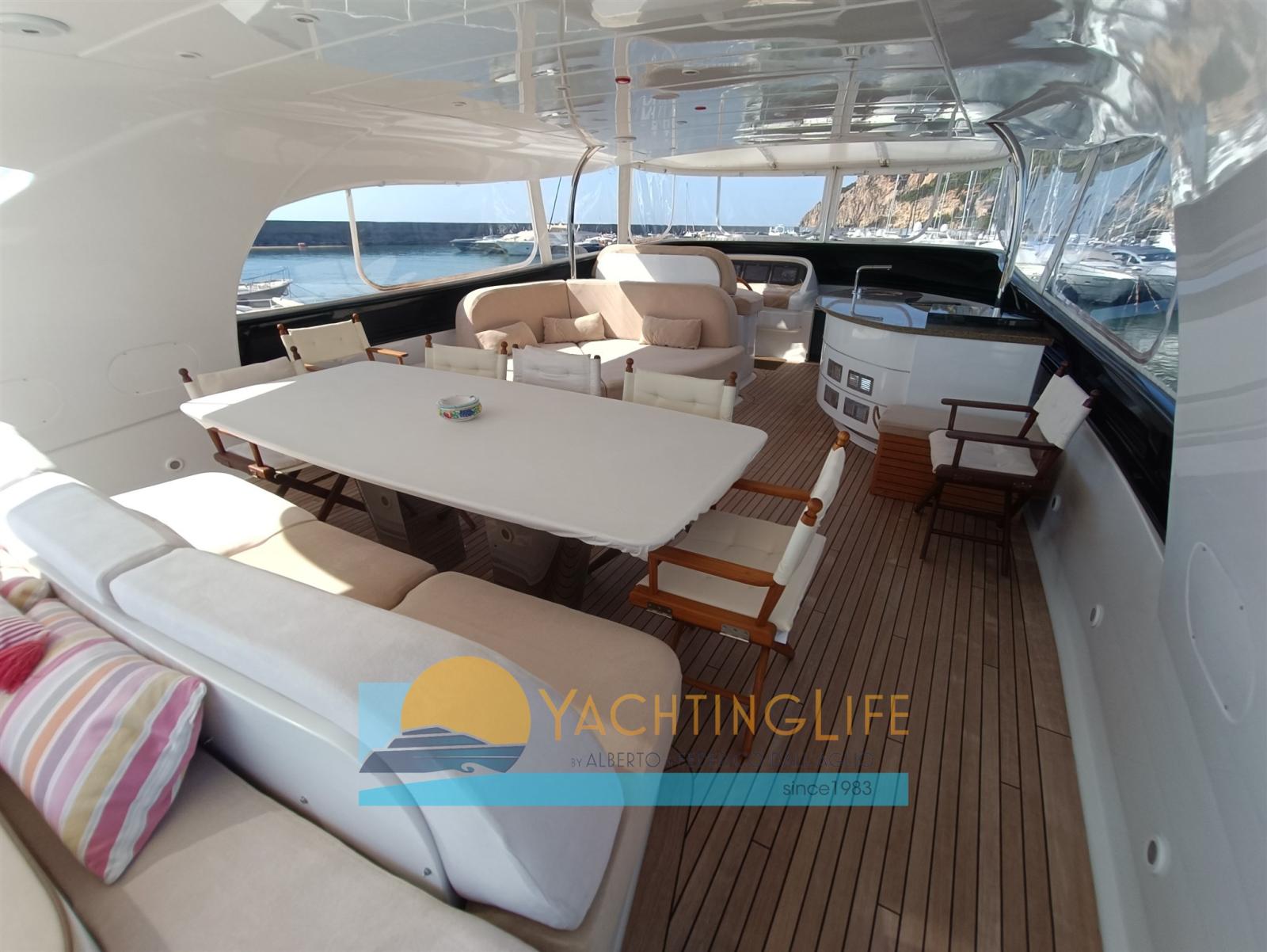 Alarme moteur, Alarme de pompe de cale, 2 Ancre, Eau sous pression, Passavant en teck, 2 Chargeur de batterie, Douche de cockpit, Double barre à roue, Propulseur de poupe (Idraulica), Propulseur d'étrave (Idraulica), Phare de poursuite, Flaps hydrauliques, Garage à annexe (A prua), Grue pour jet-ski (in carbonio a poppa), Bossoirs pour annexe (A prua), Hard top, Extincteur(s) fixe(s), Compresseur de plongée, Indicateurs de flaps, Jet Boat, Lavage de chaine, Lavabo dans le cockpit, Éclairage de courtoisie, Spots sous-marins, Passerelle (Idraulica), Plateforme arrière, Porte latérale, Porte latérale, Cockpit en teck, Prise de quai, Onduleur, 2 Guindeau électrique (Lofrans), Echelle de bain (Idraulica), Stabilisateurs (Mitsubishi Zero Speed), table de cockpit, Annexe (Williams 385 Jet), Corne, 2 Winch électrique arrière (Lofrans).