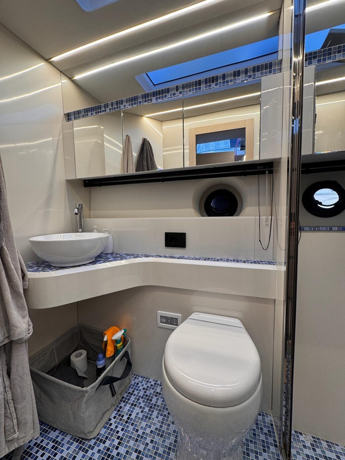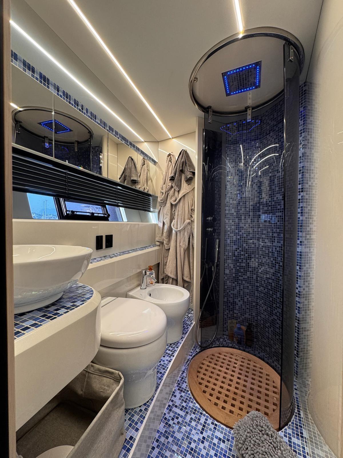 Air conditionné (camere e disimpegno notte), Coffre-fort, Contrôleur domotique, Dessalinisateur (150lt/h Schenker Zen 150), Réservoir d'eau noire, Caméra vidéo (pozzetto posteriore e sala motori), 2 Toilettes électriques (acqua dolce silenzioni).