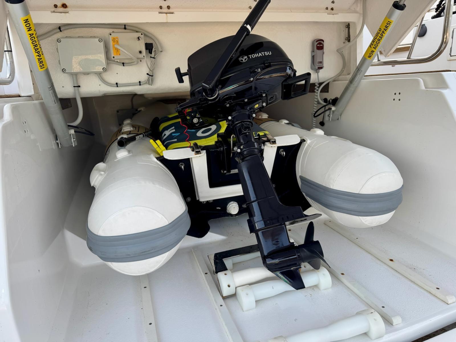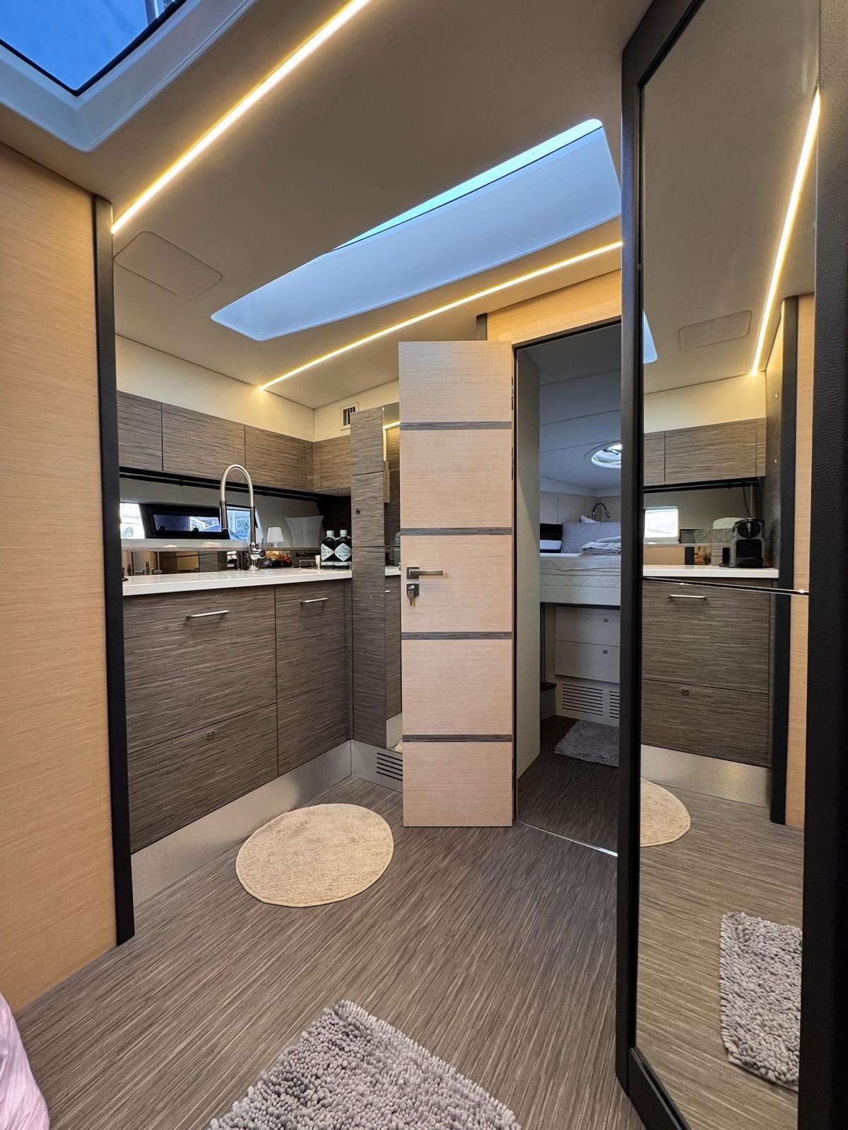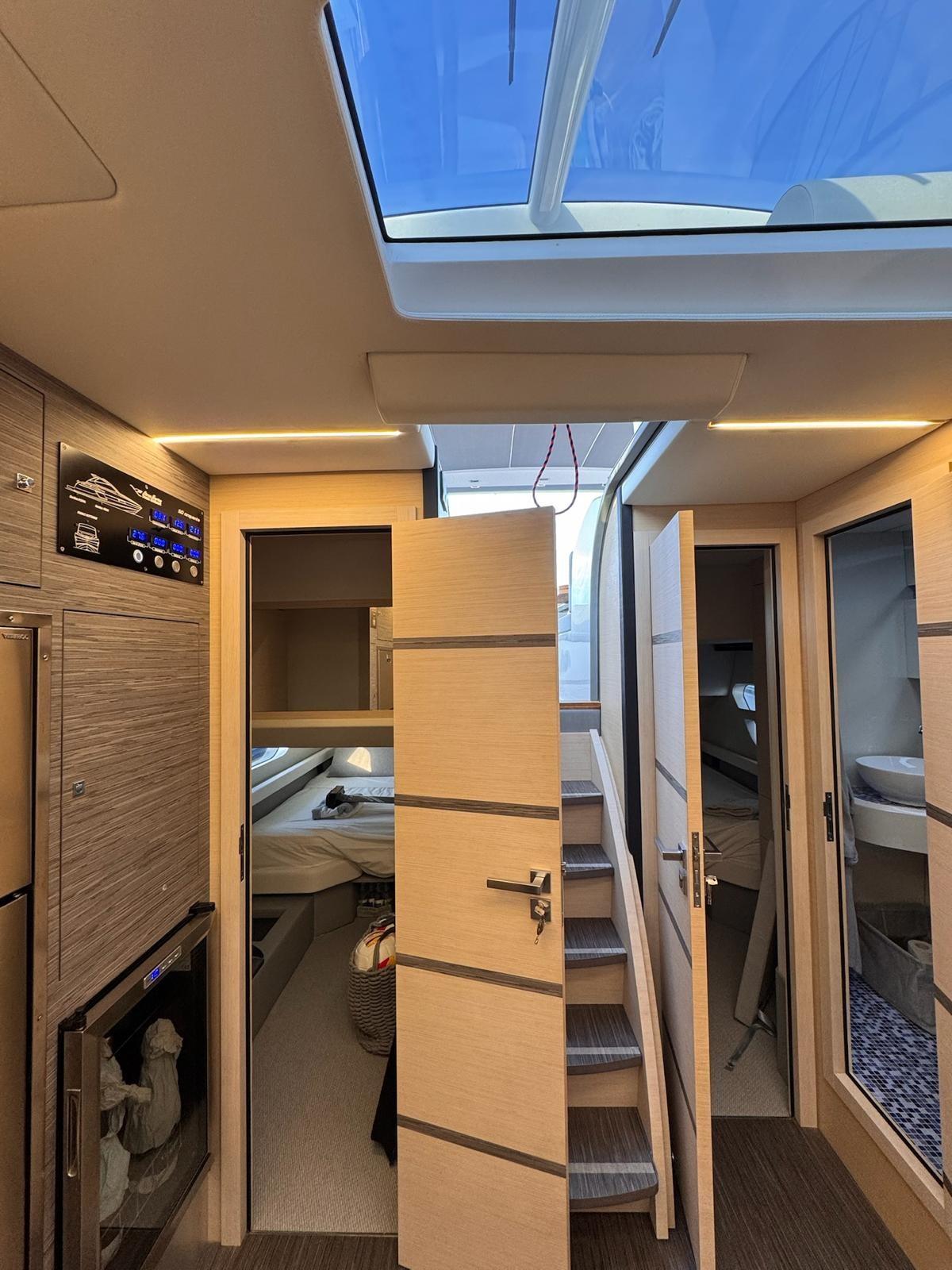 Double échelle escamotable, cuisine extérieure (avec évier, réfrigérateur, plaque à induction 4 feux et réfrigérateur), pare-brise latéral en verre, balcon en acier inoxydable avec rail de vie et taquets avant/arrière, plancher de salle de bain SICIS, système de protection contre le courant galvanique Volvo ACP, 2 cockpits en verre de 12 pieds, Volvo Interceptor avec réglage automatique + commande Cruiser, chargeurs de smartphone sans fil (un pour chaque cabine), Chargeur de batterie dédié uniquement au groupe électrogène, chaîne en acier inoxydable de 60 mètres diamètre 12 mm, couvercle de cuisine, antifouling, peinture hard top gris métallisé, entrée de carburant et d’eau fendue des deux côtés