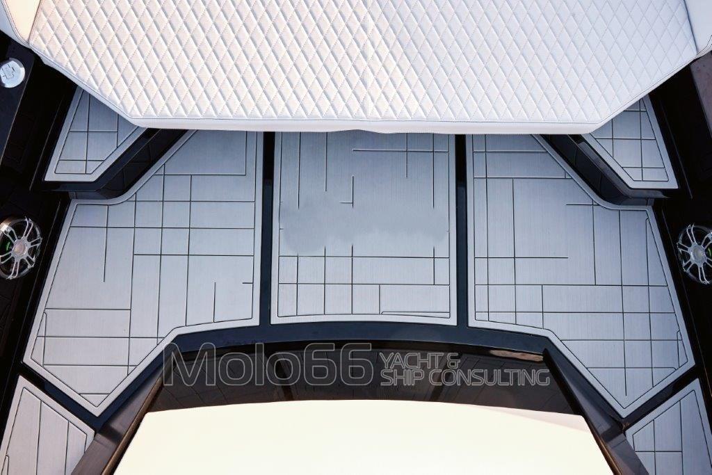 Alarme moteur, Alarme de pompe de cale, Eau sous pression, Douche de cockpit, Éclairage de courtoisie, Cockpit en teck, Prise de quai, Guindeau électrique, Echelle de bain, table de cockpit, Corne.