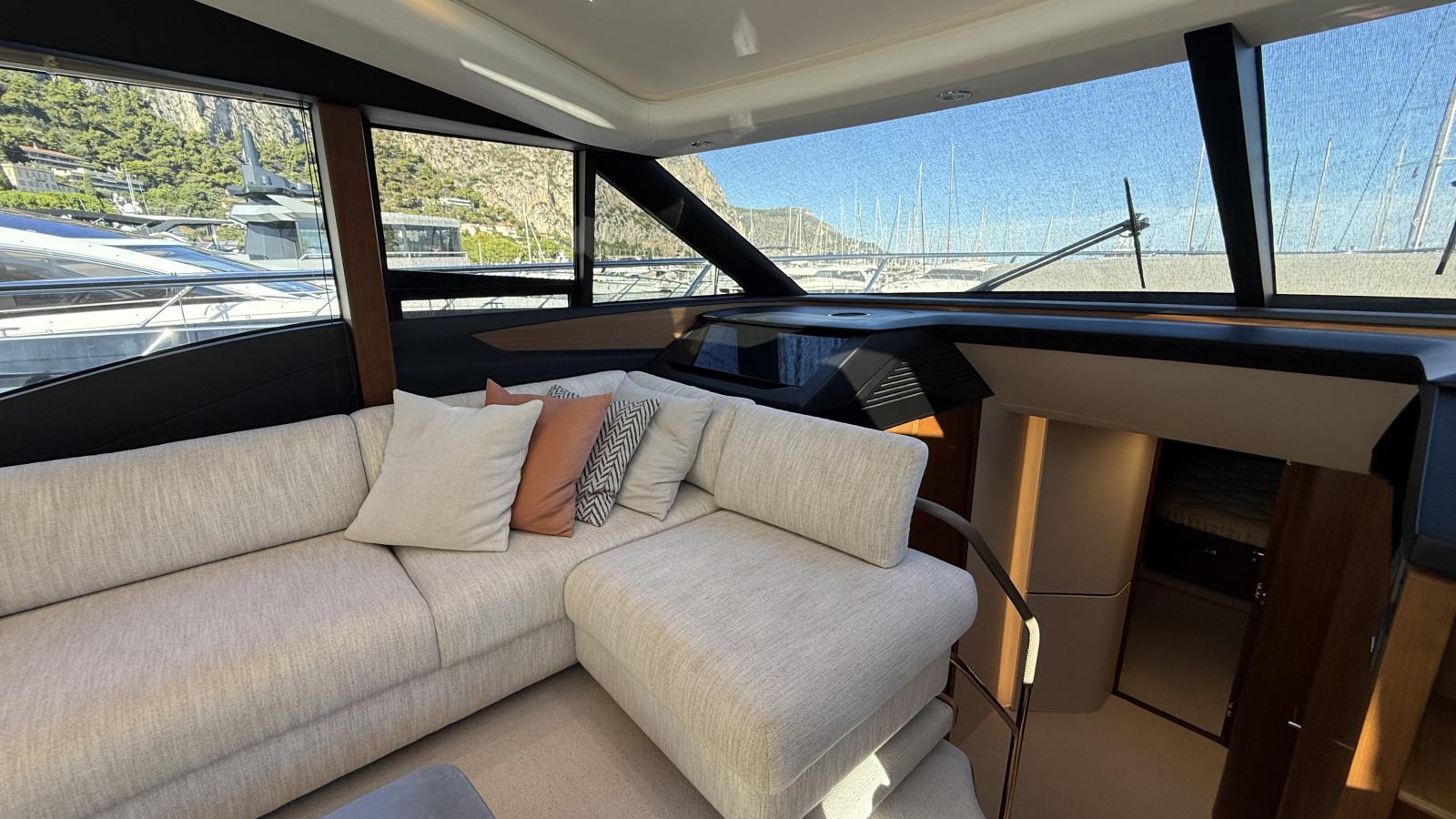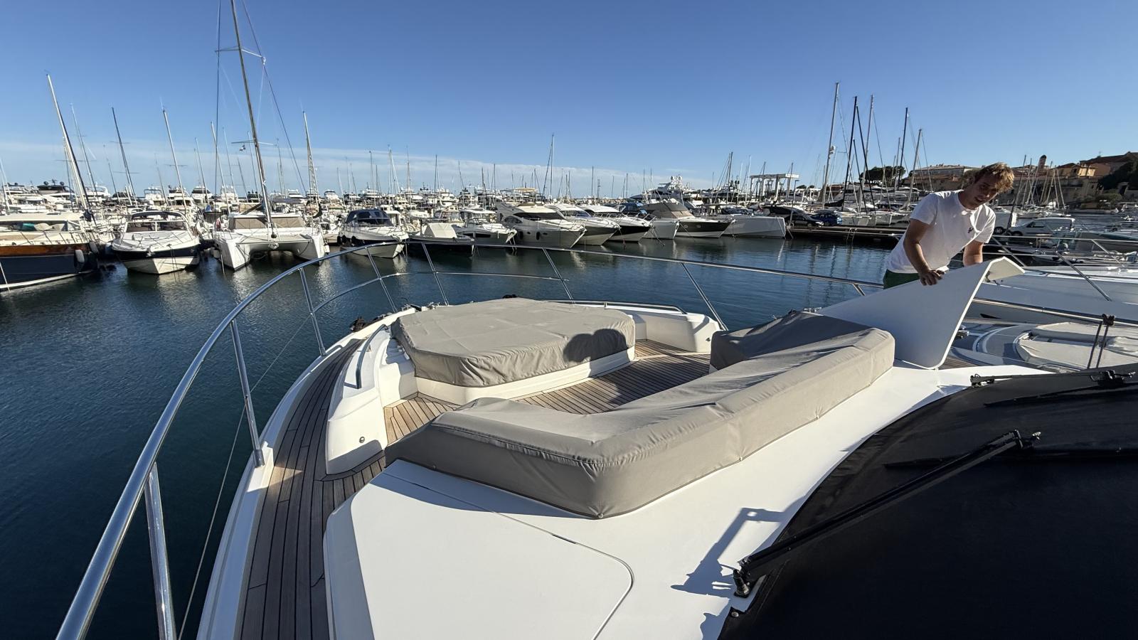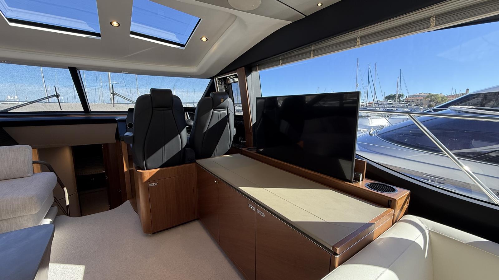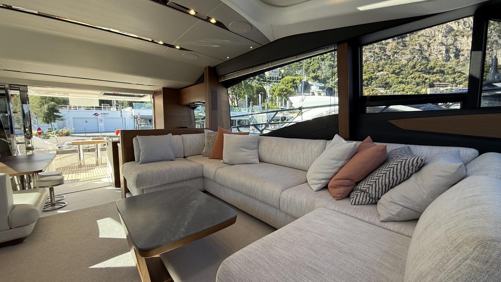 Conçu pour une vie à bord fluide entre intérieur et extérieur, son vaste cockpit arrière s’ouvre harmonieusement sur le lumineux salon principal grâce à de larges baies vitrées, créant une atmosphère conviviale et ouverte. Le flybridge propose un espace repas supplémentaire, des bains de soleil ainsi qu’une cuisine extérieure entièrement équipée, idéale pour recevoir en mer.