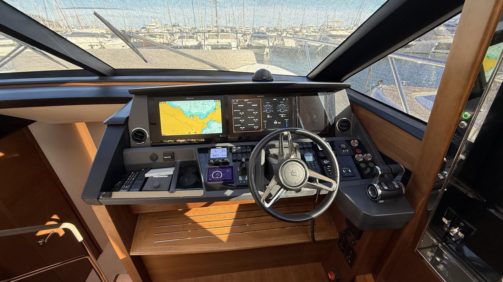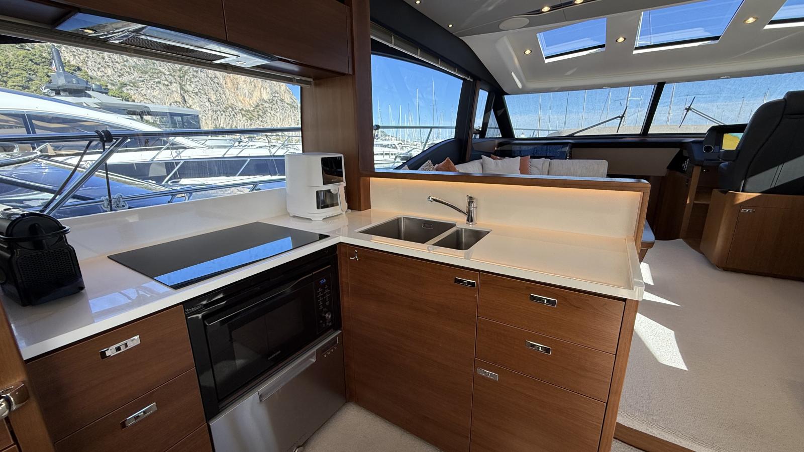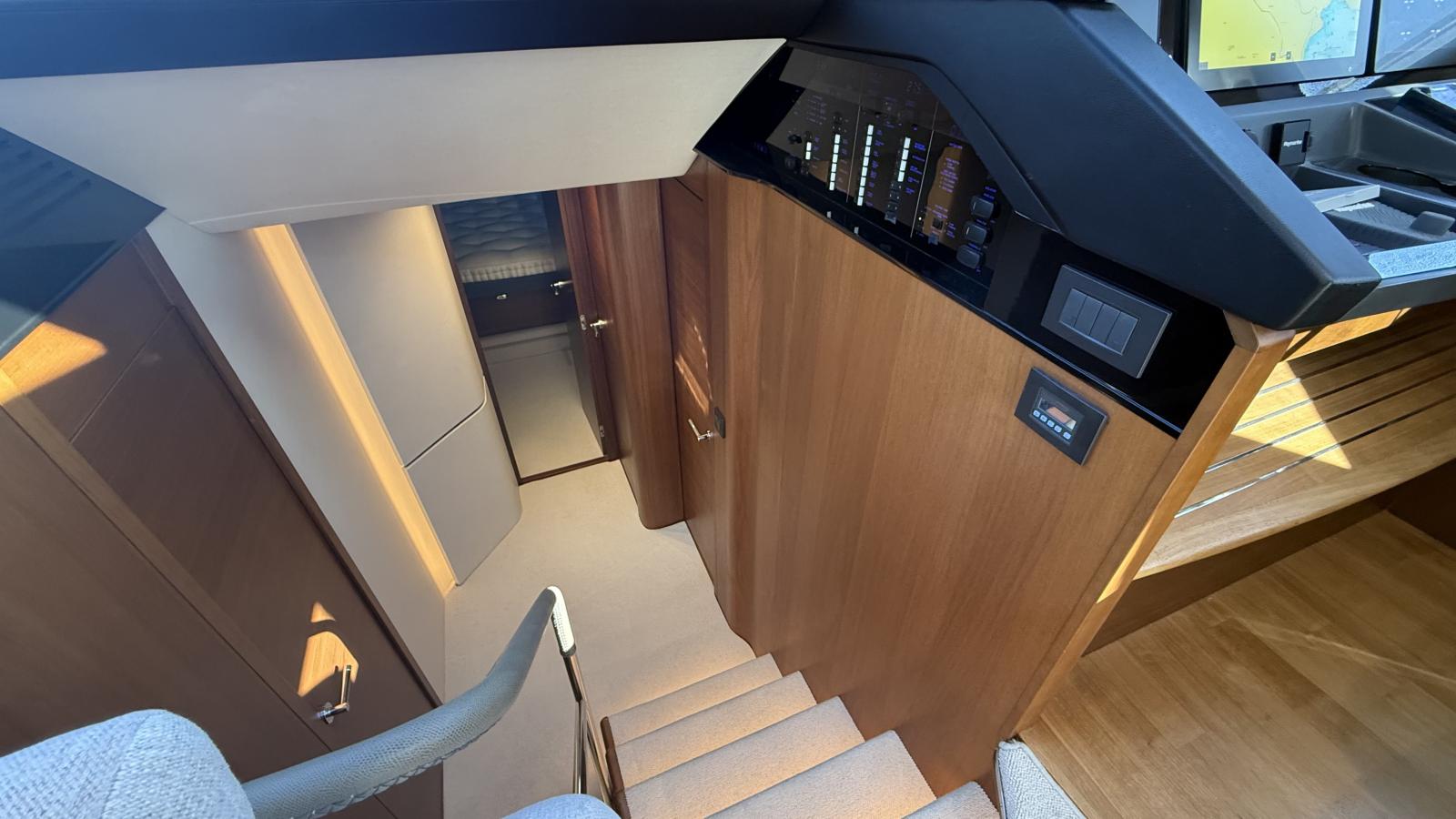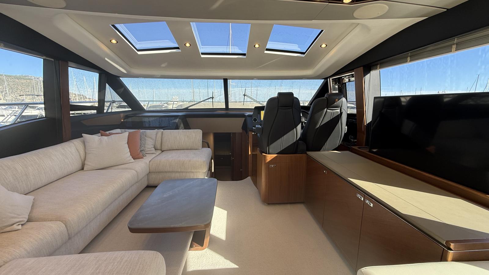 Conçu pour une vie à bord fluide entre intérieur et extérieur, son vaste cockpit arrière s’ouvre harmonieusement sur le lumineux salon principal grâce à de larges baies vitrées, créant une atmosphère conviviale et ouverte. Le flybridge propose un espace repas supplémentaire, des bains de soleil ainsi qu’une cuisine extérieure entièrement équipée, idéale pour recevoir en mer.