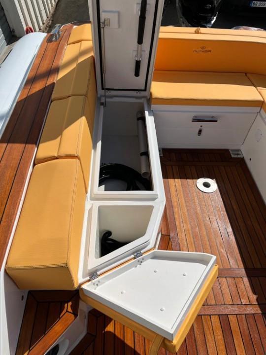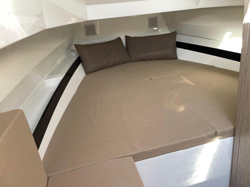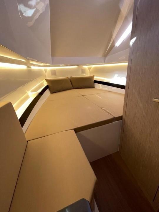 Dès le premier regard, son cabine parfaitement aménagée invite au bien-être, tandis que ses deux bains de soleil, à l’avant et à l’arrière, prolongent l’espace de détente. À l’arrière, le bain de soleil se transforme aisément en coin repas grâce à une table télescopique intégrée.