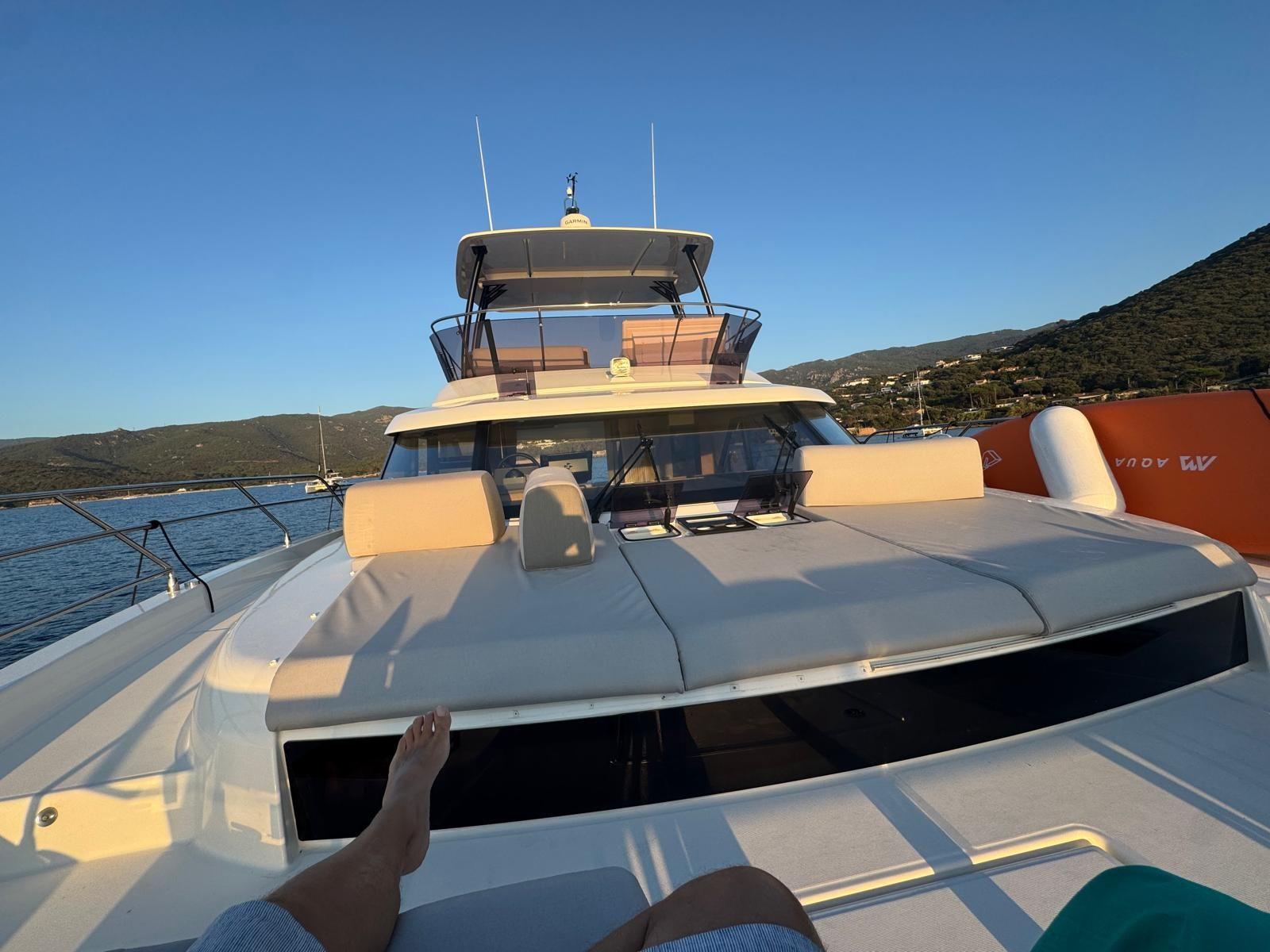Joystick Docking Volvo - Housses de protection dans le cockpit : canapés et tables en bois massif - Housses de protection au Fly : canapés, siège pilote et console, table bois massif - Convertisseur 2000 W - Grill et réfrigérateur au Fly - Générateur 11KVA PLUS : - Plateforme de bain centrale multi positions en teck avec supports annexes intégrés - Cabestan électrique pour amarrage bâbord - Système de pompe électrique de lavage de pont - Prise d'eau de quai.
