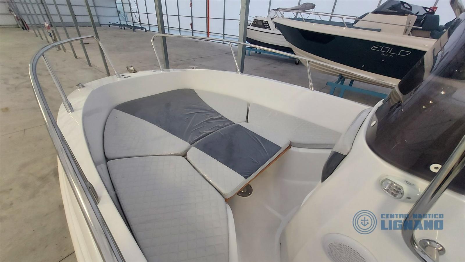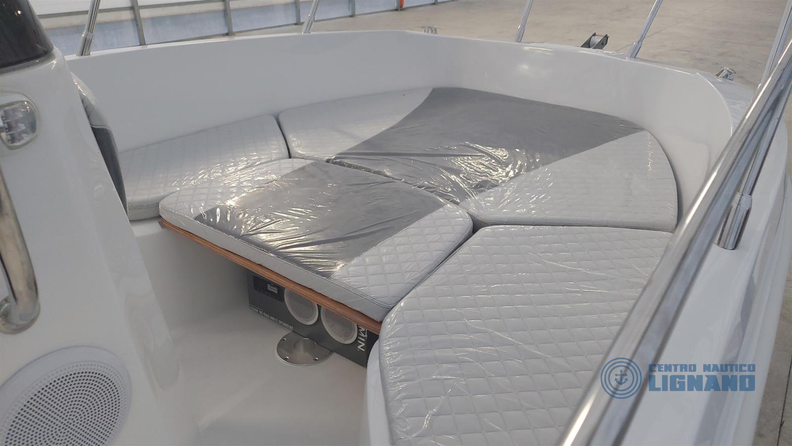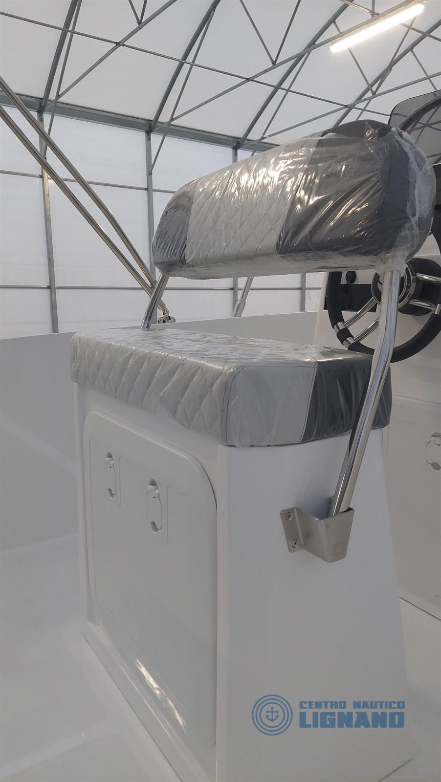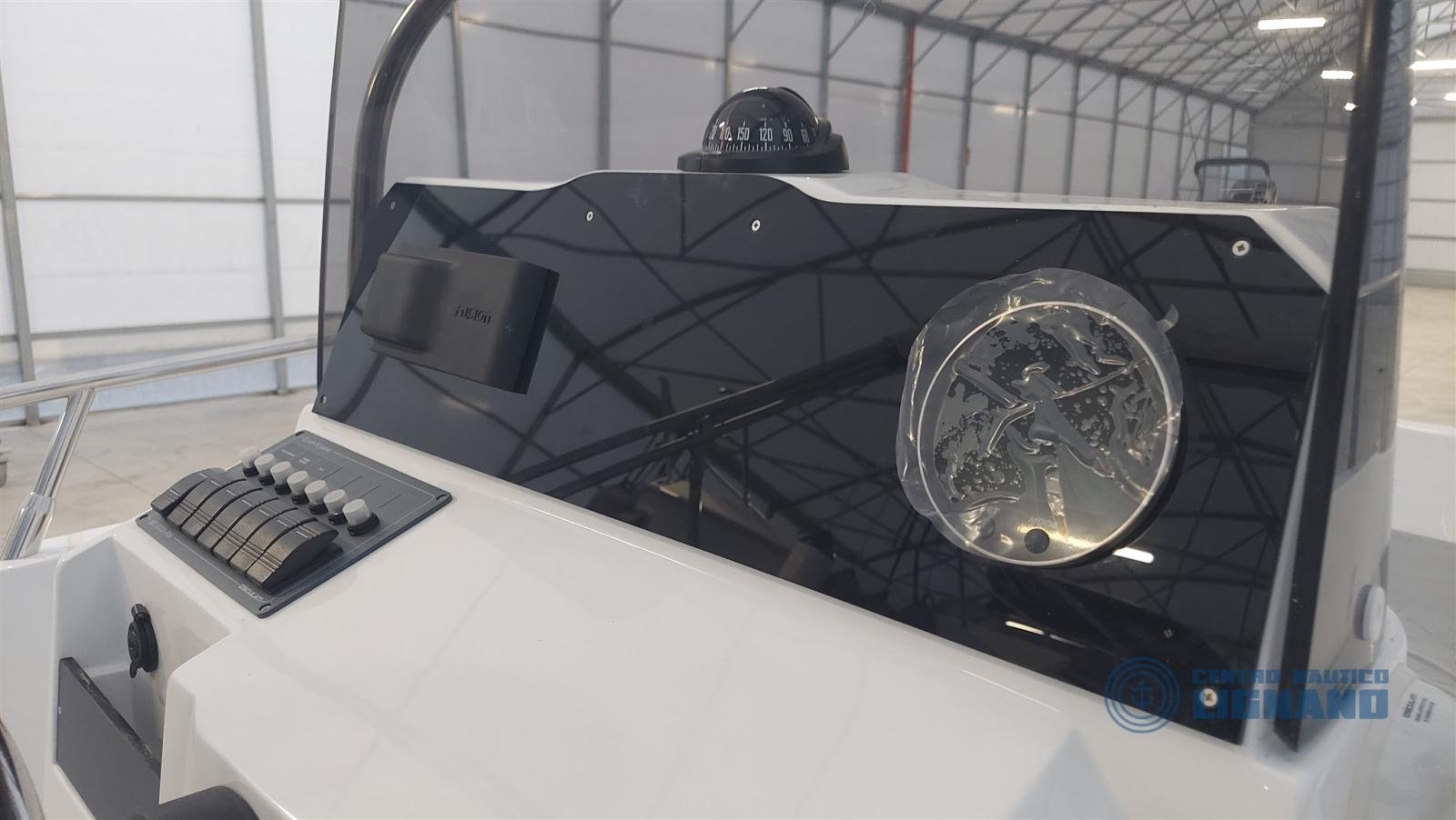 coussins gris bicolores, bain de soleil avant, timonerie mécanique, feux de navigation et d’ancre, échelle marine, système d’autovidange et de pompe de cale, système de batterie 12V avec boîte, interrupteur de batterie, compas dans la console, auvent en acier inoxydable, réservoir de carburant fixe 82 lt, prise 12V dans la console, système stéréo Fusion avec 2 haut-parleurs, panneau utilisateur 12V, couleur FIANCA DARK GREY, lumières de courtoisie (4) dans les allées, filtre à carburant inspectable, moniteur moteur SVH85
