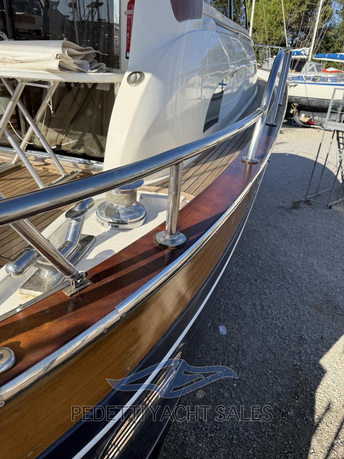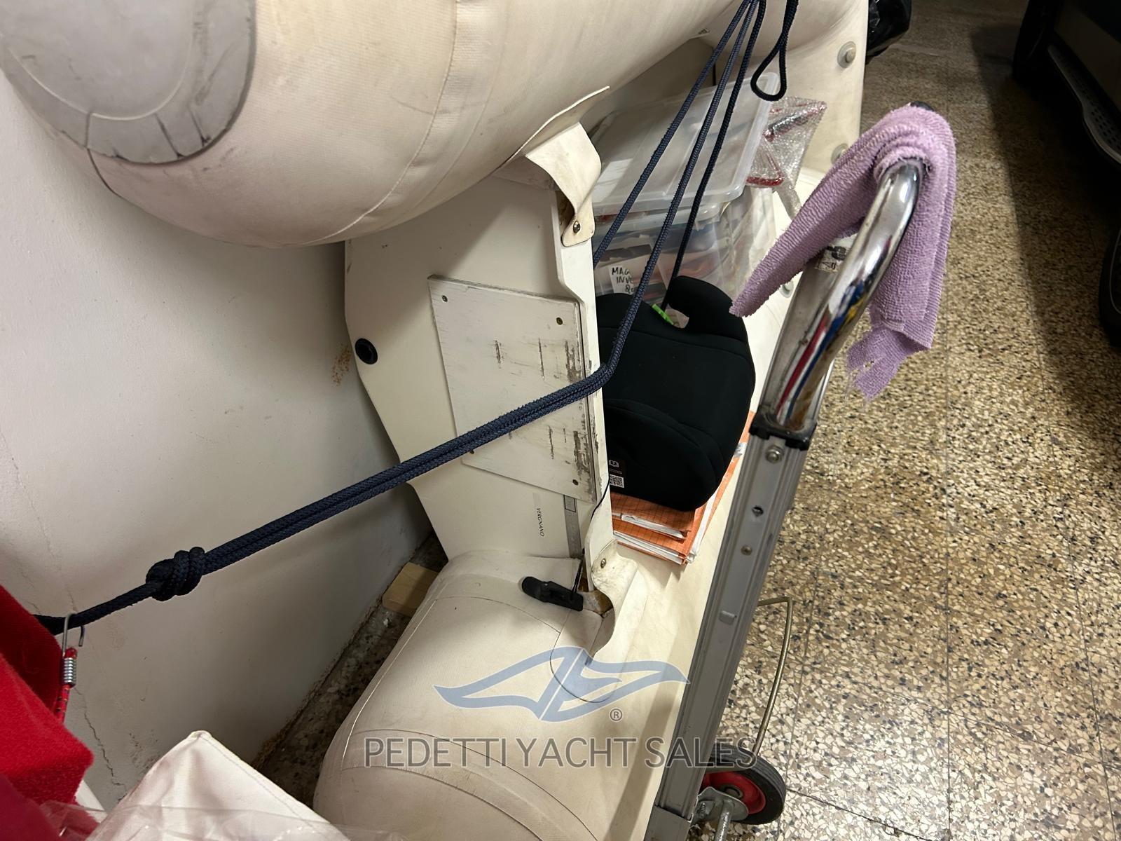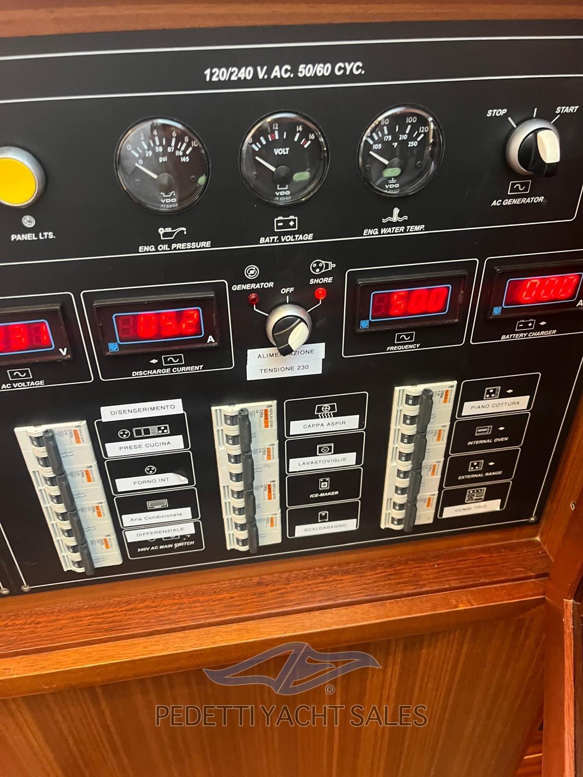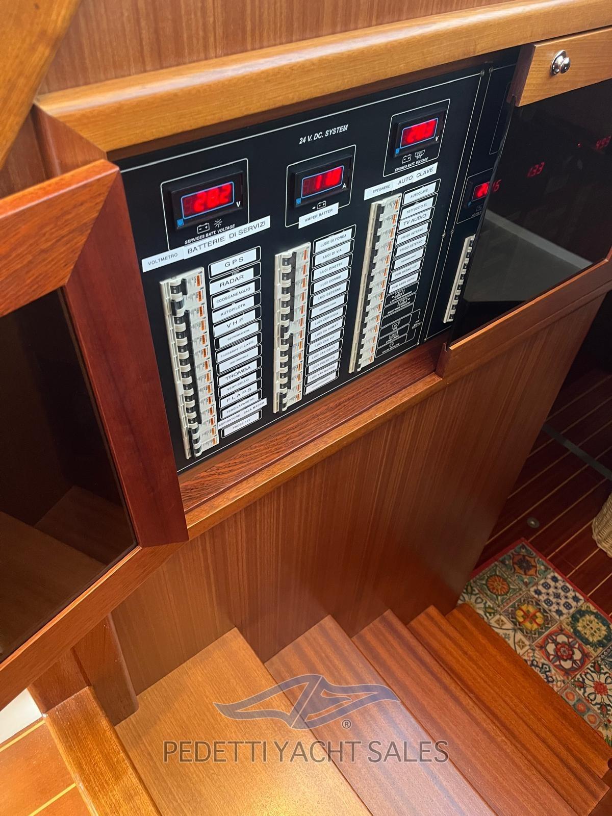 Alarme gaz, Alarme moteur, Eau sous pression, Passavant en teck, Câble d’alimentation à quai, Filière, Douche de cockpit, Flaps électriques, Éclairage de courtoisie, Moteur hors-bord pour annexe, Défenses, Passerelle (IDRAULICA), Pompe de cale automatique, Pompe de cale manuelle, Porte latérale, Cockpit en teck, Prise de quai, Connexion eau sous pression à quai, Guindeau électrique, Echelle de bain, table de cockpit, Corne, Winch électrique arrière.