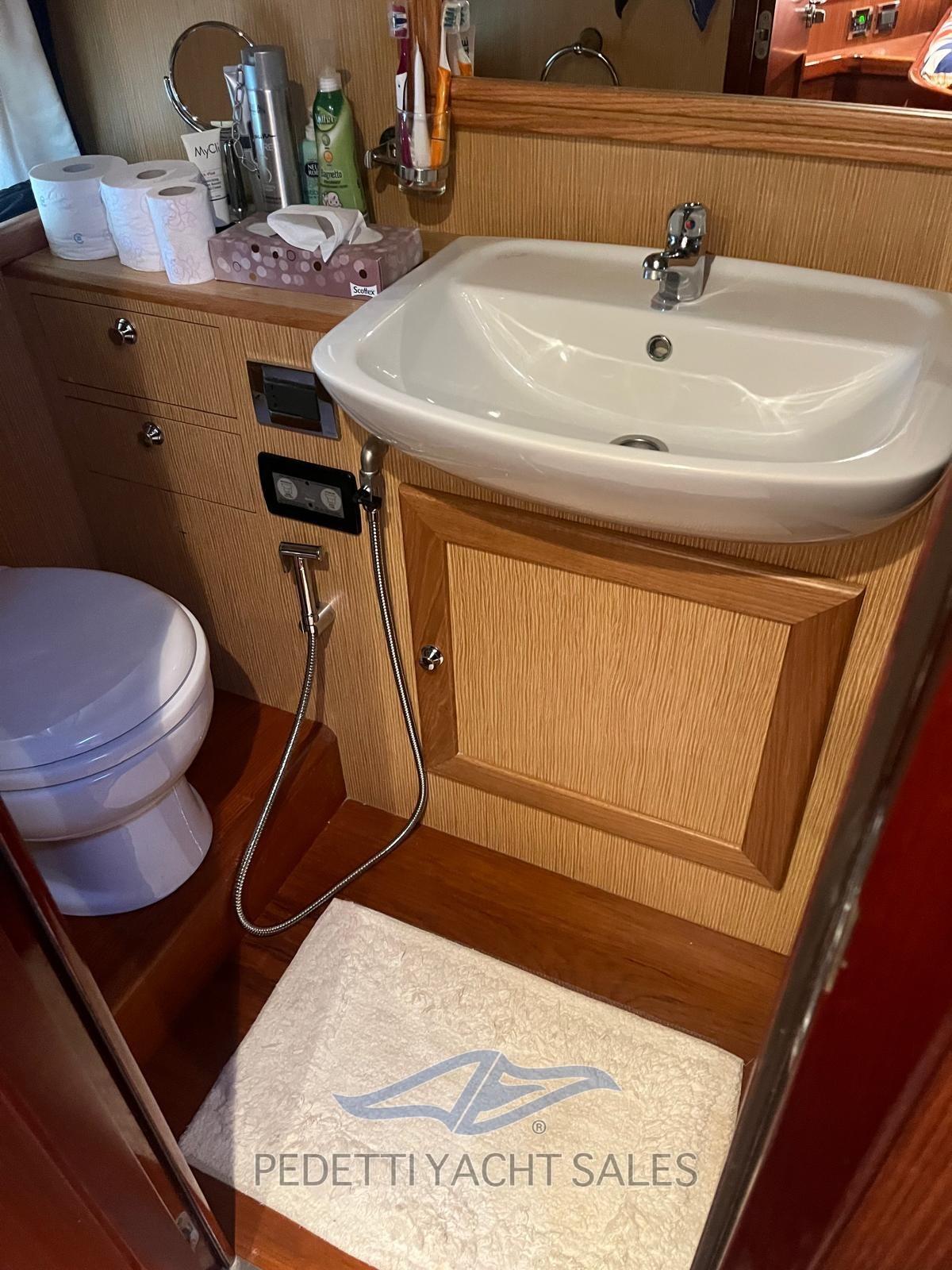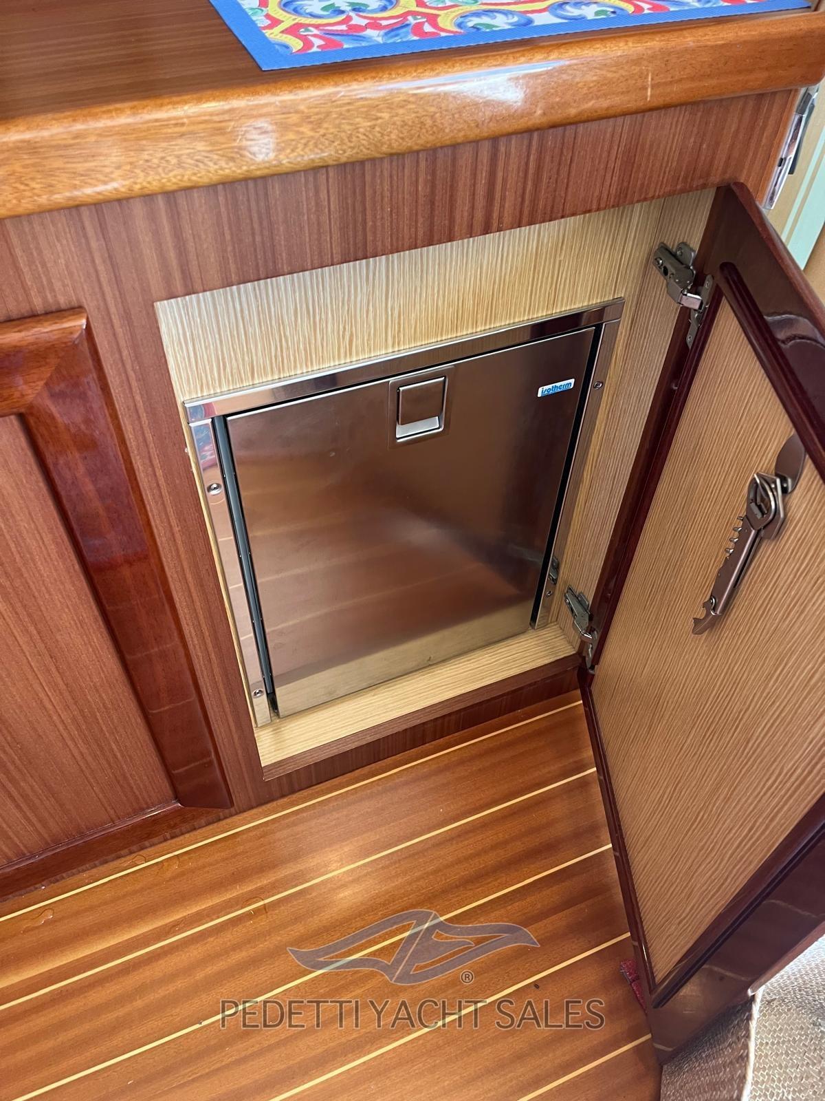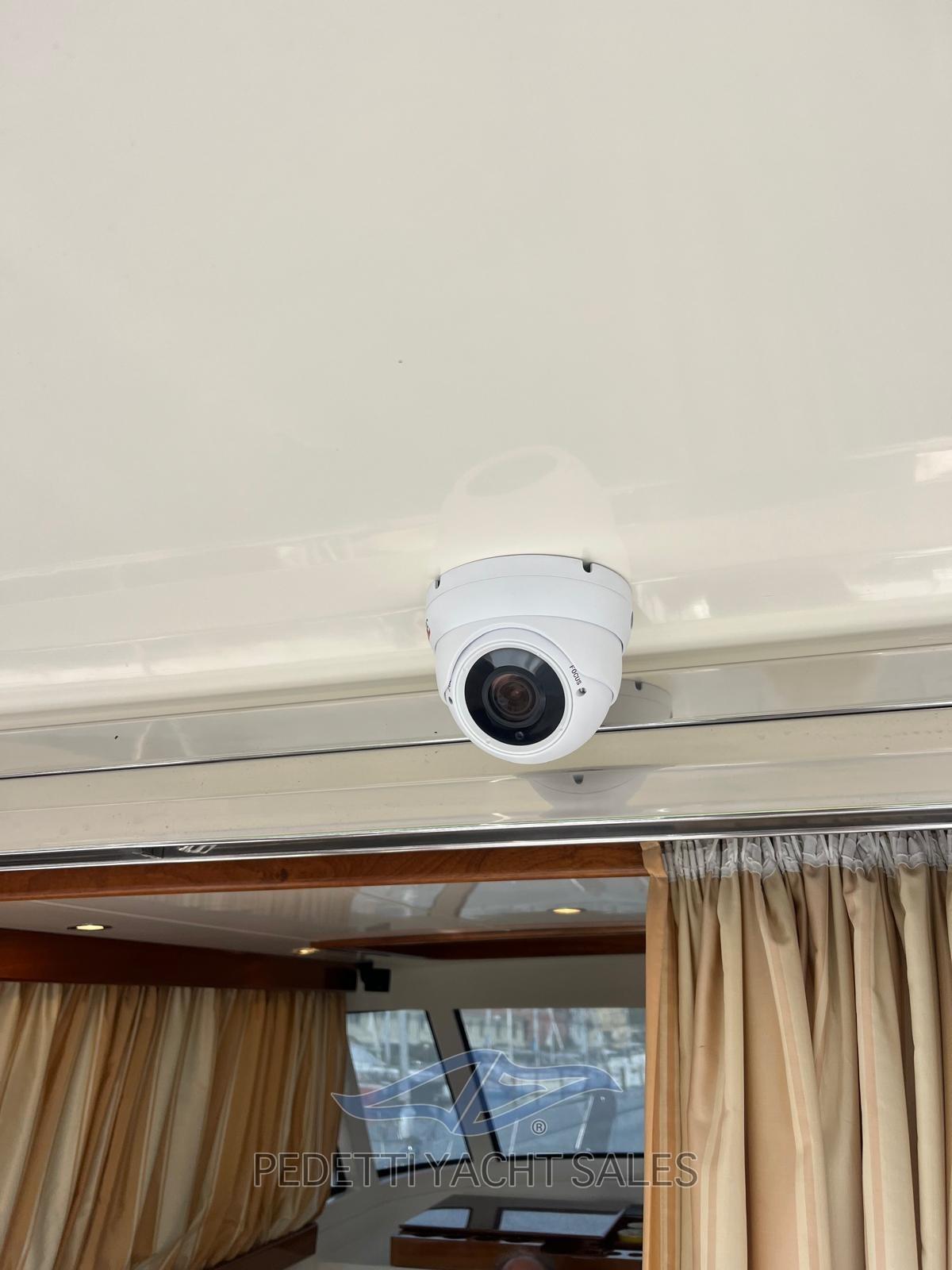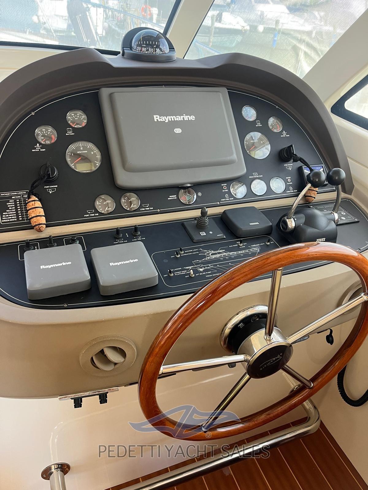 Alarme gaz, Alarme moteur, Eau sous pression, Passavant en teck, Câble d’alimentation à quai, Filière, Douche de cockpit, Flaps électriques, Éclairage de courtoisie, Moteur hors-bord pour annexe, Défenses, Passerelle (IDRAULICA), Pompe de cale automatique, Pompe de cale manuelle, Porte latérale, Cockpit en teck, Prise de quai, Connexion eau sous pression à quai, Guindeau électrique, Echelle de bain, table de cockpit, Corne, Winch électrique arrière.