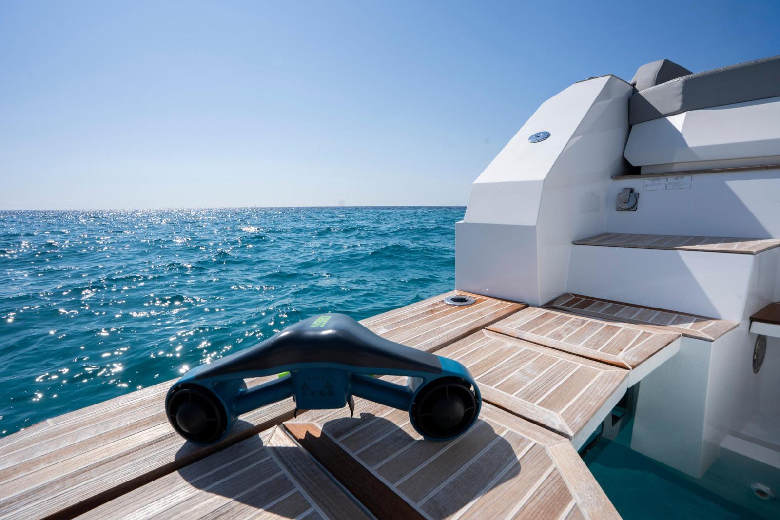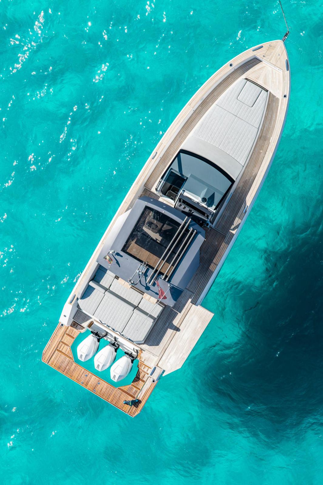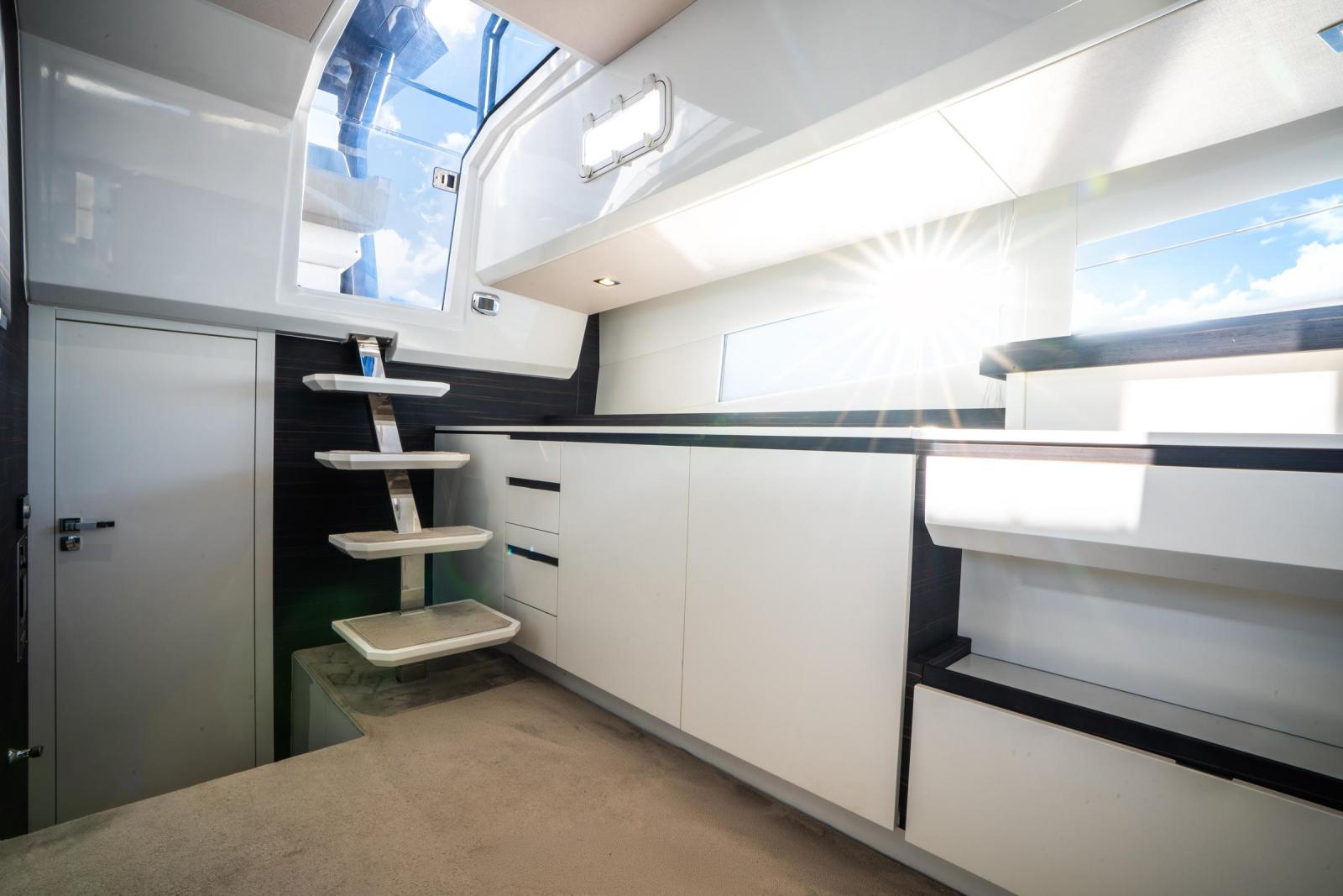 Le poste de pilotage est doté d’un tableau de bord élégant en finition gris brillant, de trois assises semi-assises/debout et d’un système Garmin Glass Helm GPSMAP 8600, garantissant une navigation précise et un contrôle aisé. Propulseur d’étrave et système de flaps Zipwake complètent une prise en main fluide et sans effort.