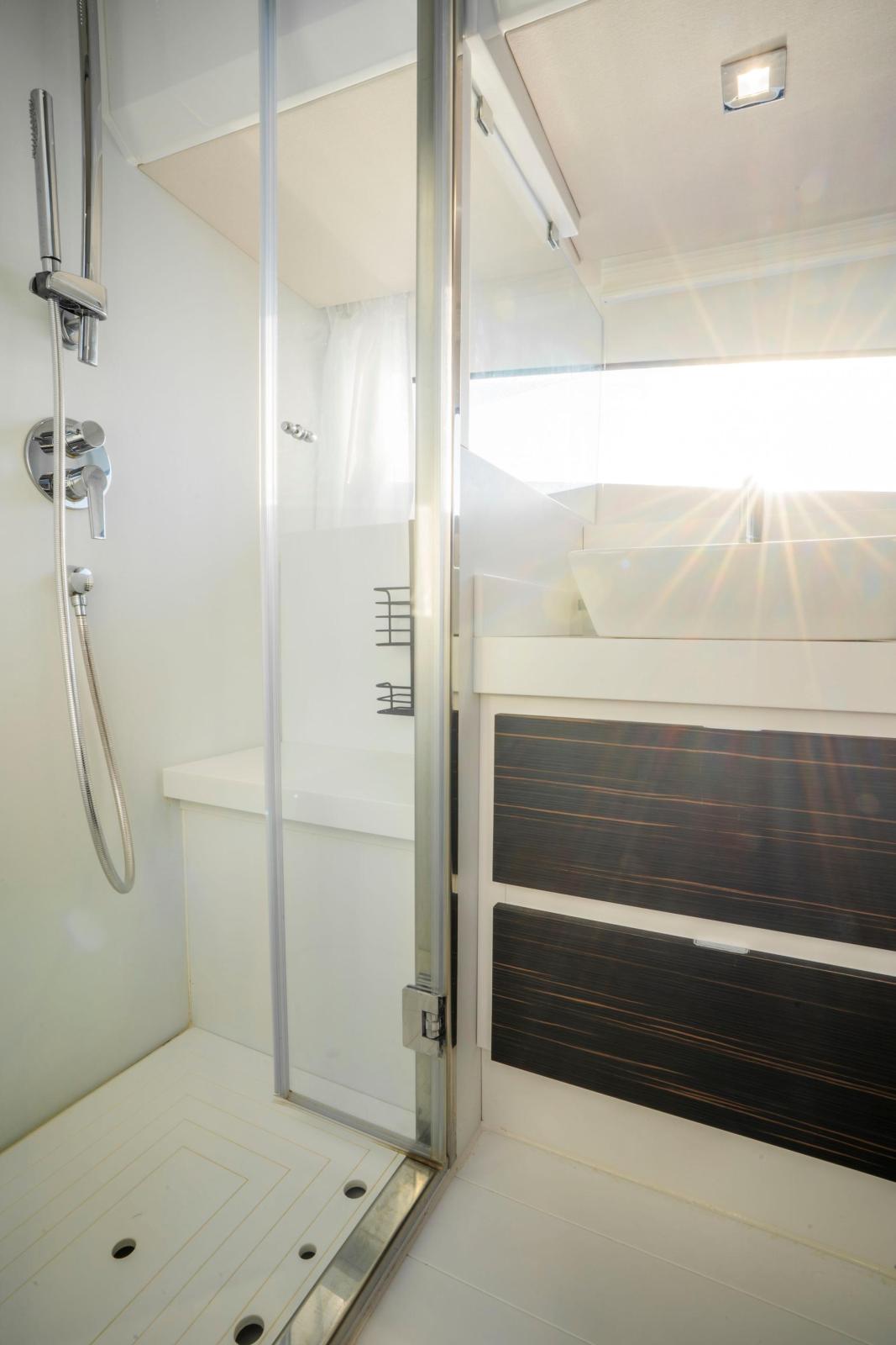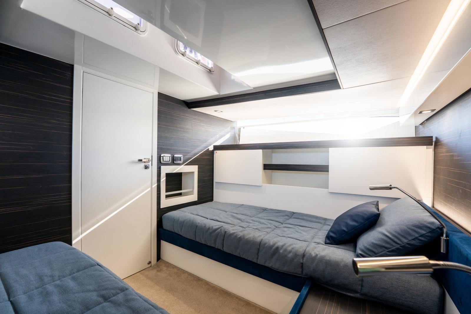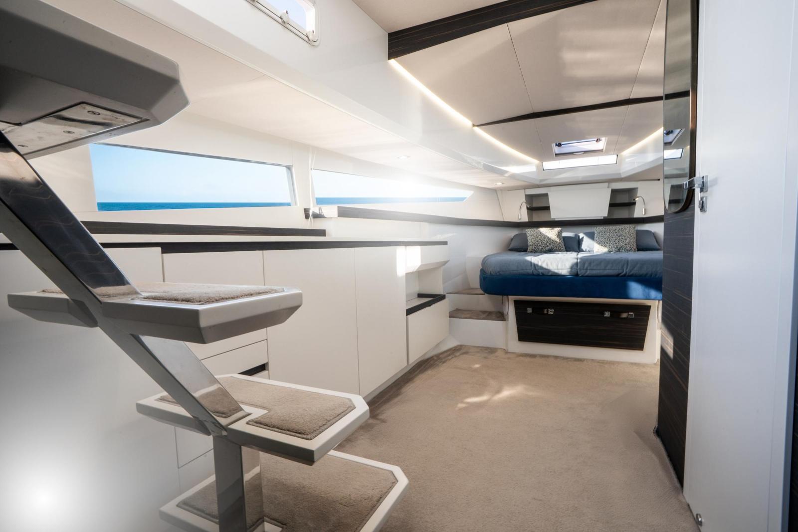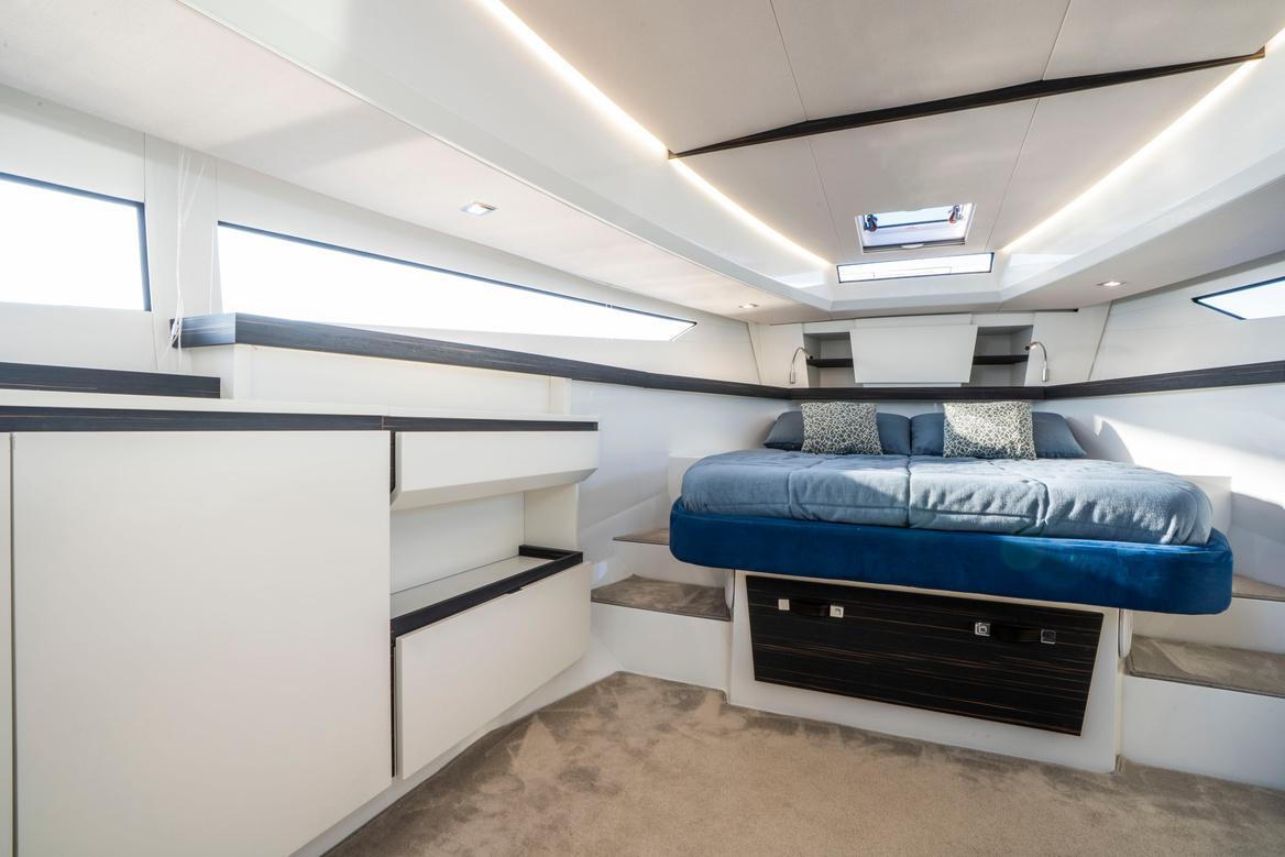 Sous le pont, le 39 SW surprend par son volume intérieur généreux pour un bateau de cette taille, ce qui le rend idéal pour des escapades le temps d’un week-end. La cabine propriétaire dispose d’un lit double et de solutions de rangement raffinées, tandis que la cabine twin bénéficie d’une belle hauteur sous barrots et de lumière naturelle. Une salle d’eau indépendante, entièrement équipée avec douche séparée, apporte confort et praticité. Avec la climatisation, un système audio Fusion et une Smart TV Samsung, le yacht combine luxe et commodité.