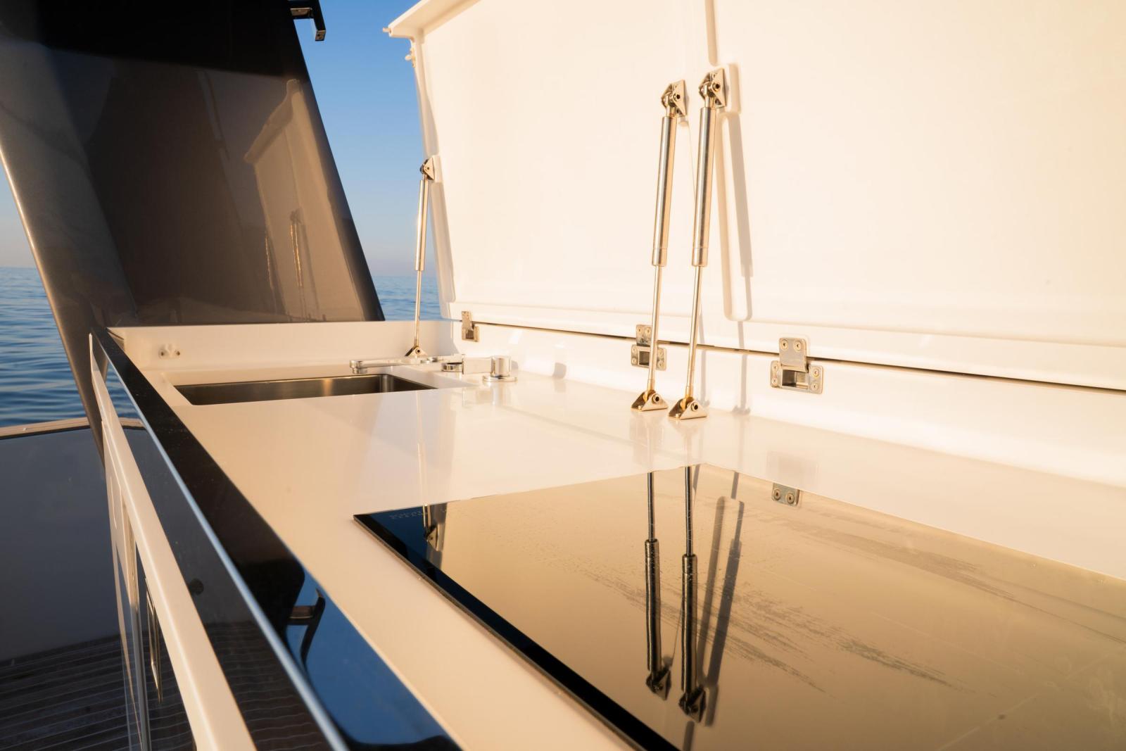 Wet bar de cockpit avec plaque à induction, double réfrigérateur (dont un avec tiroir congélateur) et évier