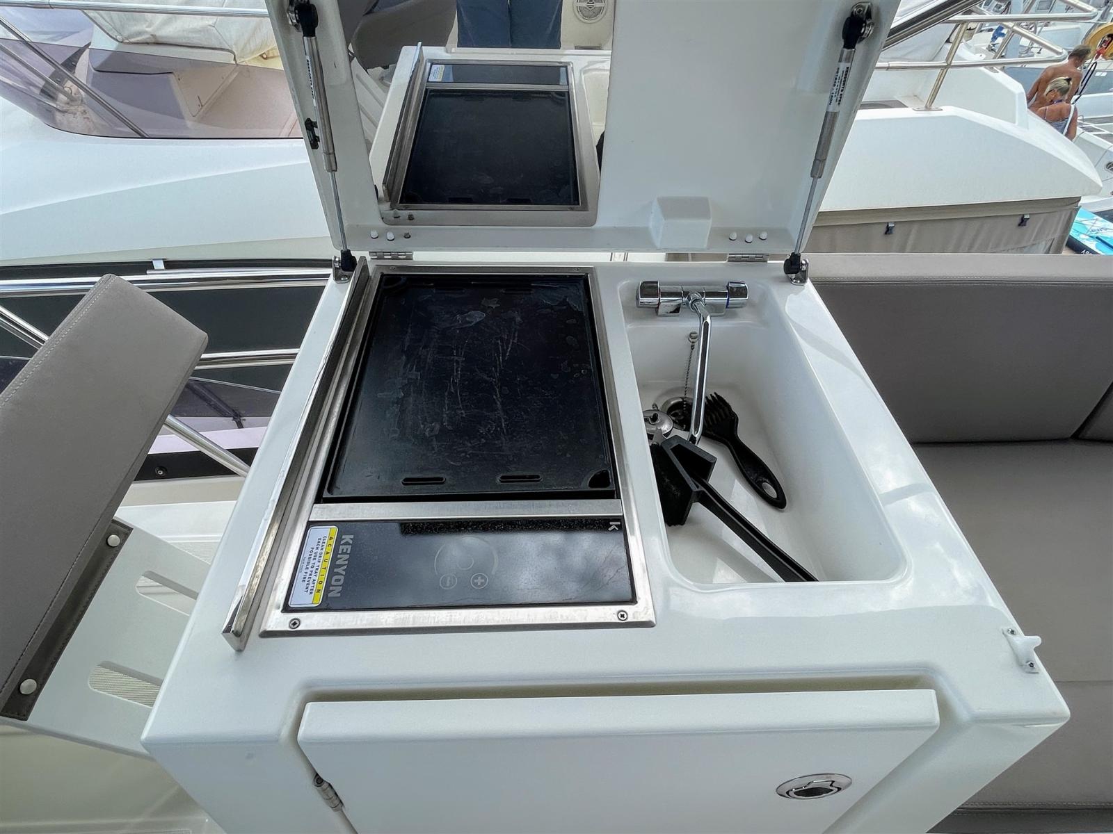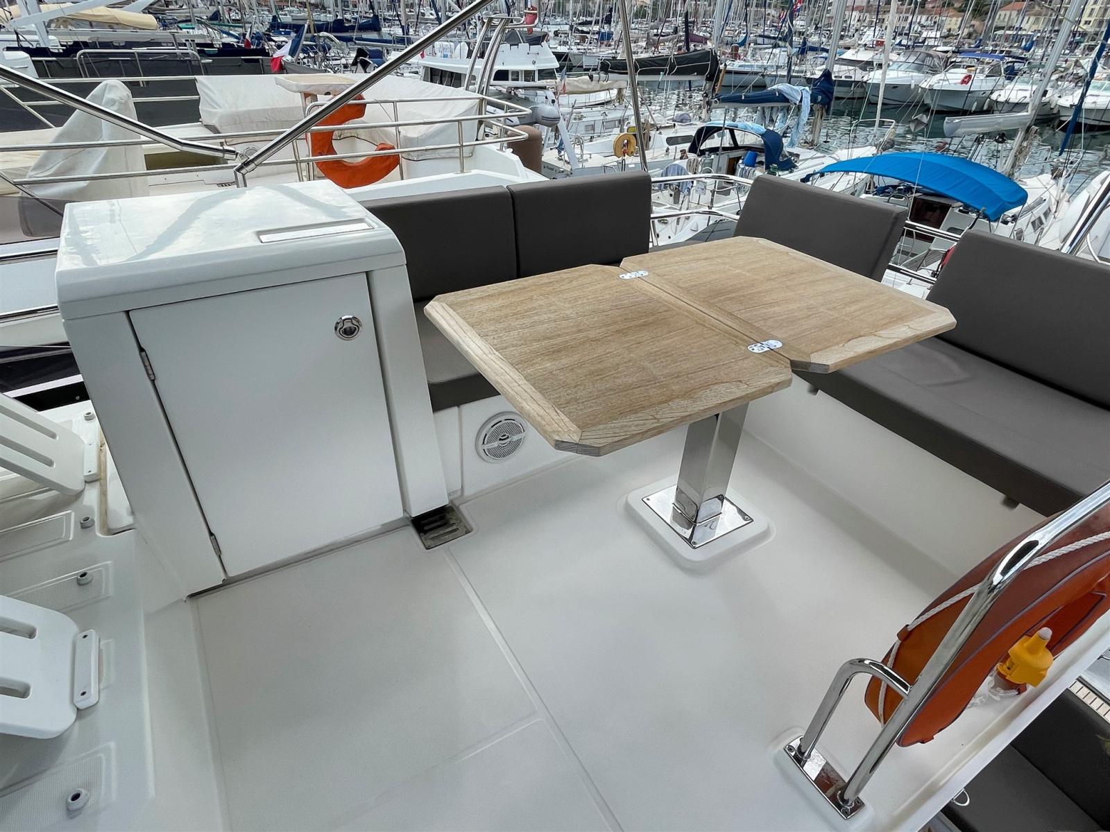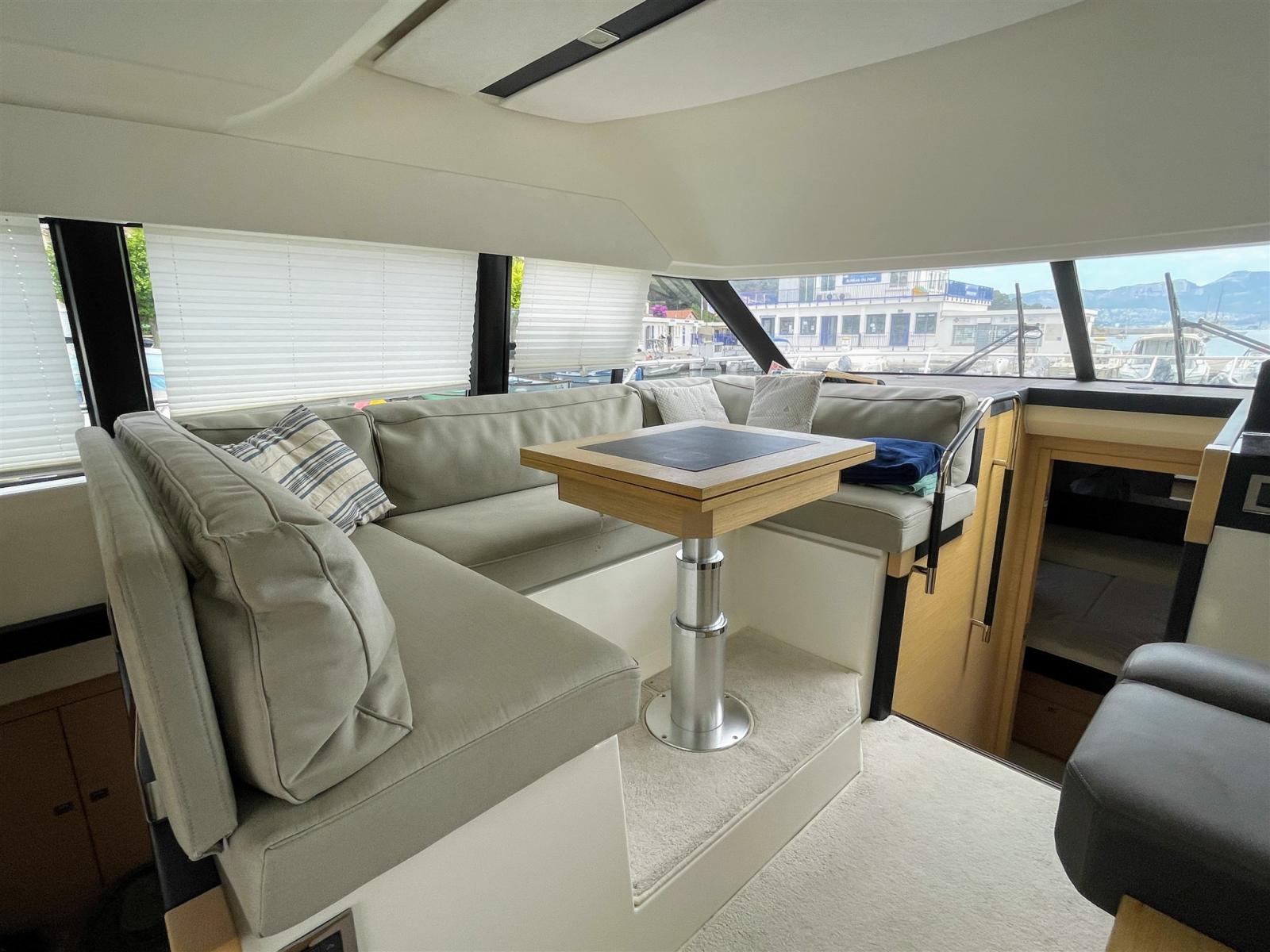 Le fly est très grand pour la catégorie, bain de soleil sur l'avant à côté du poste de pilotage, coin repas et cuisine d'été sur la partie arrière. Bimini top recouvrant tout le fly.