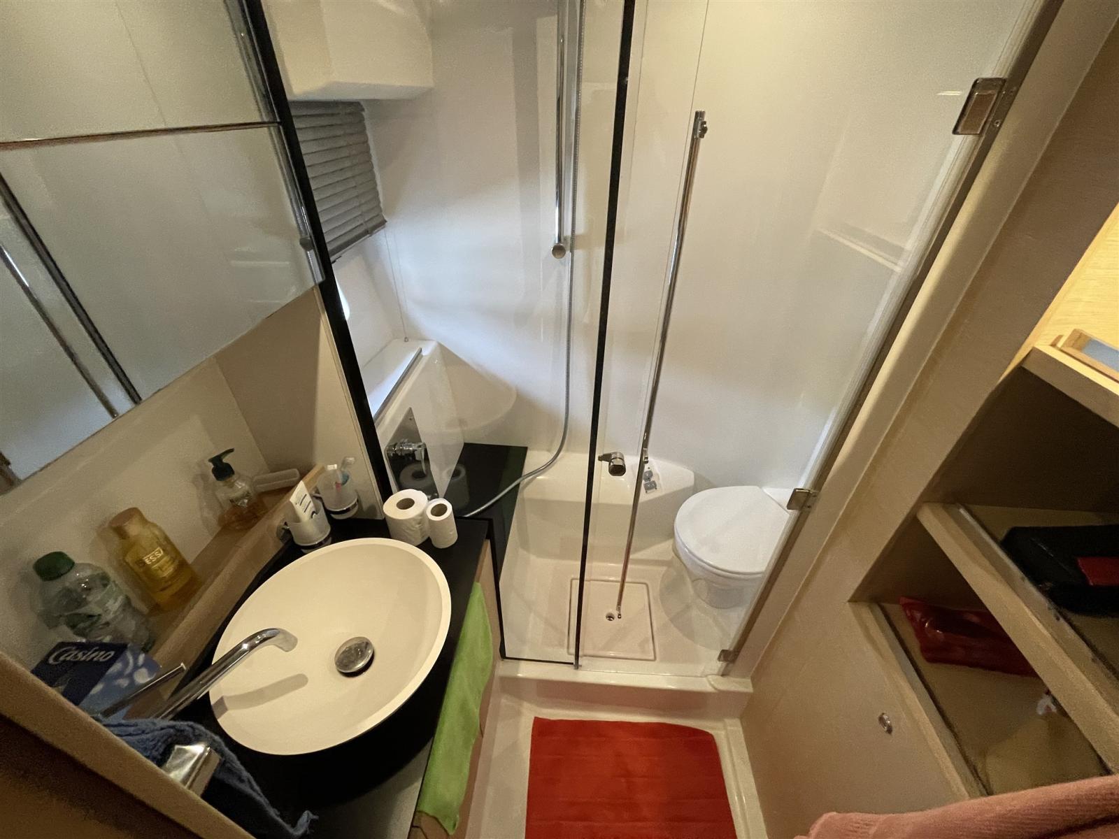 La cabine invité se trouve à l'avant avec un grand lit central, elle dispose également de sa salle d'eau avec WC.