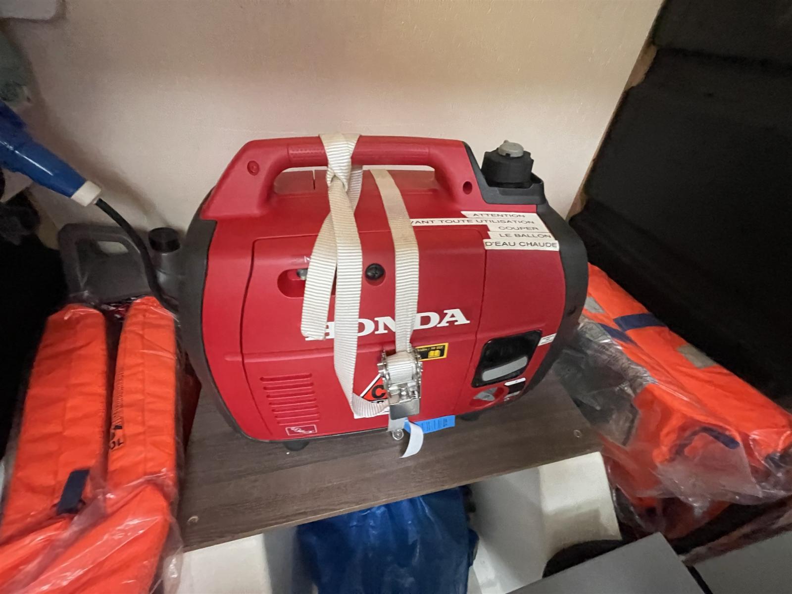 Alarme moteur, Alarme de pompe de cale, 5 Batteries (2 moteurs, 3 service), Douche de cockpit, Extincteur(s) fixe(s), Moteur d'annexe (Suzuki 2,5 CV 4T), Passerelle (hydraulique), Plateforme arrière, Pompe de cale automatique, Cockpit en teck, Prise de quai, Guindeau électrique, Echelle de bain, table de cockpit, Annexe (3 D Tender 2,5m).