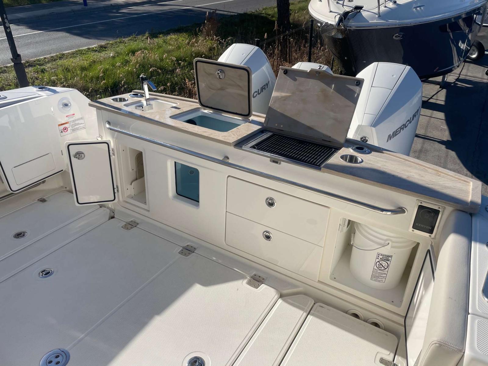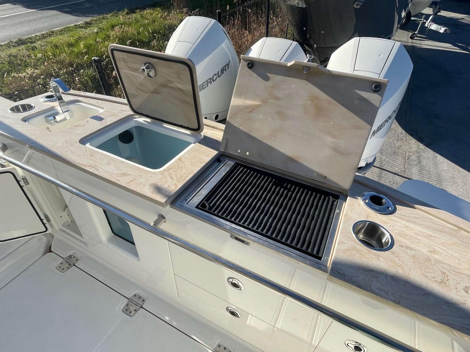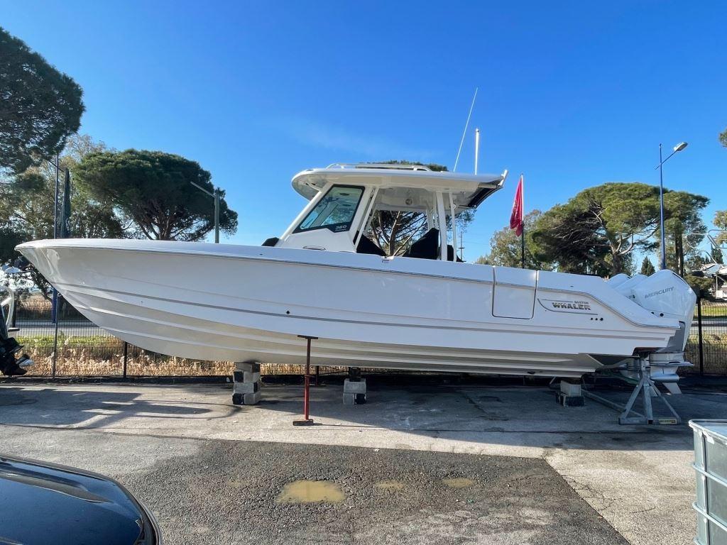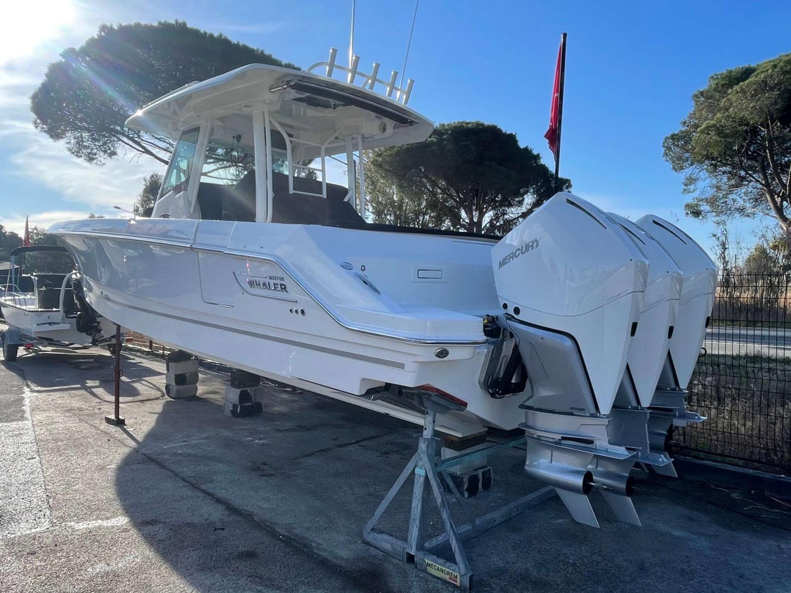 Motorisation : MERCURY VERADO V8, 3 x 300 cv avec joystick JPO ( inclus pilote automatique et ancre virtuelle ). Moins de 100 heures de marche.