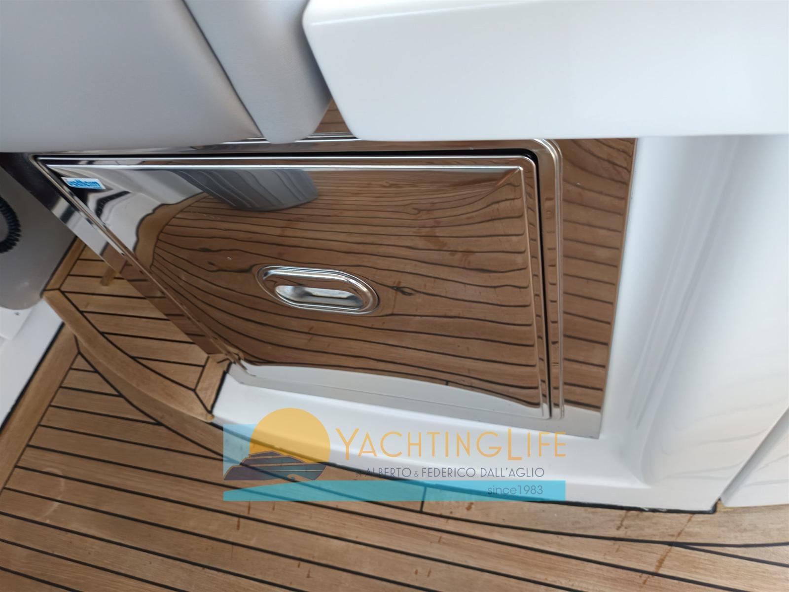 Alarme moteur, Ouverture du compartiment moteur électrique, Eau sous pression, Batteries (2025), Douche de cockpit, Flaps hydrauliques, Hard top (Soft Top), Extincteur(s) fixe(s), Indicateurs de flaps, Lavabo dans le cockpit, Éclairage de courtoisie, Passerelle (idraulica), Plateforme arrière, Pompe de cale automatique, Pompe de cale manuelle, Porte latérale, Cockpit en teck, Prise de quai, Onduleur, Guindeau électrique, Echelle de bain, table de cockpit (Nuovo 2025), Annexe, Corne, Winch électrique arrière.