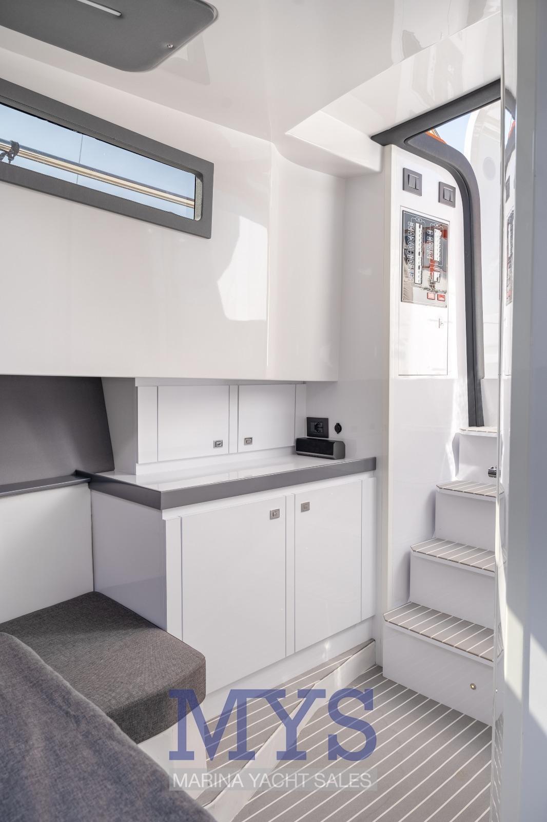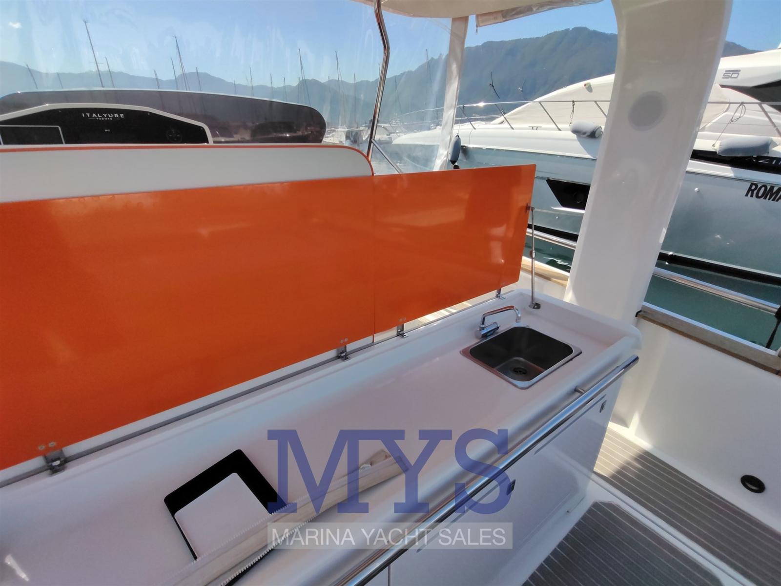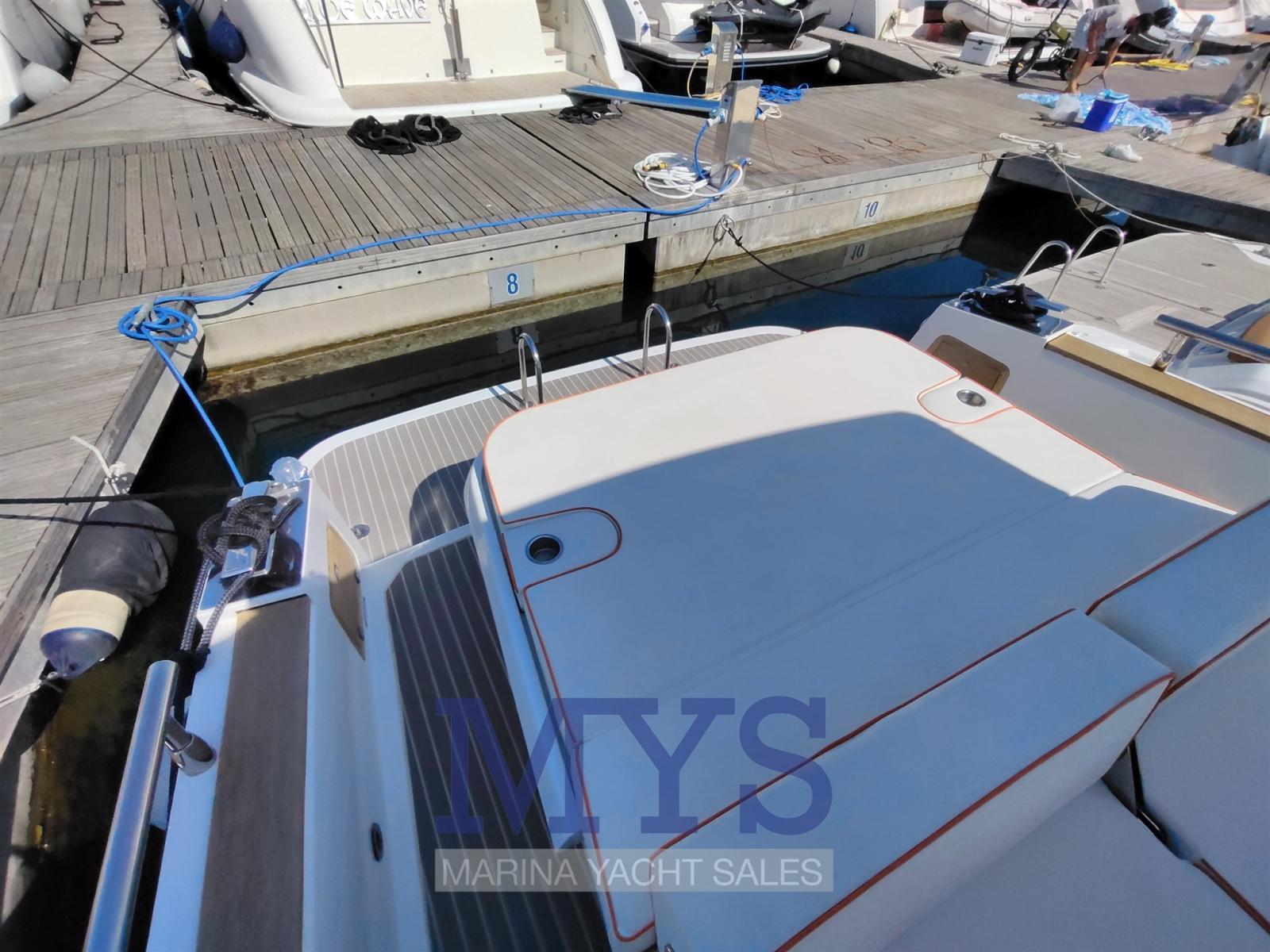 Alarme moteur, Alarme de pompe de cale, Alternateur, Ouverture du compartiment moteur électrique, Eau sous pression, Câble d’alimentation à quai, Douche de cockpit (anche a prua), Flaps électriques, Extincteur(s) fixe(s), Lavabo dans le cockpit, Éclairage de courtoisie, Spots sous-marins, Pompe de cale automatique, Porte latérale, Cockpit en teck (sintetico), Prise de quai, Guindeau électrique, table de cockpit, Corne, T-Top.