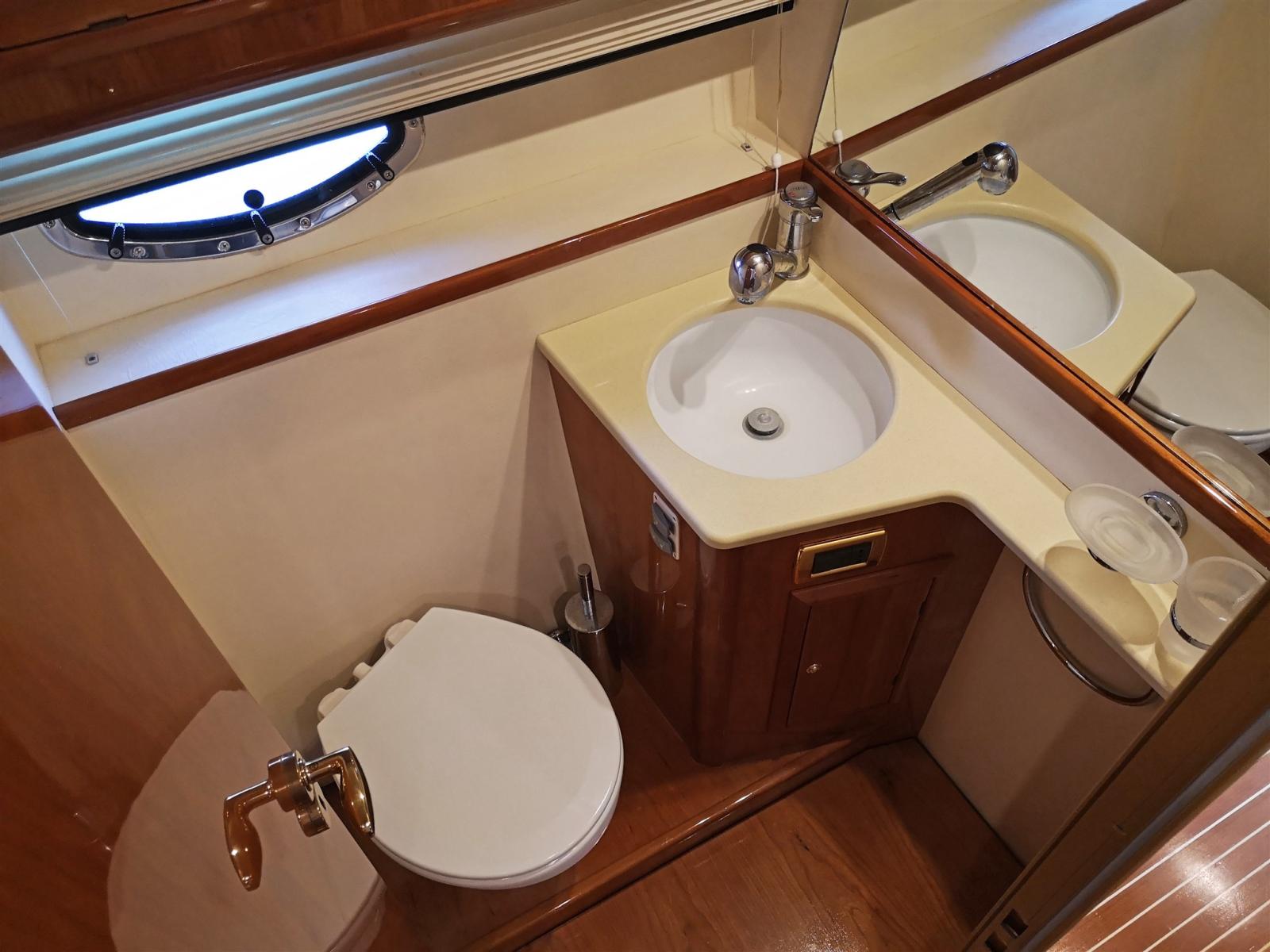 Cabine propriétaire à l’avant avec lit double et salle de bain privée avec lavabo, toilettes électriques et cabine de douche séparée